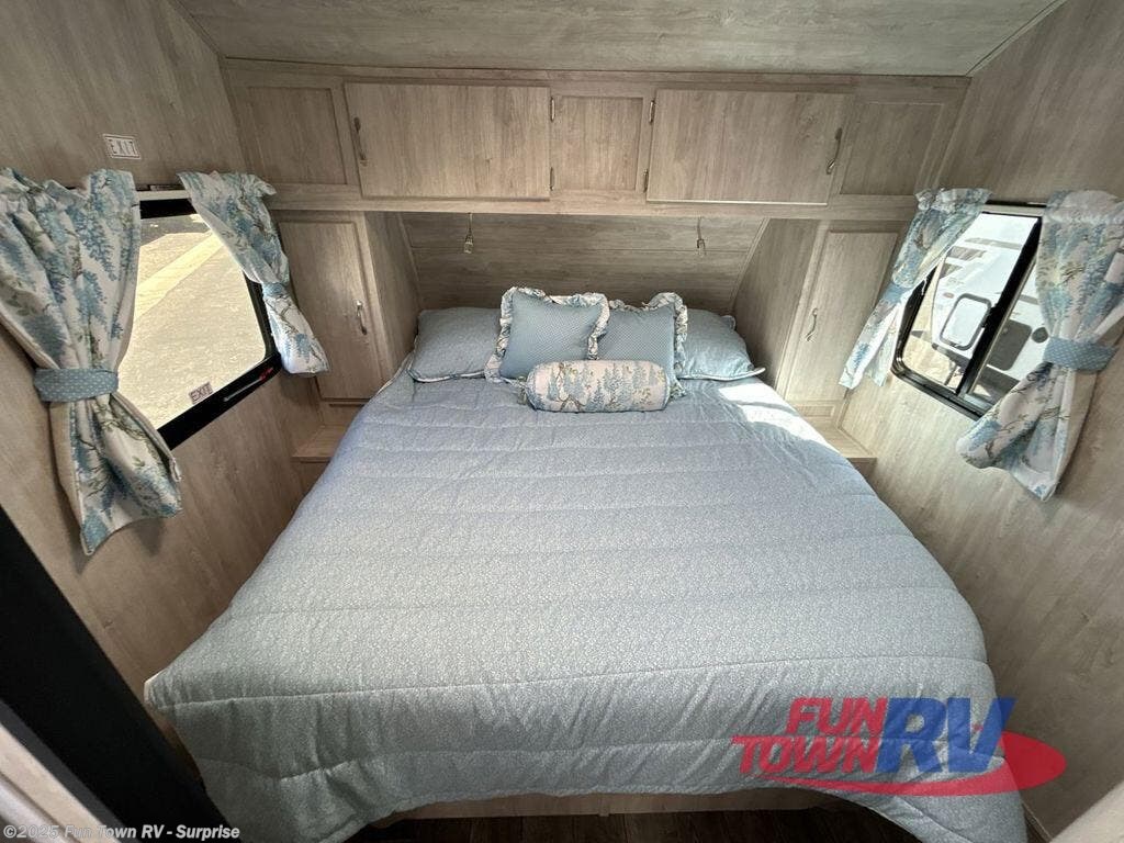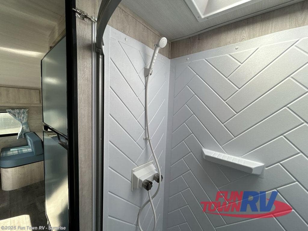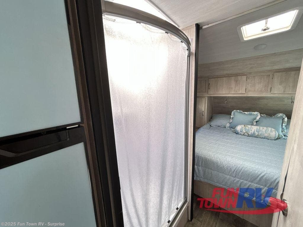 Step into comfort with this classic travel trailer in tow. You will find a rear vintage booth dinette and a sofa slide out with end tables to set your drinks on. The kitchen is complete with a microwave oven, cooktop, plus overhead cabinets for your belongings. After a day outdoors, you can clean up in the 24" x 36" shower, and there is a private toilet and sink across the hall if someone needs to use it while you're cleaning up. This model will feel just like home with its RV queen bed and dual shirt closets for your clothes.
