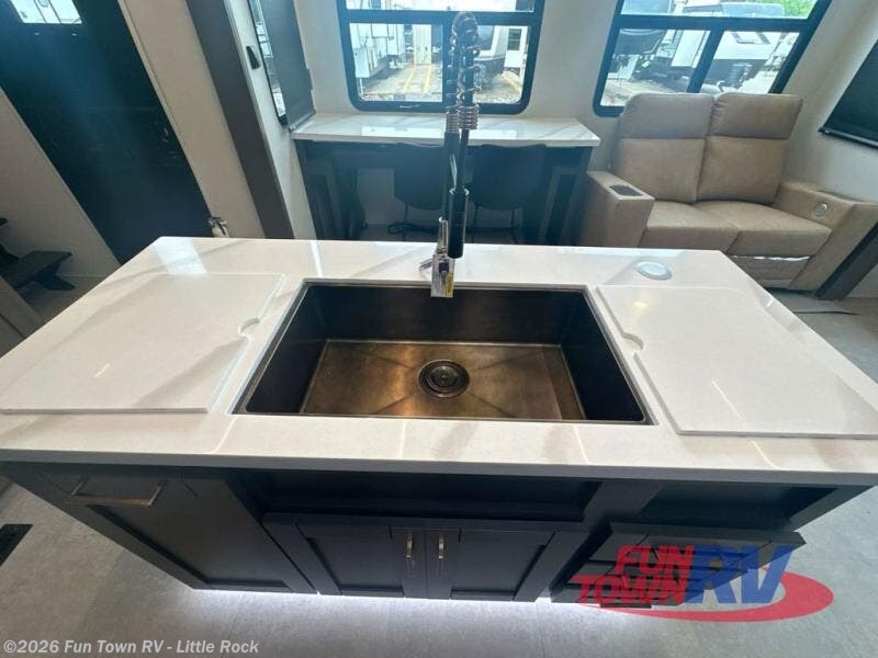This fifth wheel is perfect for you and your partner. The rear living room is the perfect place to unwind, featuring a plush sofa, theater seating, and a swing desk for working or playing. The culinary dream kitchen has a hidden pantry, overhead cabinet, 3-burner cooktop, 12V refrigerator, kitchen island, and pantry for all your favorite snacks. The full bathroom is fitted with everything you need to freshen up, and the front bedroom is a spacious place so you can comfortably rest and sleep, equipped with a king bed, washer and dryer prep, closet, and overhead cabinets for all your belongings. But the real excitement begins when you step outside, where you'll find not one, but two awnings, perfect for relaxing in the shade. Whether you're a seasoned RVer or just starting, our fifth wheel has everything you need to experience the ultimate in luxury living on wheels.