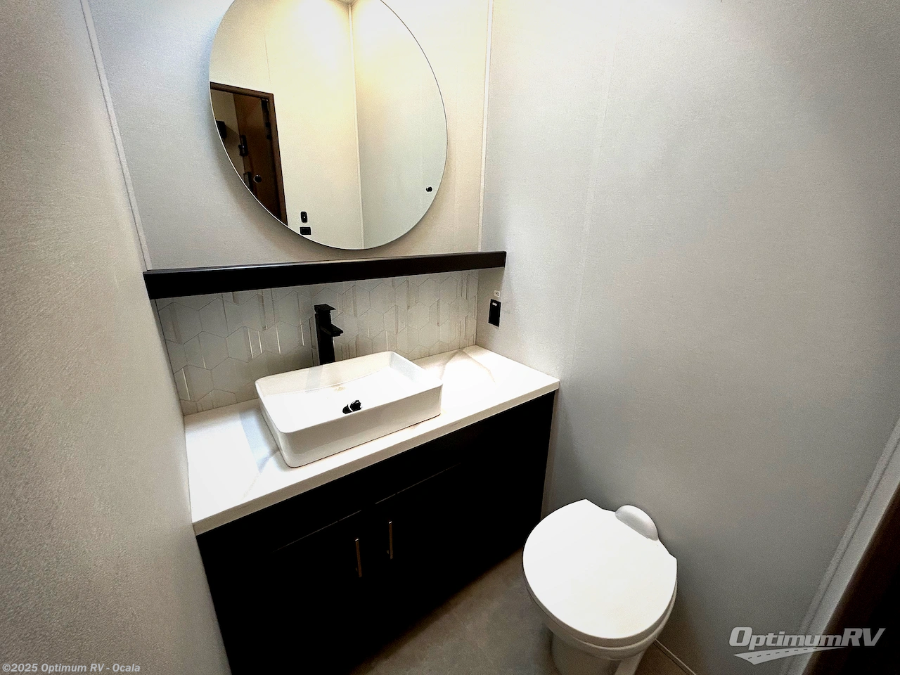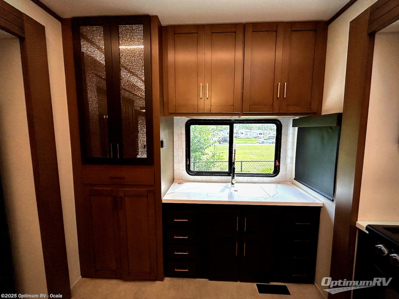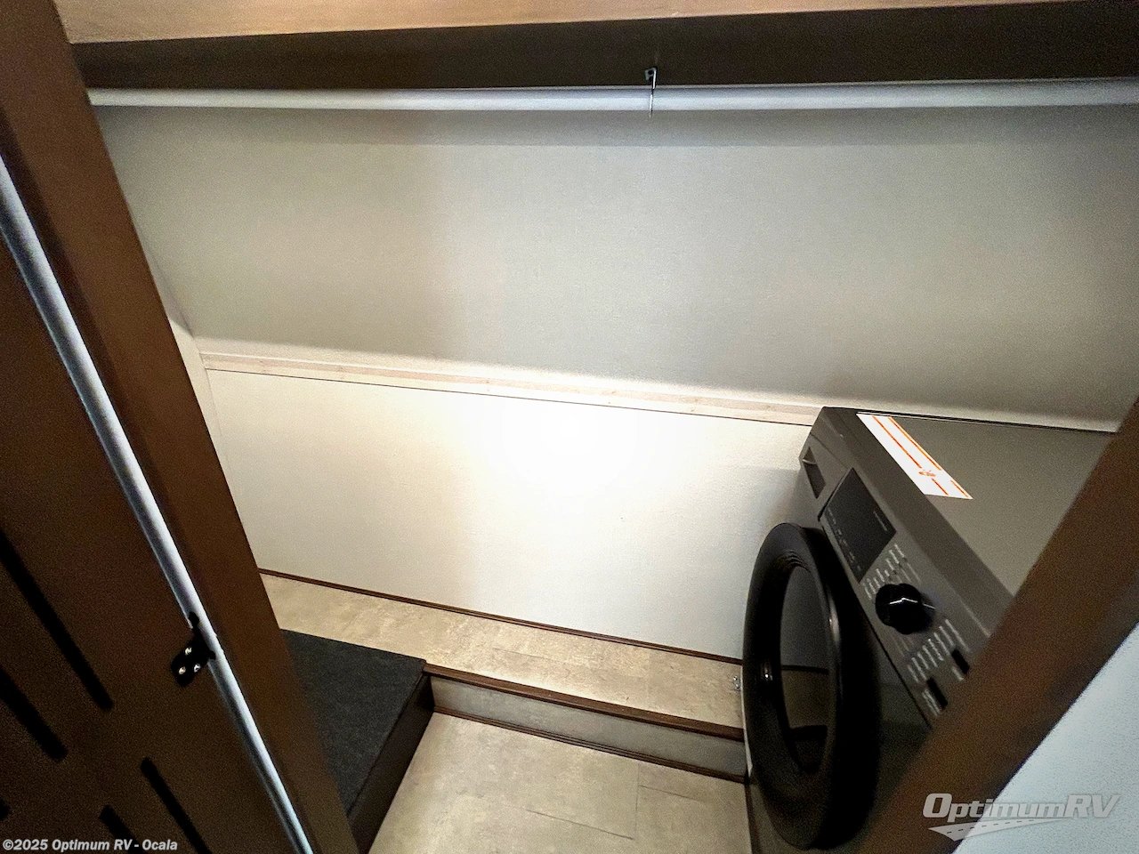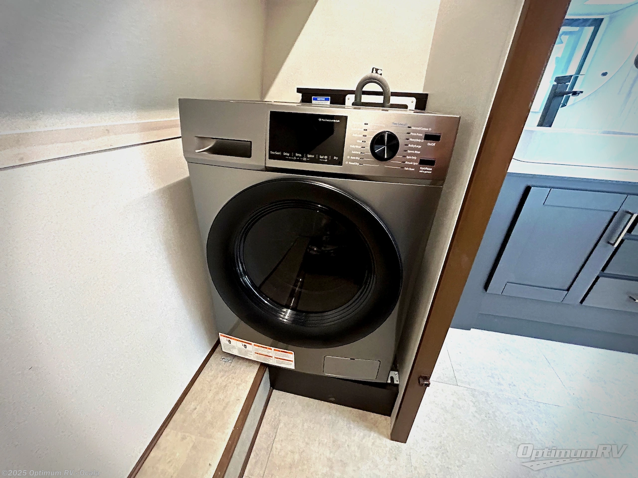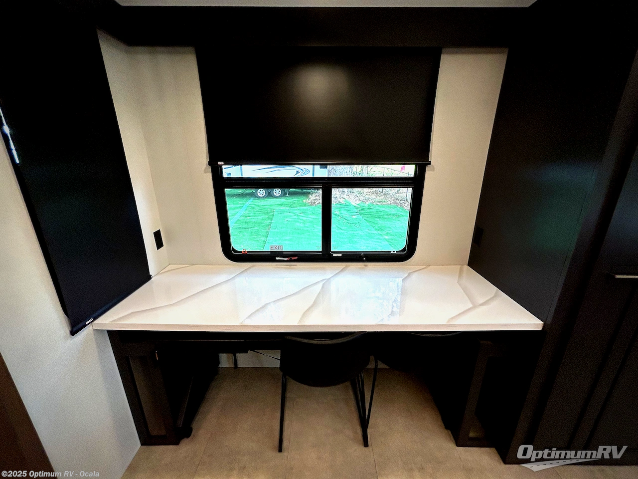 Cook like a chef in the spacious rear kitchen of this luxurious fifth wheel, equipped with overhead cabinets, a pantry, a 12V refrigerator, along with a microwave, and a table with stools for casual dining with family and friends. The living room is the perfect place to relax and entertain yourself, featuring a swing desk for working or playing, an L-shaped sofa for lounging, an entertainment center with a fireplace for cozy nights in, and a convenient half bathroom, ideal for guests. The bedroom is incredibly comfortable, featuring a king bed, a dual dresser for ample storage, and a comfy bench for relaxing. The front bathroom is a spacious oasis, complete with a dual sink, linen closet, walk-in closet, and washer and dryer prep for added convenience. Finally, step outside and enjoy the fresh air under our massive 16’ awning, perfect for relaxing and enjoying the exterior view.