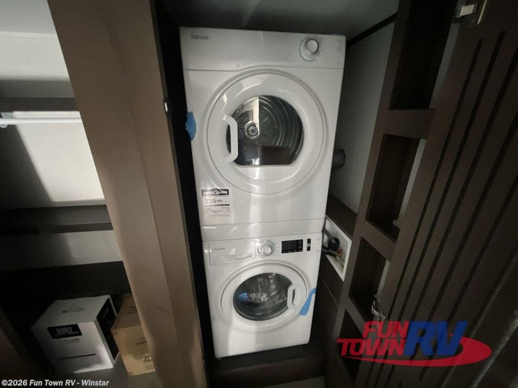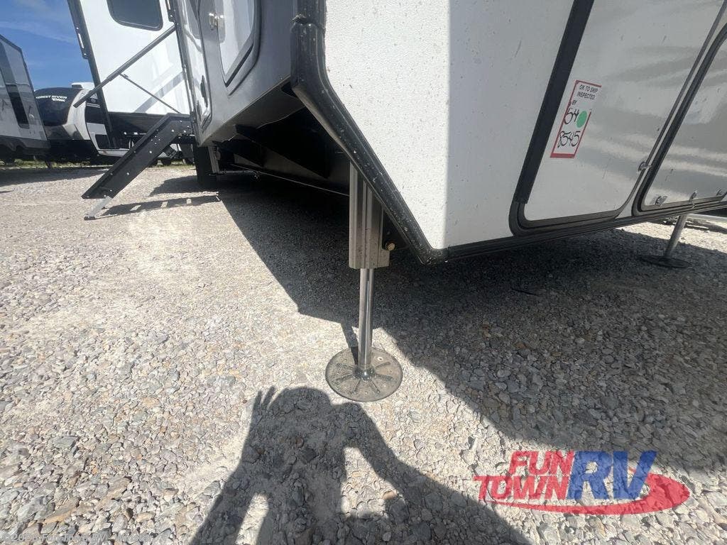 This fifth wheel is perfect for all family members! The full rear bathroom is perfect for getting ready for the day. The bedroom is ideal for two people since they would easily fit in the queen bed, also comes with a dresser, and TV for relaxing. Above the bedroom, a loft area with overhead cabinets provides additional storage and a cozy nook. The kitchen/living area is the heart of the home, equipped with a sofa, entertainment center, fireplace, microwave, kitchen island, refrigerator, and pantry. Perfect for cooking up a storm or relaxing with family and friends. A second full bathroom is a spacious oasis and provides added convenience, while the front bedroom is a luxurious retreat, featuring a king bed, ample closet, and washer and dryer prep. Finally, you and your family and friends can enjoy nature and have fun under the shade of the 16’ awning.