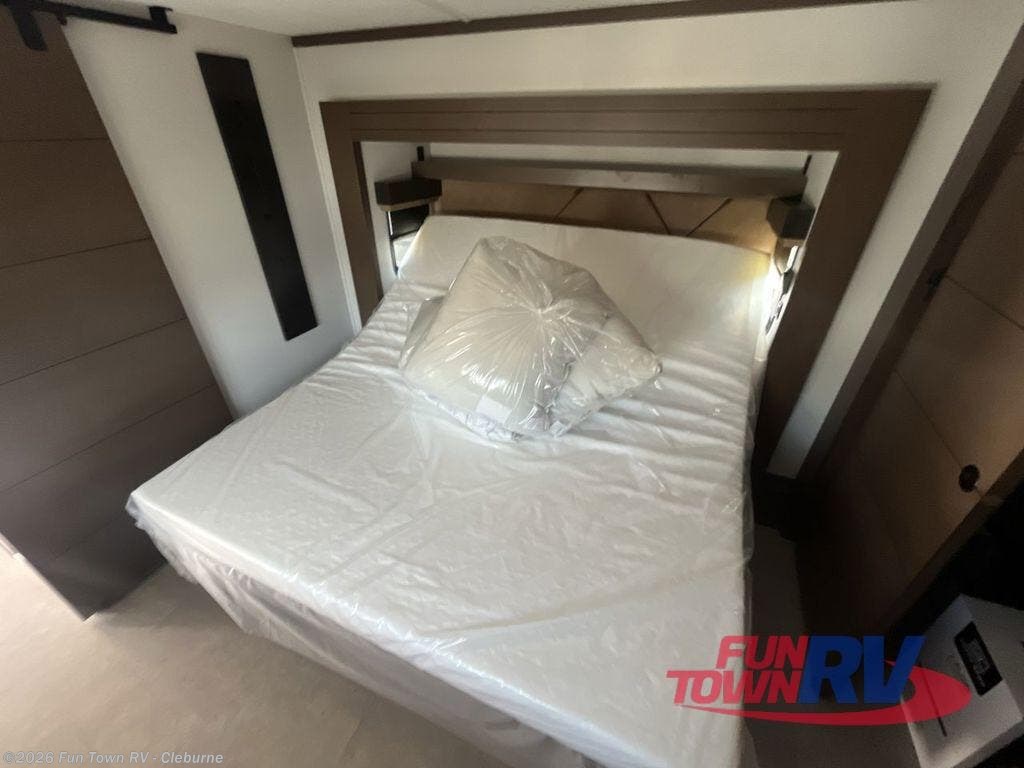 This fifth wheel is perfect for all family members! The full rear bathroom is perfect for getting ready for the day. The bedroom is ideal for two people since they would easily fit in the queen bed, also comes with a dresser, and TV for relaxing. Above the bedroom, a loft area with overhead cabinets provides additional storage and a cozy nook. The kitchen/living area is the heart of the home, equipped with a sofa, entertainment center, fireplace, microwave, kitchen island, refrigerator, and pantry. Perfect for cooking up a storm or relaxing with family and friends. A second full bathroom is a spacious oasis and provides added convenience, while the front bedroom is a luxurious retreat, featuring a king bed, ample closet, and washer and dryer prep. Finally, you and your family and friends can enjoy nature and have fun under the shade of the 16’ awning.