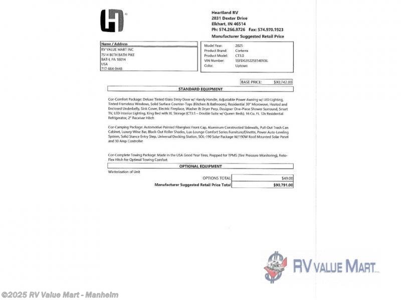 Request More Info on this 2025 Heartland Corterra CT3.0 Offered for sale by RV Value Mart - Manheim