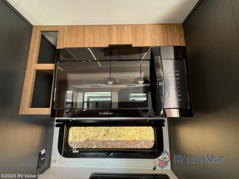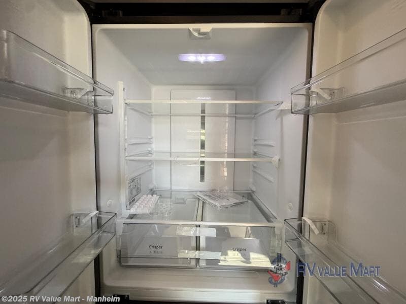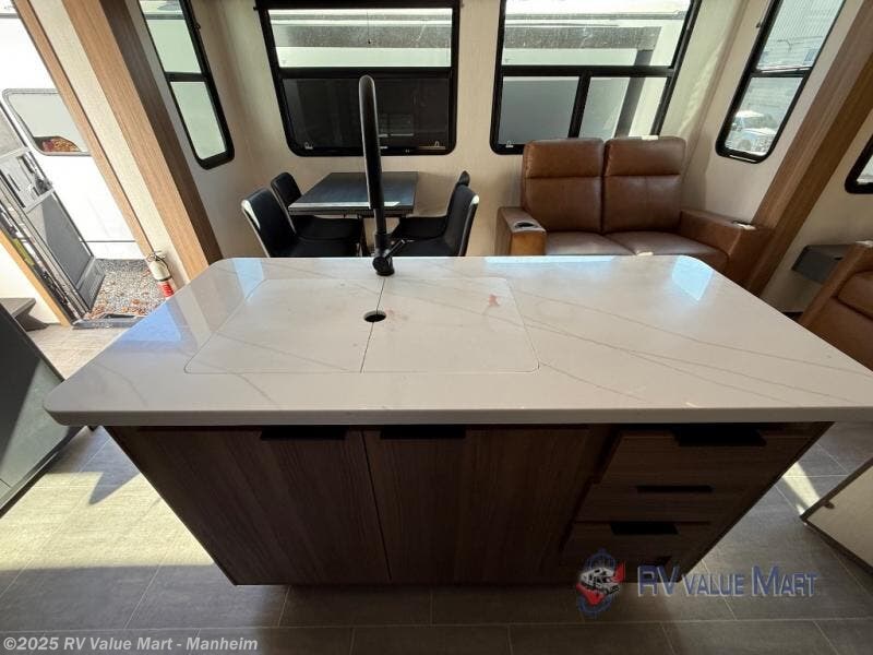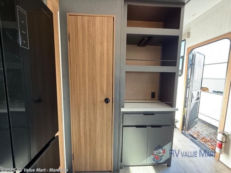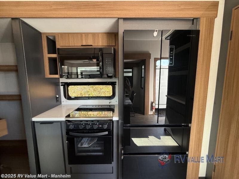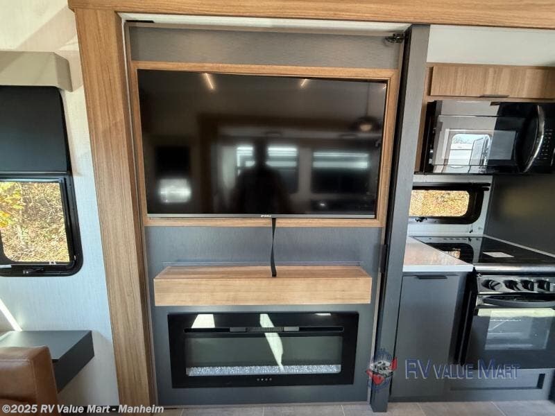 You won't even feel like you're camping in this fifth wheel! The front master suite has a 72" x 80" king bed slide across from a dresser, plus there is a front dresser with wardrobes on either side and even an entrance into the dual entry bathroom. The bathroom has a shower to freshen up in each morning and a lighted mirror to make it easier for seeing as you get ready, and you even have a closet that is prepped for a washer and dryer to be added. The chef will have a great time preparing their best meals in the kitchen with the kitchen island, 16 cu. ft. refrigerator big enough for their favorite ingredients, a 22" oven to cook fresh cinnamon rolls, and a 30" over the range microwave to pop a bag of popcorn on movie night. Relax in true comfort in the rear living area on the residential furniture with hidden cup holders and USB charging ports by the electric fireplace and 55" Smart TV with hidden storage!