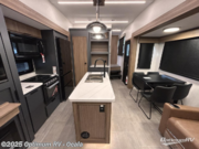 You won't even feel like you're camping in this fifth wheel! The front master suite has a 72" x 80" king bed slide across from a dresser and next to an area prepped for a washer and dryer, plus there is a front dresser with wardrobes on either side and even an entrance into the dual entry bathroom. The bathroom has a radius shower to freshen up in each morning and a lighted mirror to make it easier for seeing as you get ready. The chef will have a great time preparing their best meals in the kitchen with the kitchen island, 16 cu. ft. refrigerator big enough for their favorite ingredients, a 22" oven to cook fresh cinnamon rolls, and a 30" over the range microwave to pop a bag of popcorn on movie night. Relax in true comfort in the rear living area on the residential furniture with hidden cup holders and USB charging ports by the electric fireplace with hidden storage!