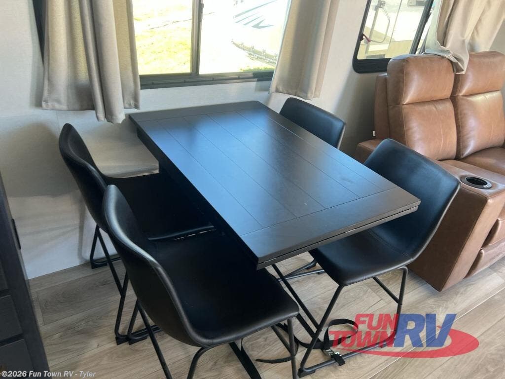 Head to the trails in this spacious toy hauler for eight campers! There is a 13' 6" garage with an electric bed and a split bench seat/bed for guests, plus a half bath and a loft for more sleeping space or storage! You will have your own bedroom up front with a tilting king bed slide out, two wardrobes, and a private entry door into the dual entry full bath. The living room will be a favorite place to visit since there are three sofa in great view of the 50" LCD HDTV, and the free-standing table will provide a place to dine at each day. The chef of your group will have everything they need to prepare meals, including a residential microwave and massive 24" stand-alone oven, or they may just find themselves using the exterior Grill and Go. There is also a 20' awning outside and an exterior TV to watch the big game with campground neighbors!