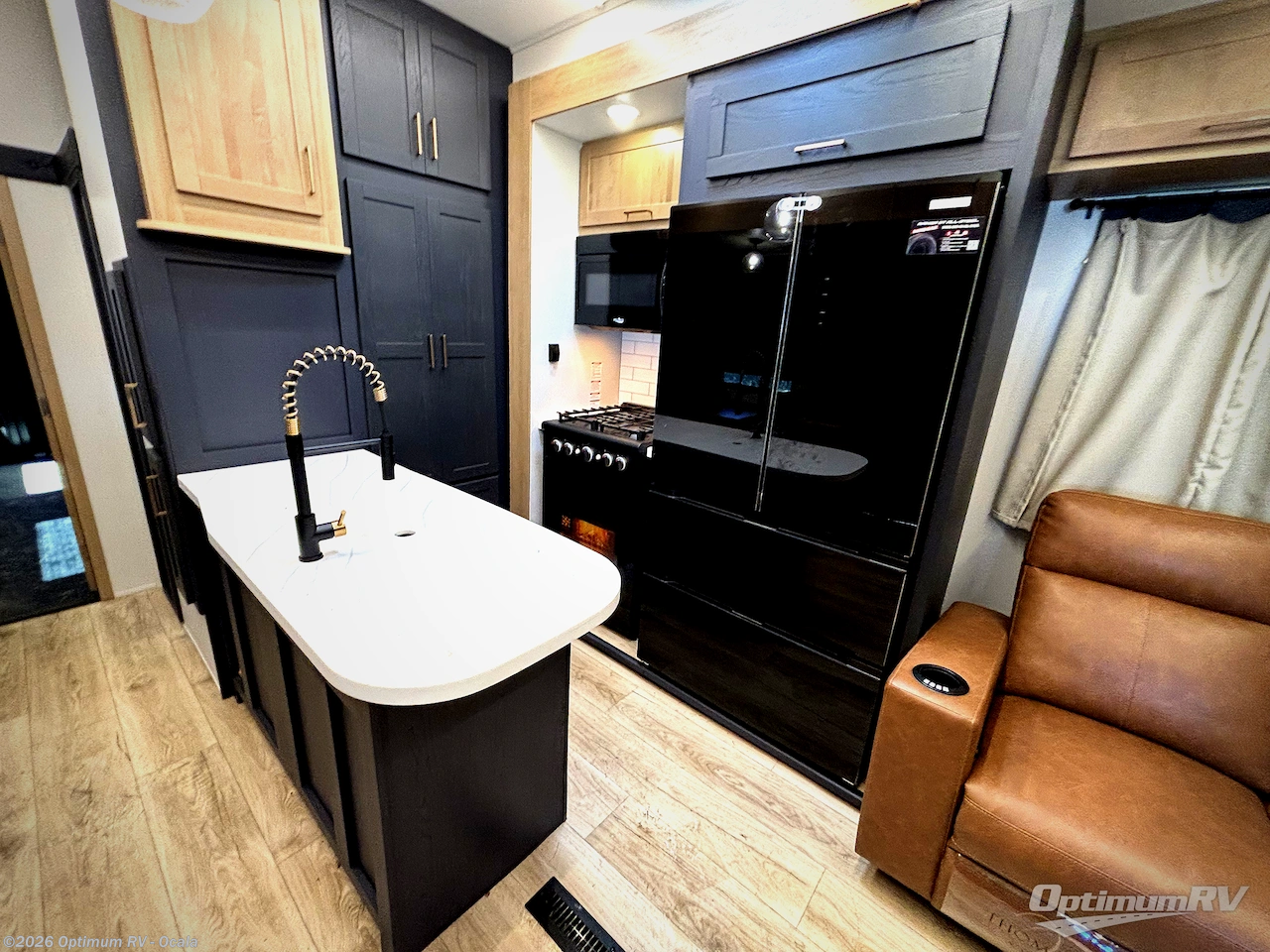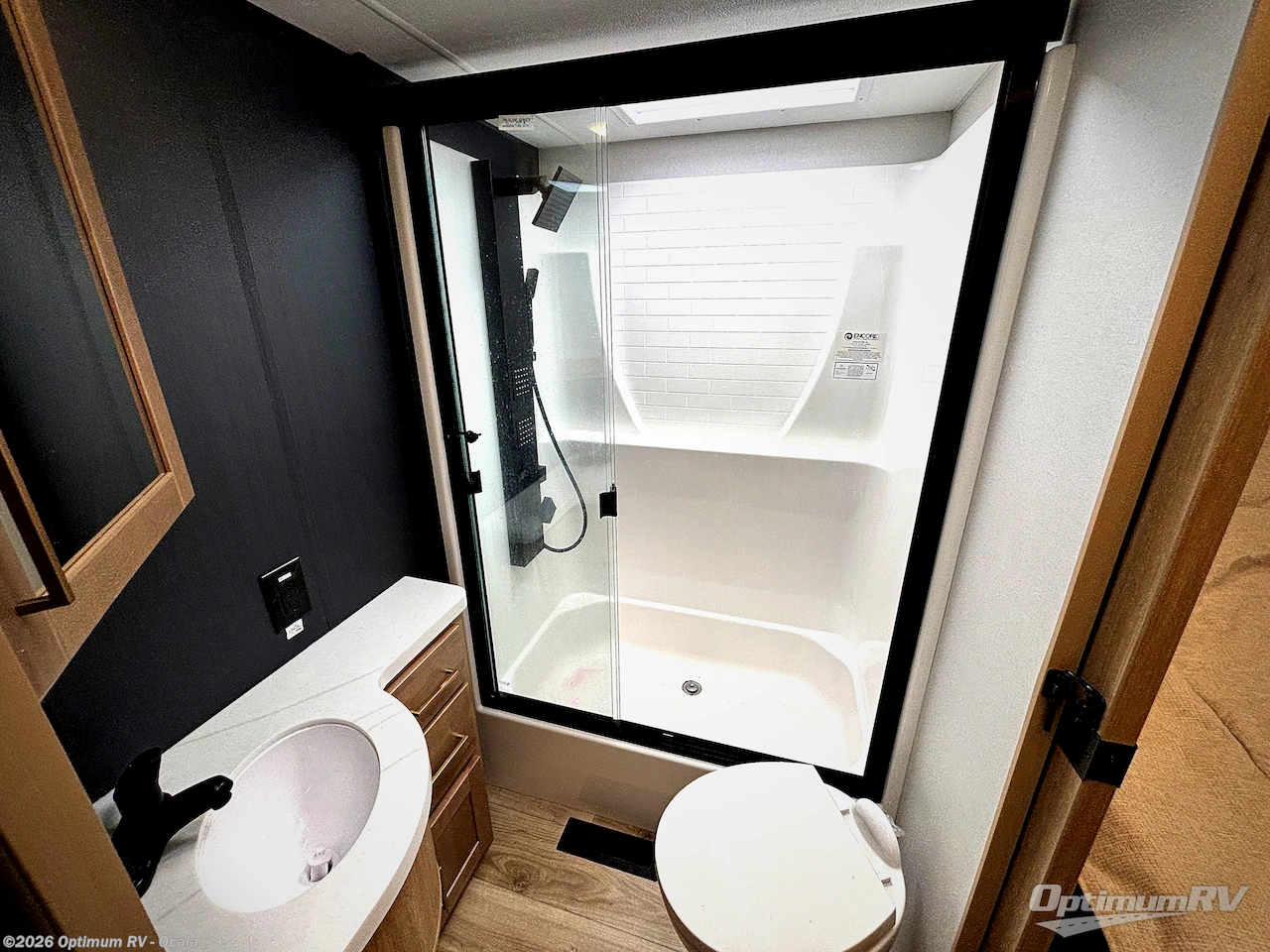 This toy hauler with two full bathrooms is a clean decision! You can prepare delicious home cooked meals for everyone in the fully equipped kitchen with island peninsula for plenty of prepping space, plus there is a hutch to store your dishes. The garage has a bathroom with a neo-angled shower so mud doesn't get tracked throughout the rest of the unit and two loft areas for extra sleeping space. With two awnings, you are sure to stay protected rain or shine and one of the awnings even protects the Grill N Go three burner griddle combo. Enjoy a good night's rest on the tilting king bed slide, keep your clothes looking their best with the front wardrobe, and the washer and dryer prep give you the option to make laundry day easier than ever. You will also have quick access into the dual entry bath!