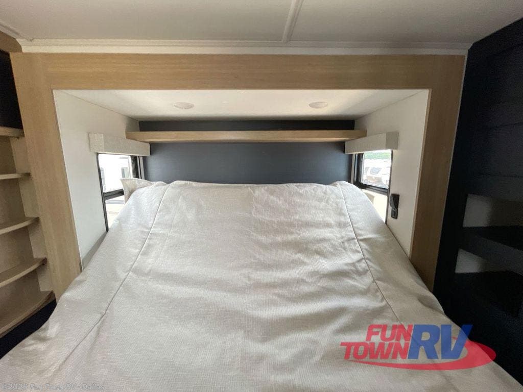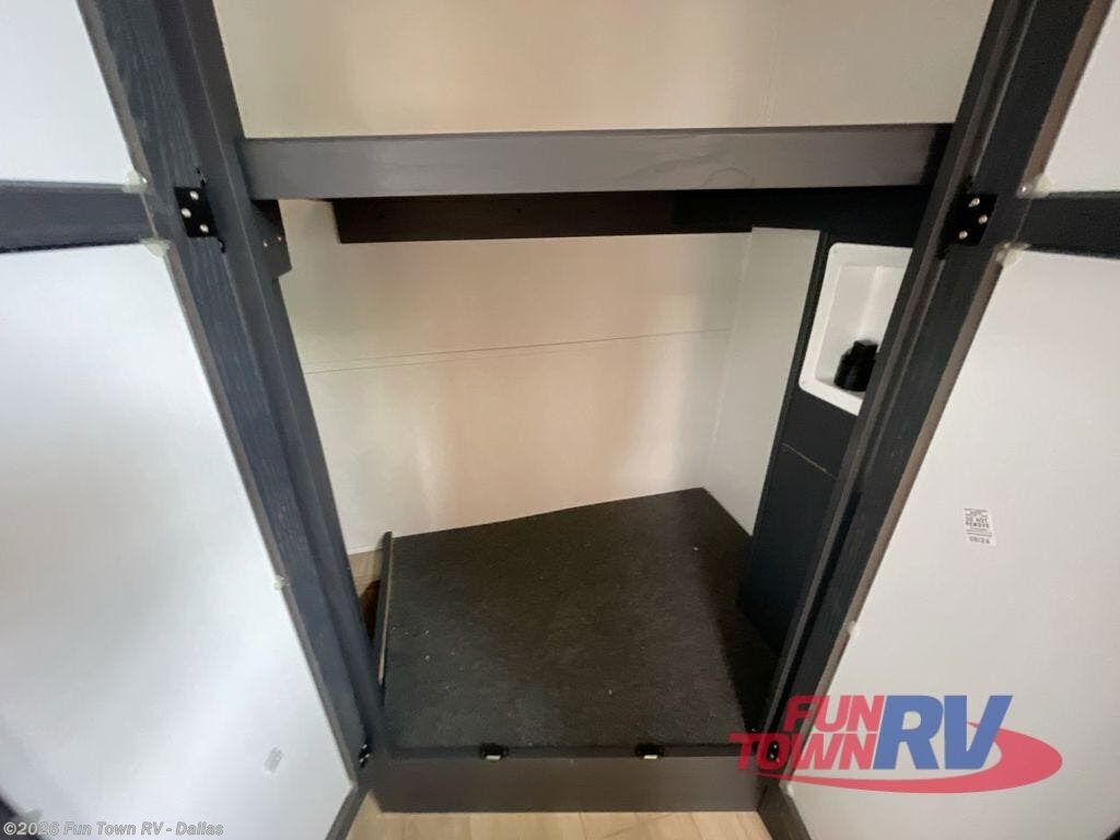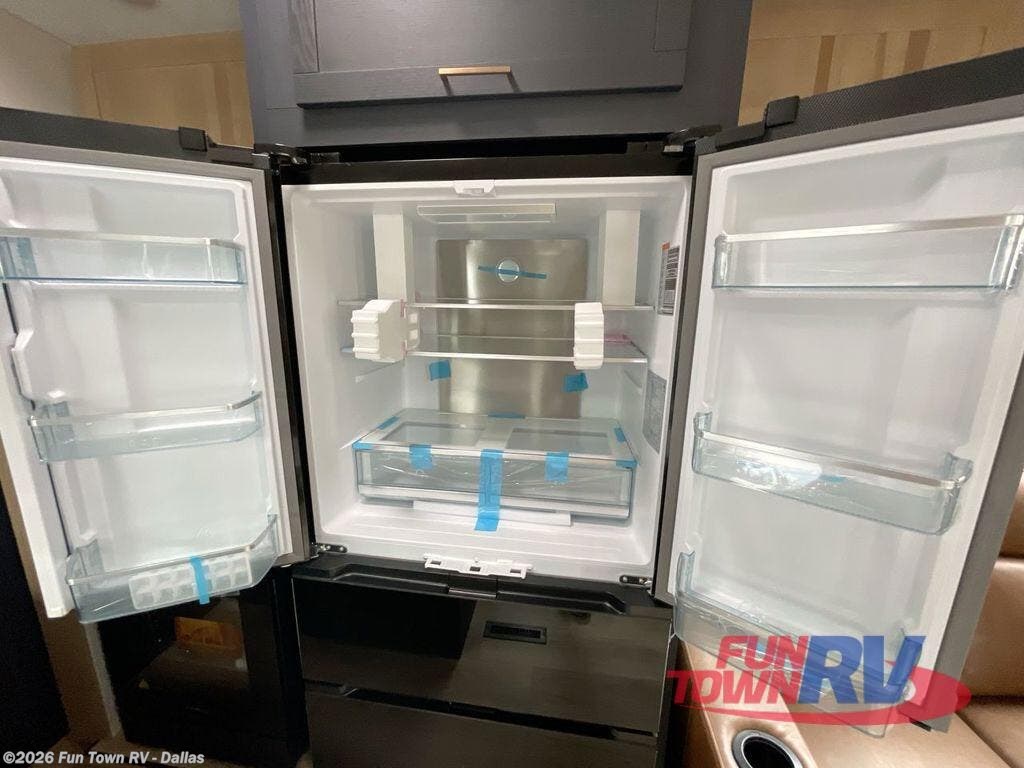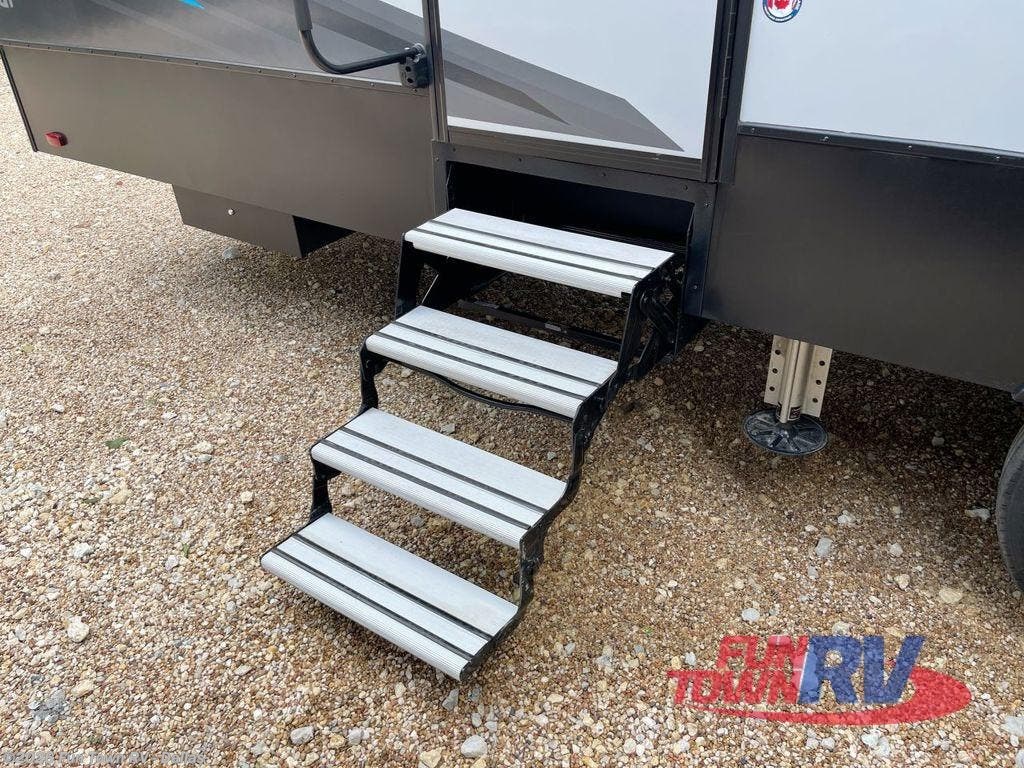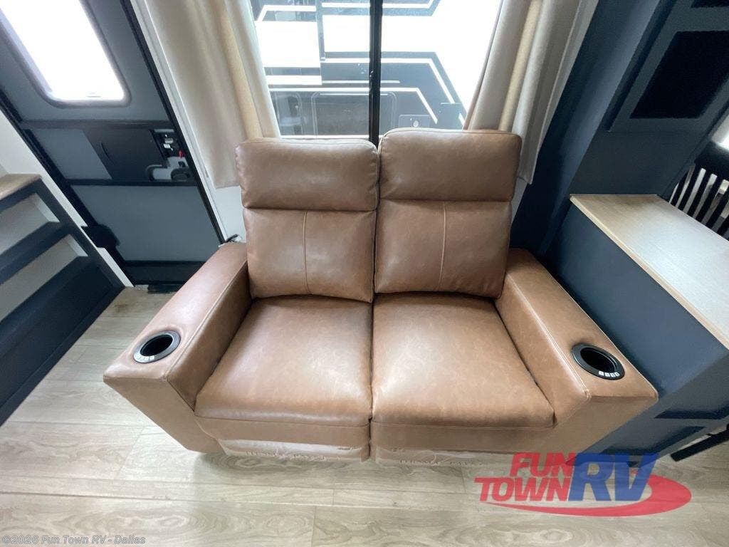 This toy hauler with two full bathrooms is a clean decision! You can prepare delicious home cooked meals for everyone in the fully equipped kitchen with island peninsula for plenty of prepping space, plus there is a hutch to store your dishes. The garage has a bathroom with a neo-angled shower so mud doesn't get tracked throughout the rest of the unit and two loft areas for extra sleeping space. With two awnings, you are sure to stay protected rain or shine and one of the awnings even protects the Grill N Go three burner griddle combo. Enjoy a good night's rest on the tilting king bed slide, keep your clothes looking their best with the front wardrobe, and the washer and dryer prep give you the option to make laundry day easier than ever. You will also have quick access into the dual entry bath!