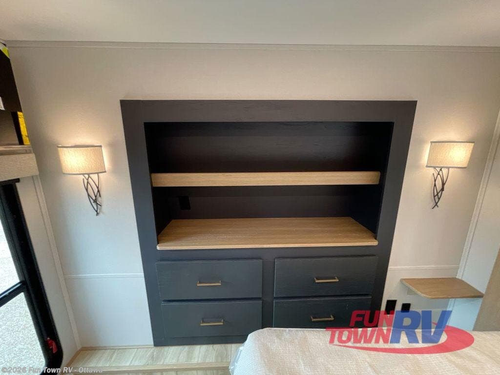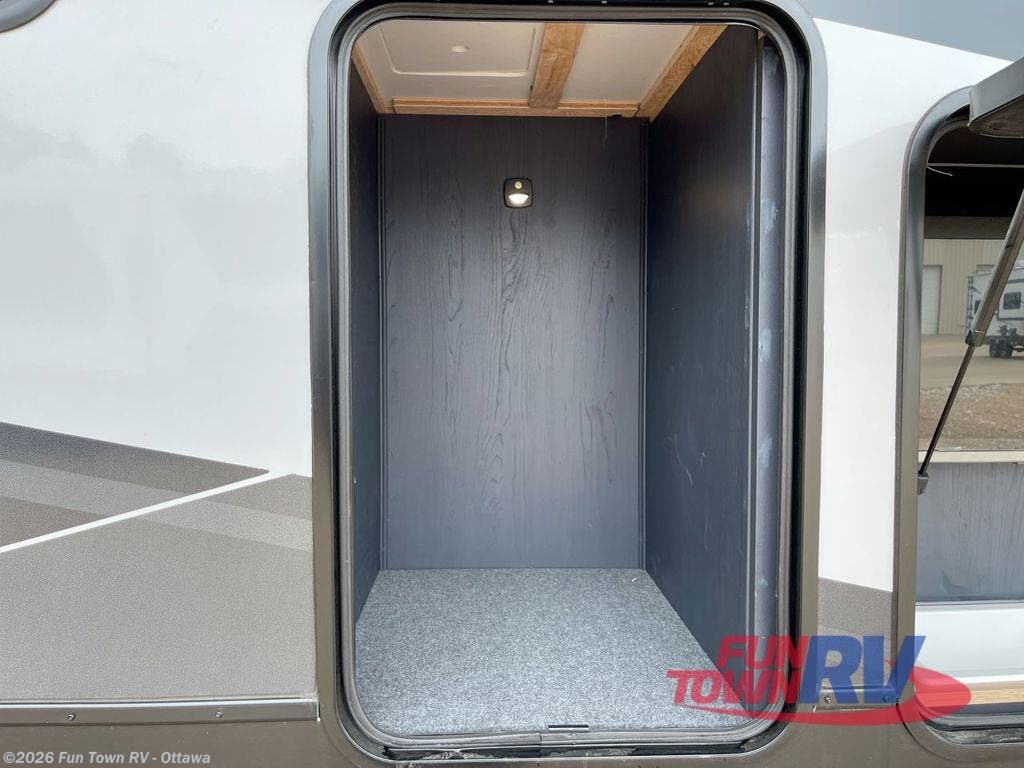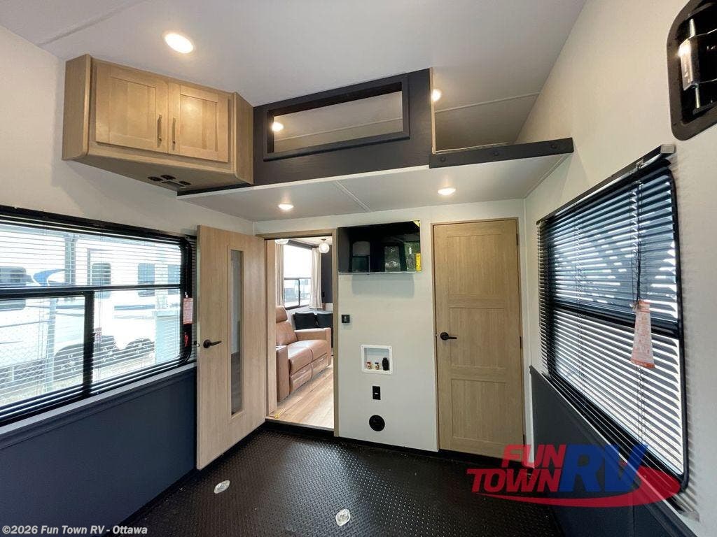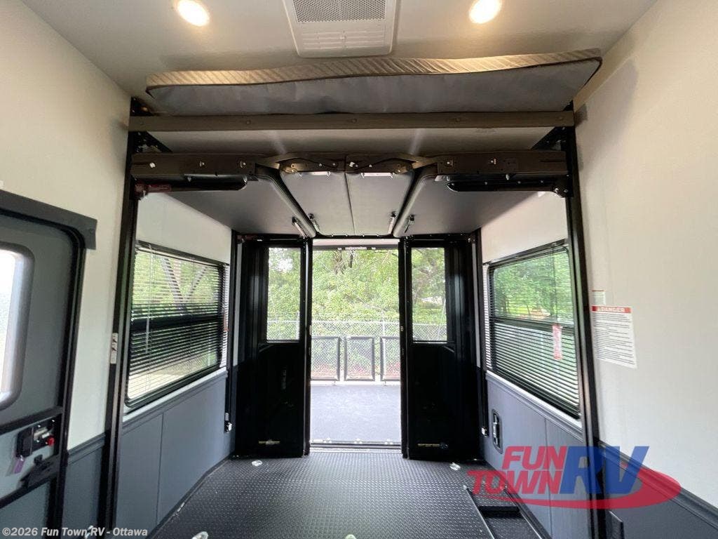 This toy hauler with a 15' separate garage is sure to meet all your needs! Once your toys are unloaded, you can set up the split bench seat/bed or let your guests take a rest on the electric queen bed above this area. There is also a loft here for additional sleeping or storage space plus a half bath for added convenience. The combined kitchen and living area includes a large slide out, two sofas and a free-standing table with chairs and a bench on one side. The U-shaped kitchen will let you whip up your best meals, or you can take your prep outdoors to cook on the outside kitchen. There is also a mini refrigerator here and a Grill N Go pull-out three burner griddle/grill combo. The full dual entry bath will create a front master bedroom, complete with a tilting king bed slide out and a wardrobe slide out for maximum space!