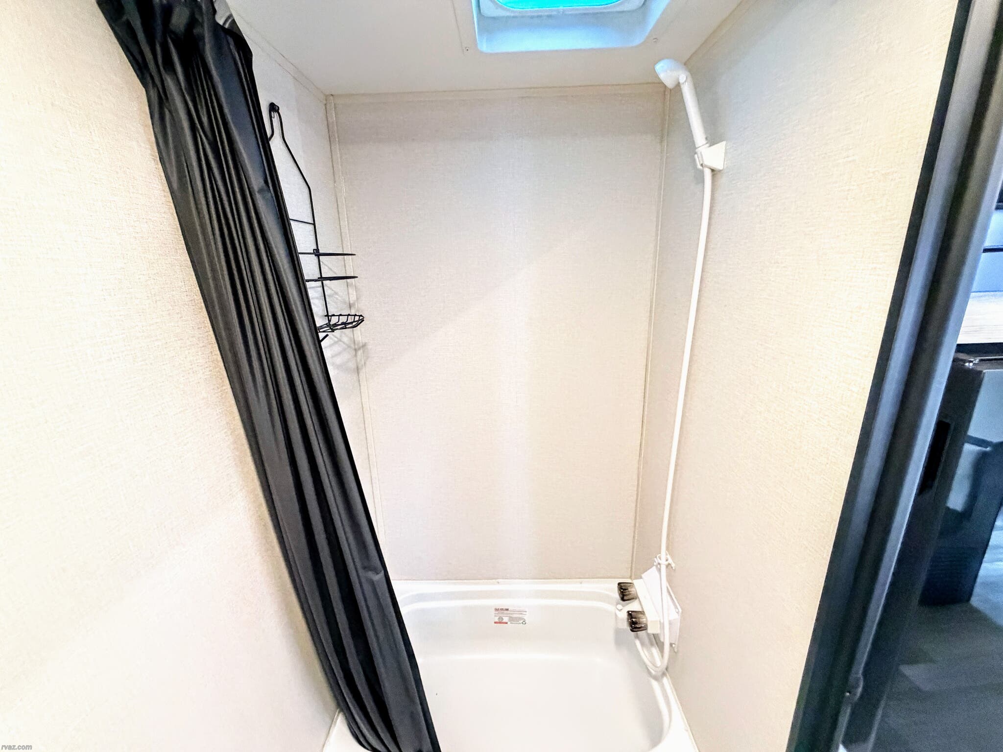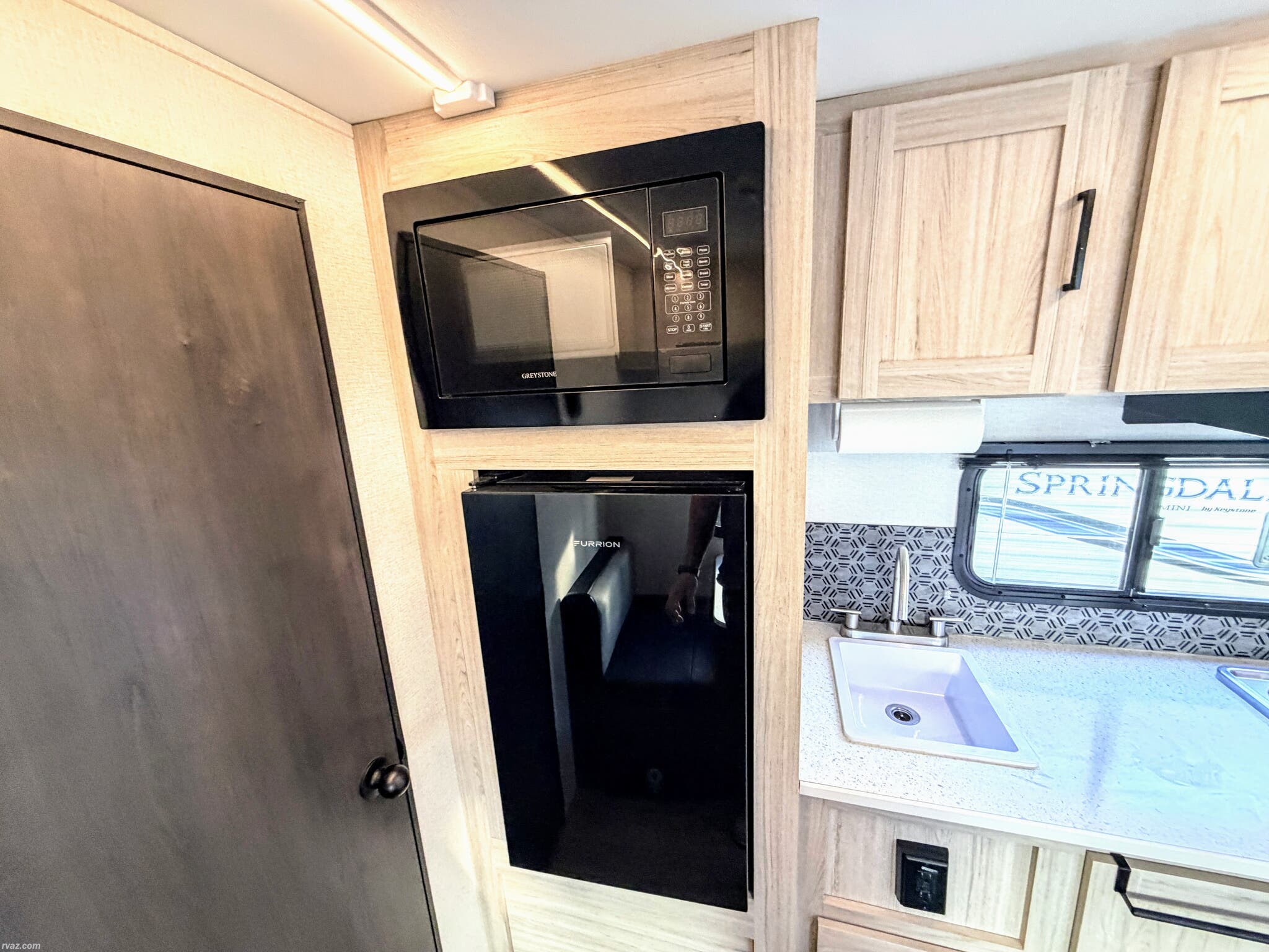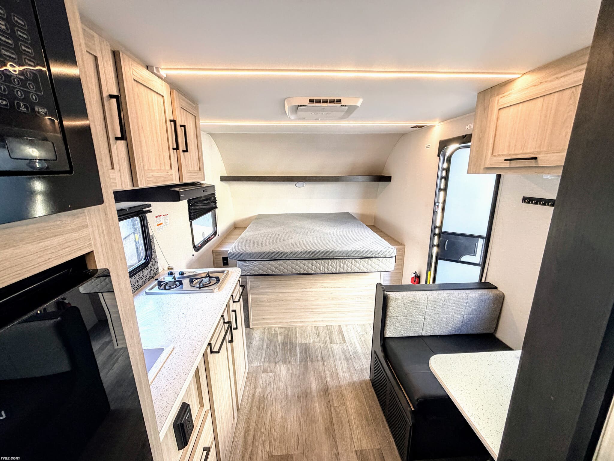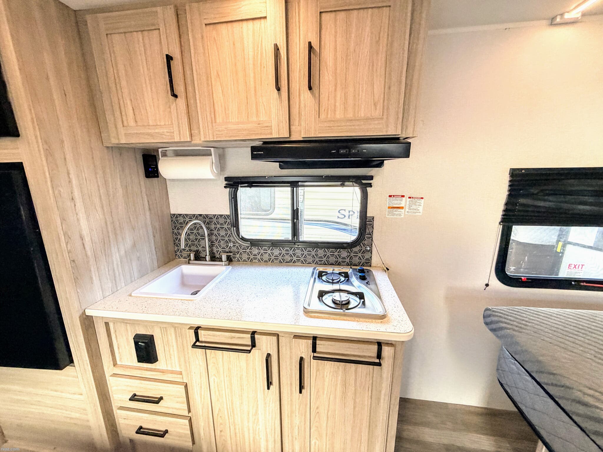 Modern kitchen with 2-burner cooktop, microwave & 12V fridge