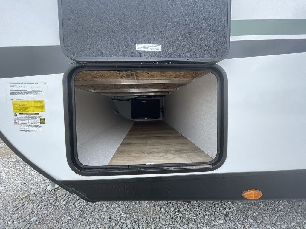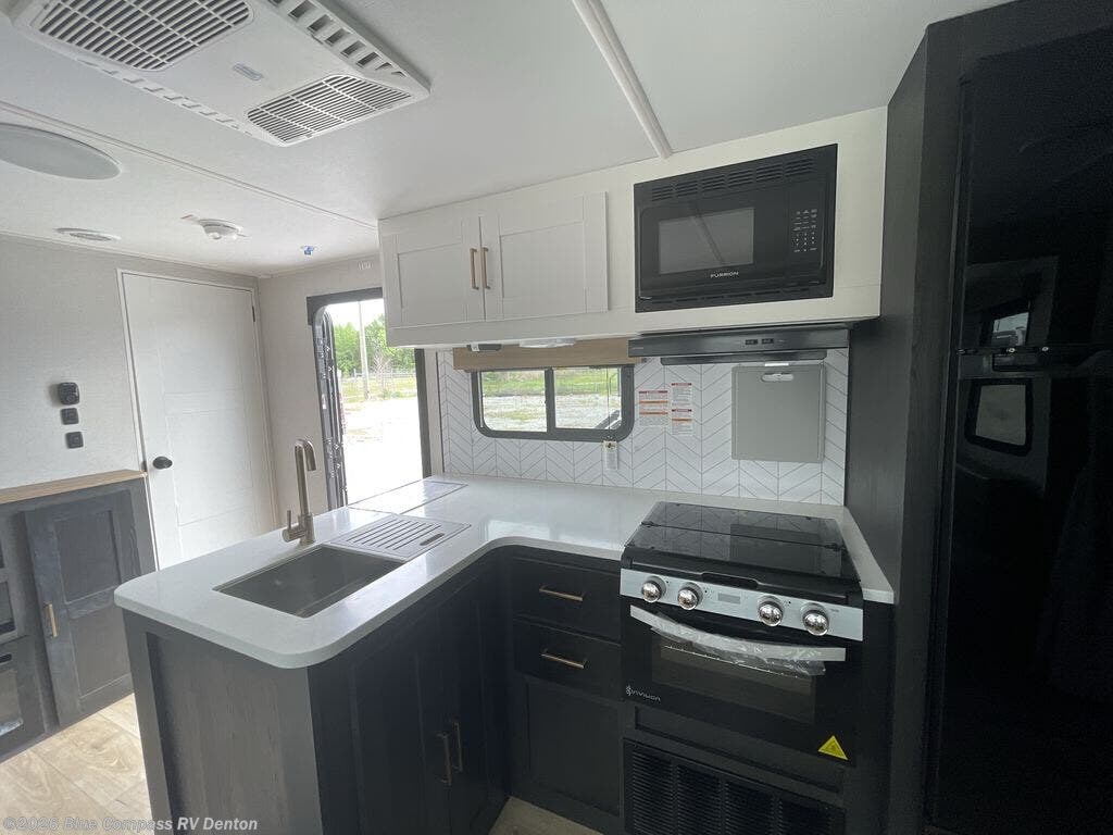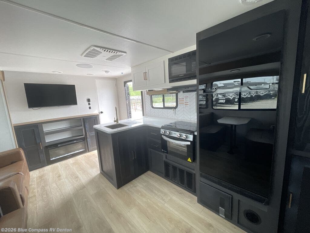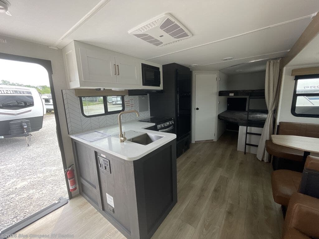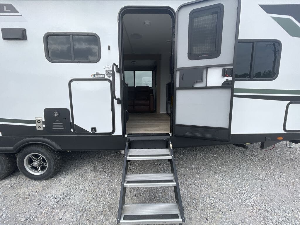 You'll love camping with friends and family in this dual entry travel trailer! One of the doors leads to the full bath so you can easily access it when you're visiting outdoors with friends. There are double-size bunks where the little ones or your guests can sleep, while you take the king bed in the front private bedroom. Everyone can meet in the combined kitchen and living room in the morning while the cook makes breakfast on the three burner cooktop. There is a booth dinette and sofa here for seating and sleeping space, although you might just want to sit under the 19' awning if breakfast is being made at the exterior kitchen!