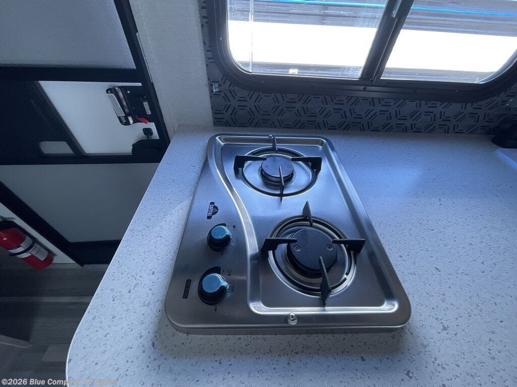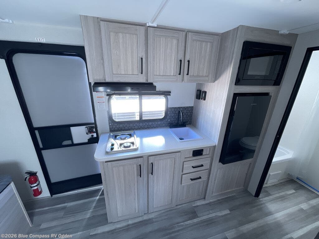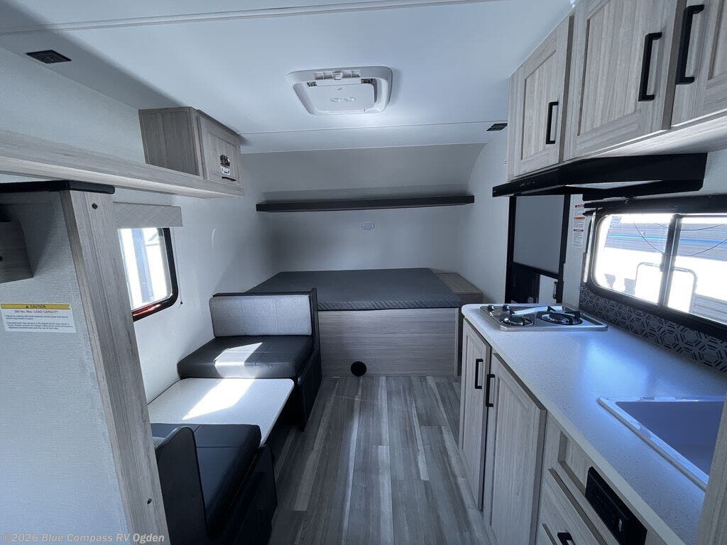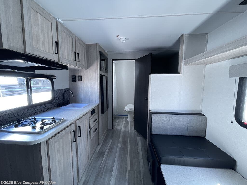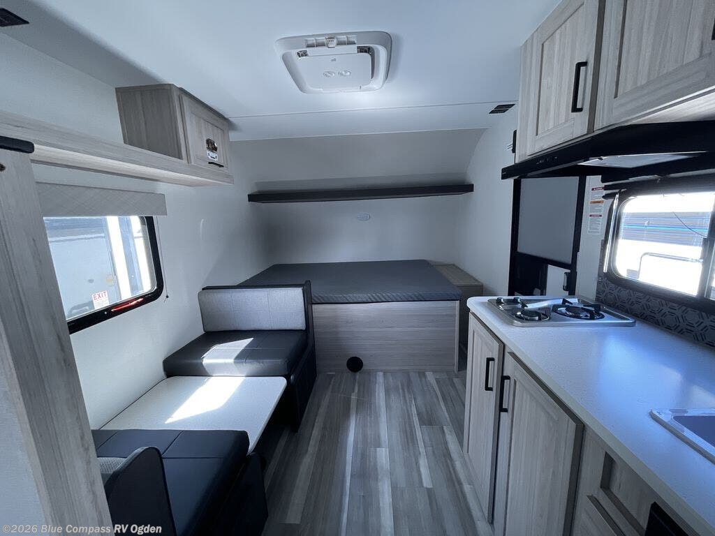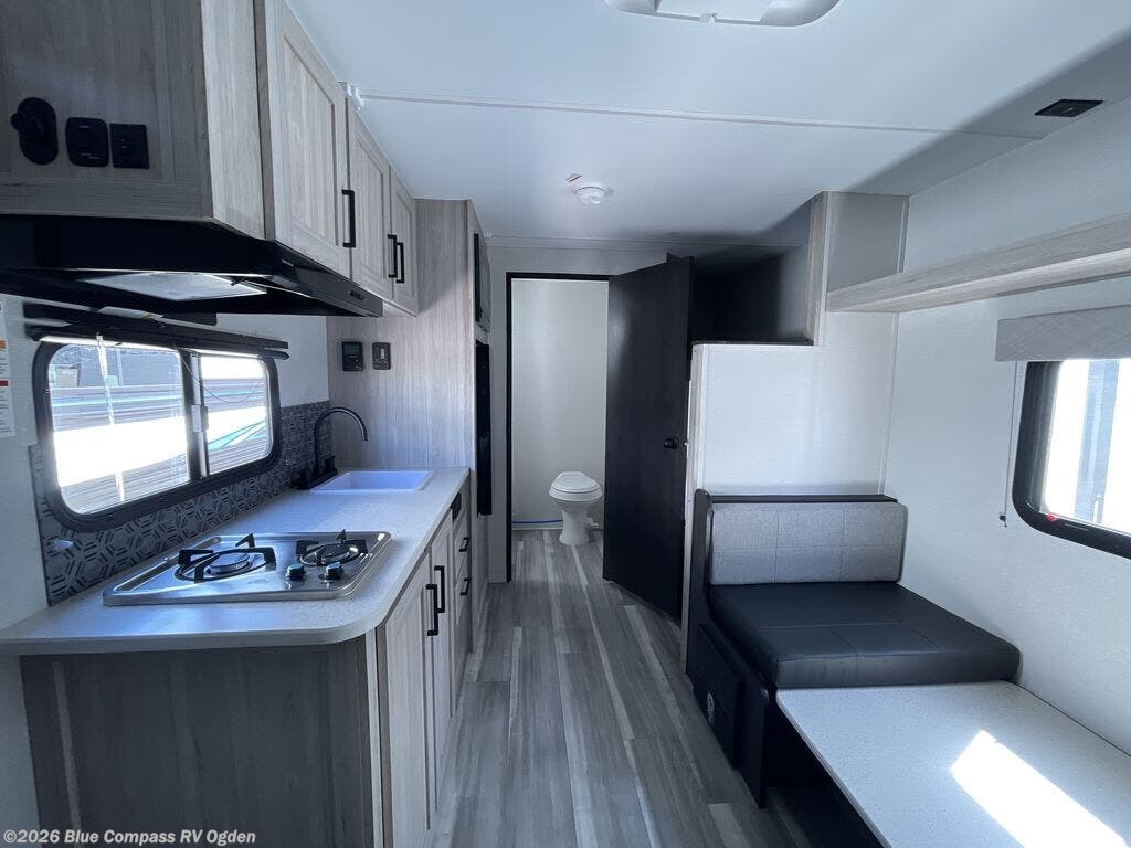 You'll love every minute spent in this travel trailer that can sleep five each night. There are bunk beds towards the back right beside the private bath for easy nighttime use. The queen bed up front will provide a great night's rest, and the booth dinette can double as dining and sleeping space. A two burner cooktop will let you cook meals each day, and there is a 3.3 cu. ft. 12V refrigerator for perishables.