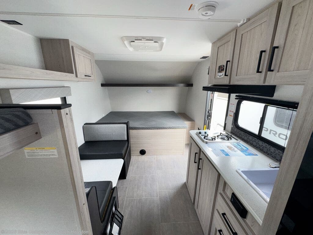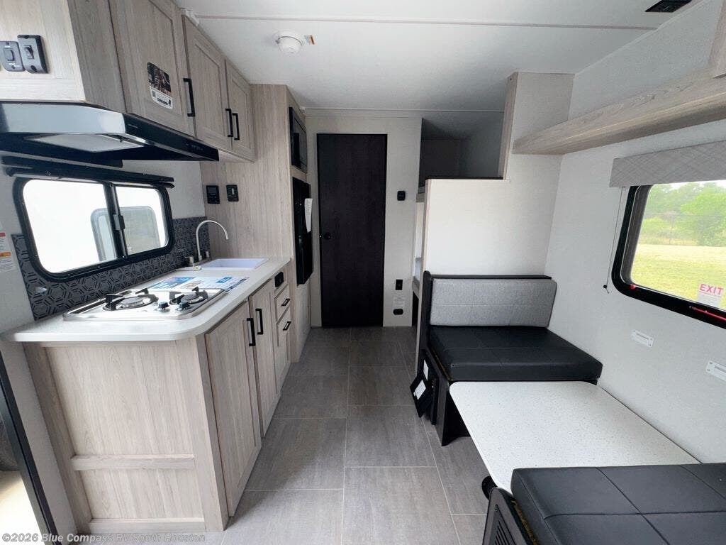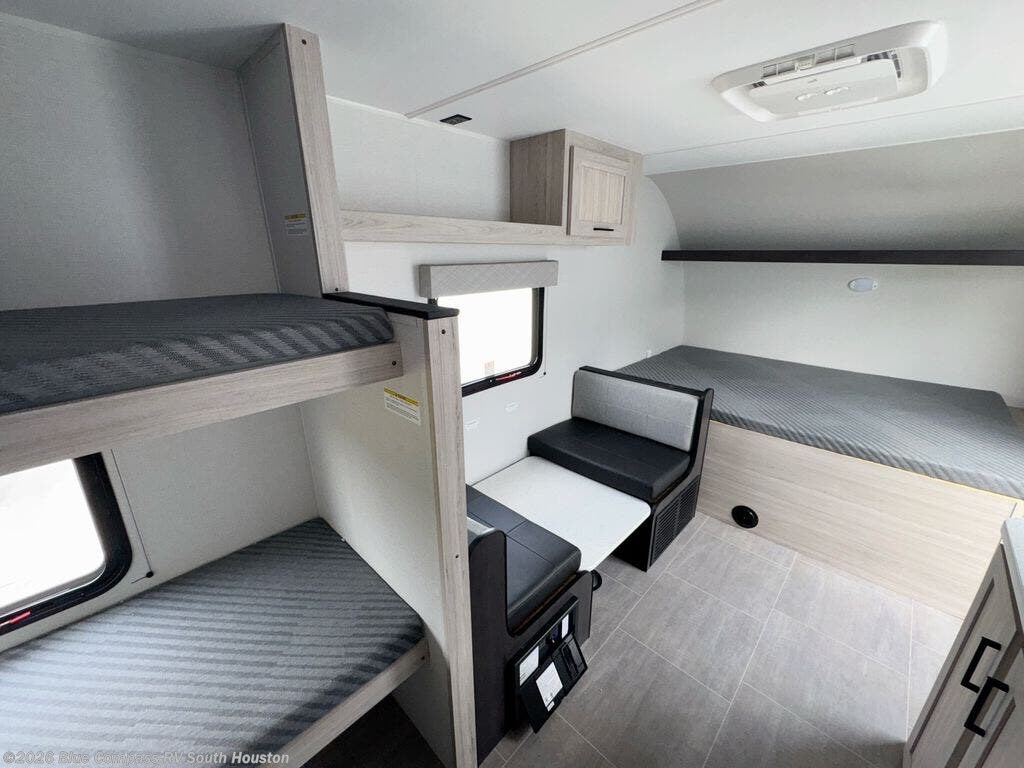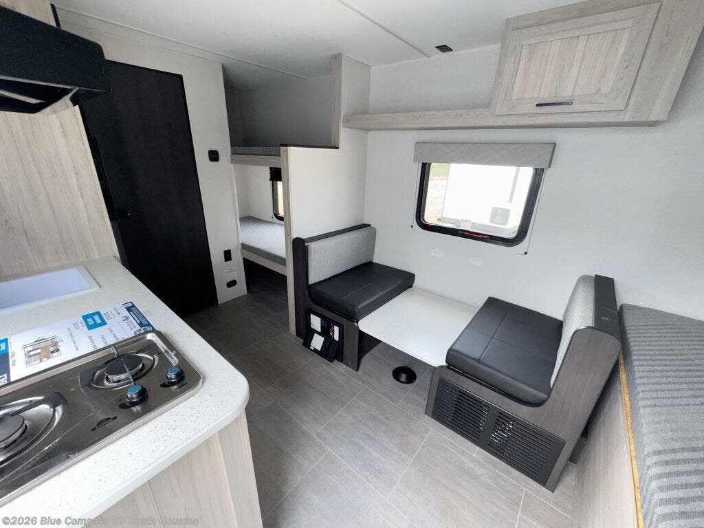 You'll love every minute spent in this travel trailer that can sleep five each night. There are bunk beds towards the back right beside the private bath for easy nighttime use. The queen bed up front will provide a great night's rest, and the booth dinette can double as dining and sleeping space. A two burner cooktop will let you cook meals each day, and there is a 3.3 cu. ft. 12V refrigerator for perishables.