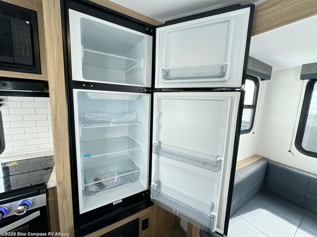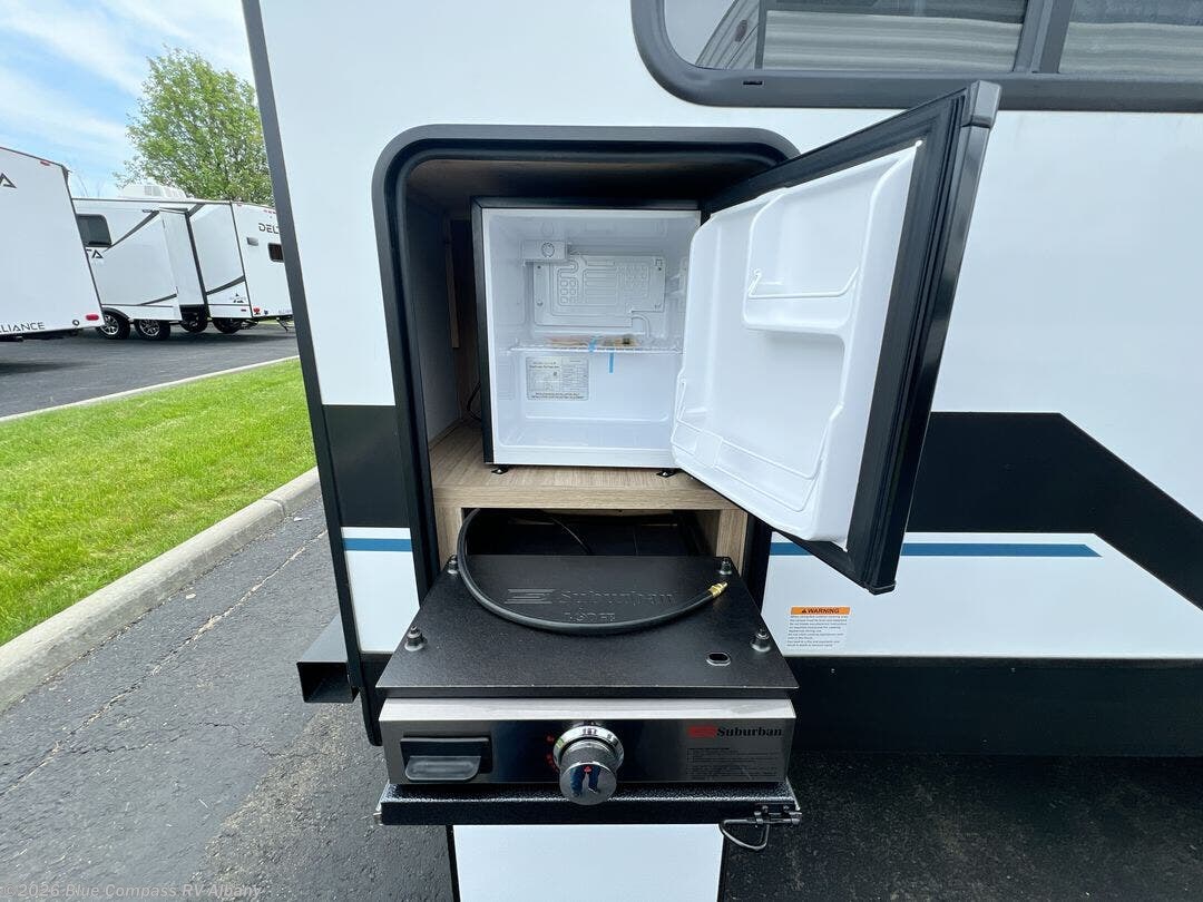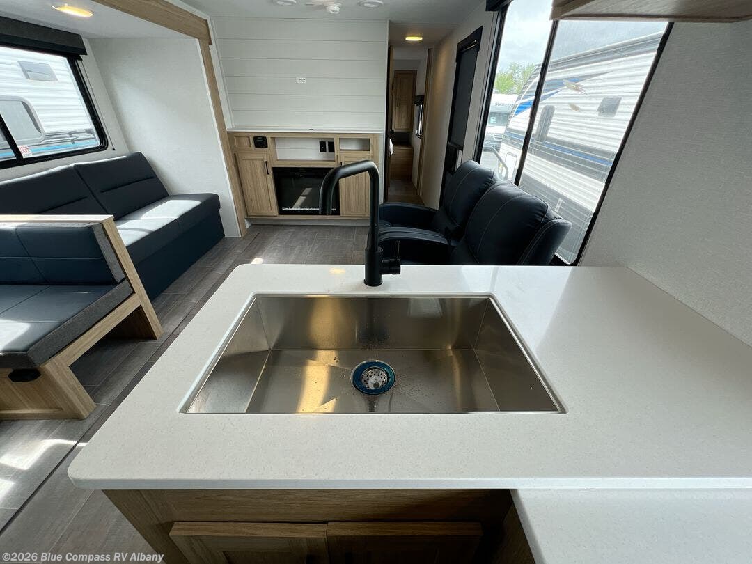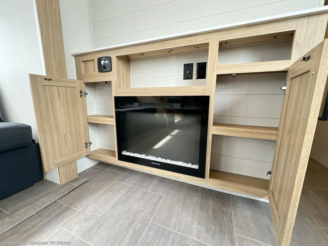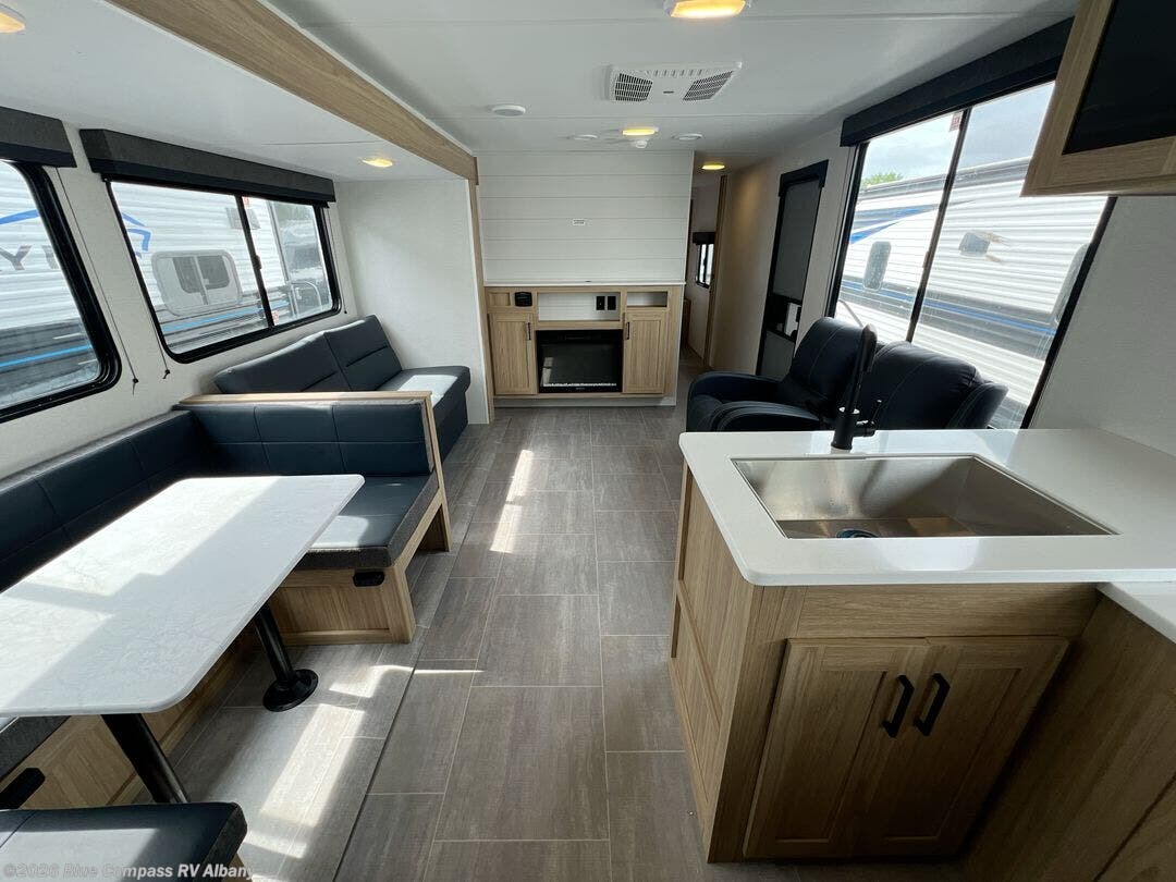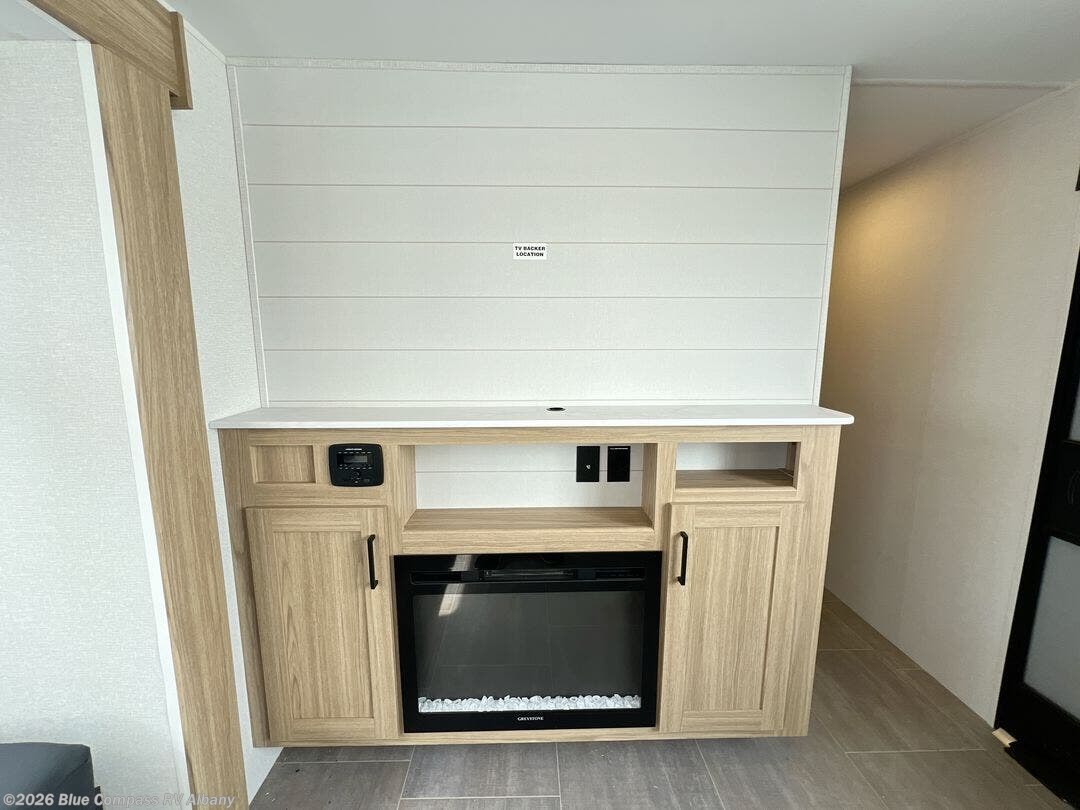 One look at this travel trailer and you'll be hooked! The front private bedroom with a queen bed provides a place for you to retreat to each night, and the full bath will let you freshen up in the morning. A full kitchen, complete with a three burner cooktop, microwave oven, and farmhouse sink will be perfect for meal times, and there is generous counter space to set out drinks and snacks. In the evening, you can relax on the sofa by the fireplace or head outdoors to relax under the power awning with LED lights. There is also an outdoor refrigerator to keep cold drinks stocked!