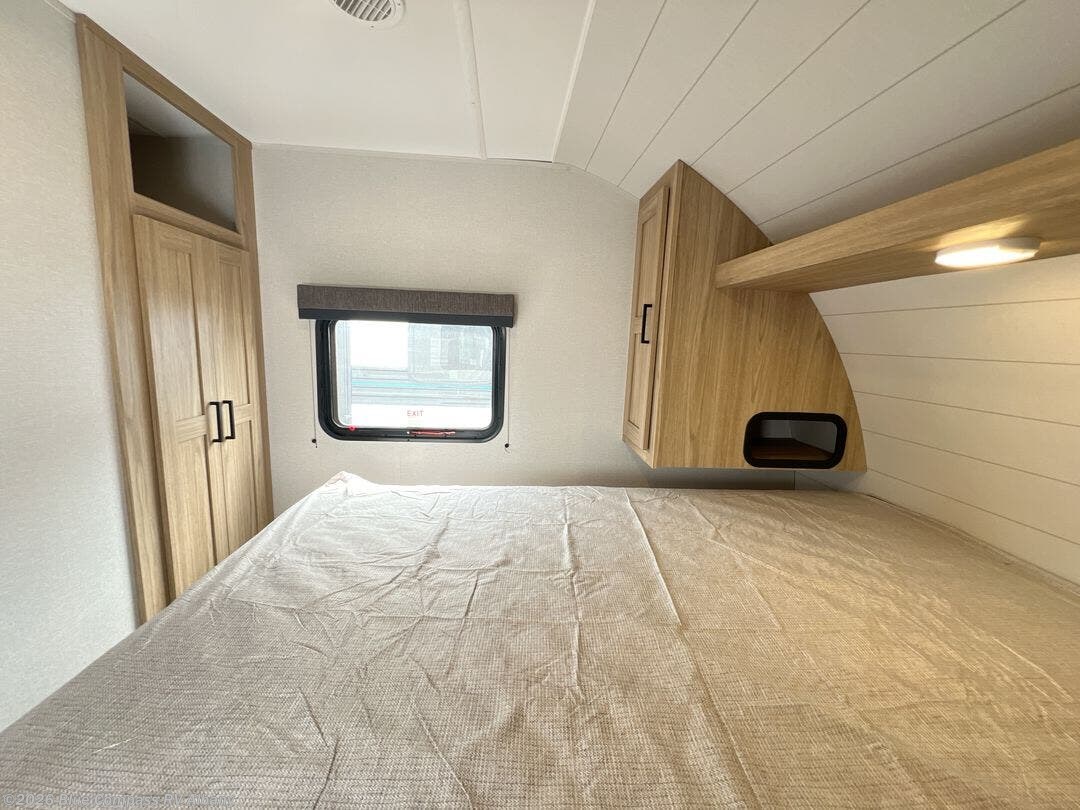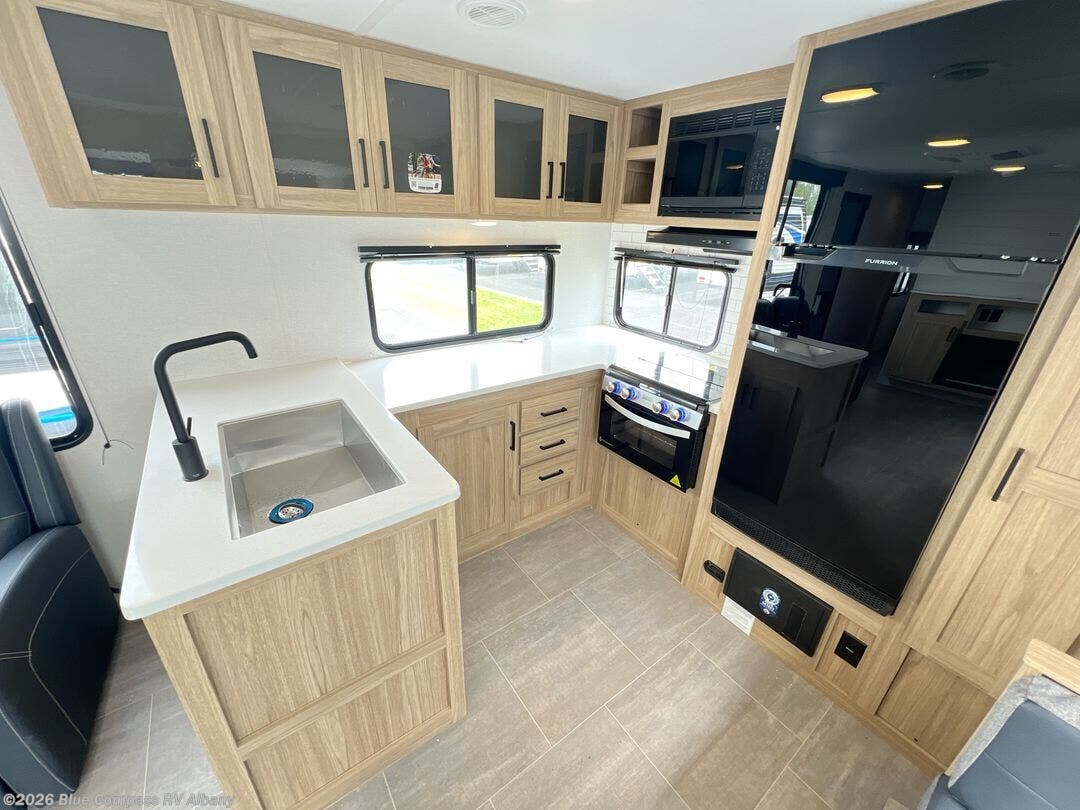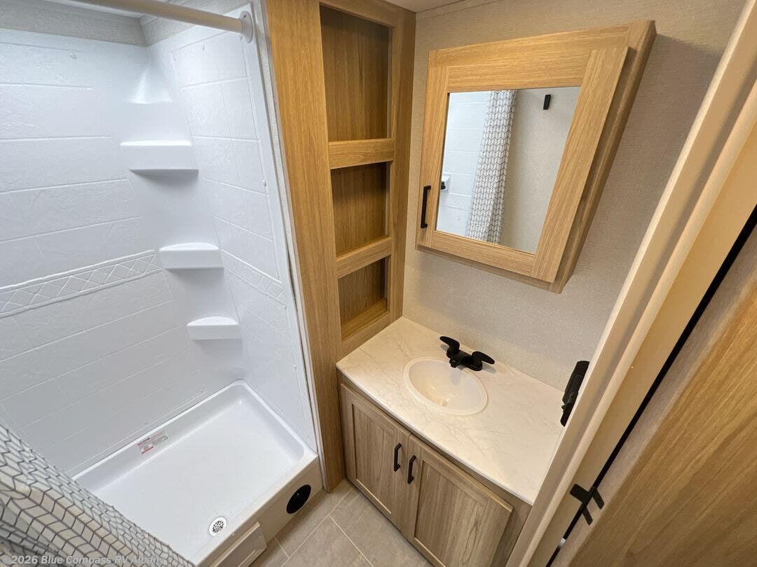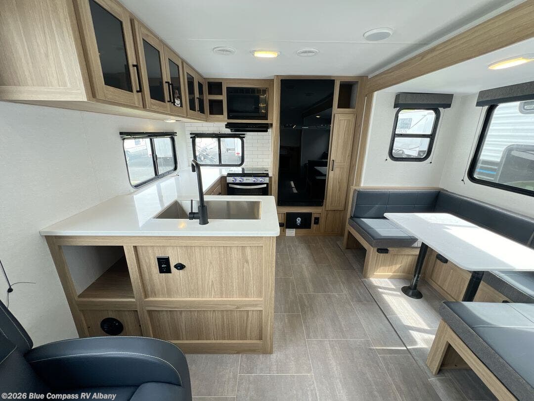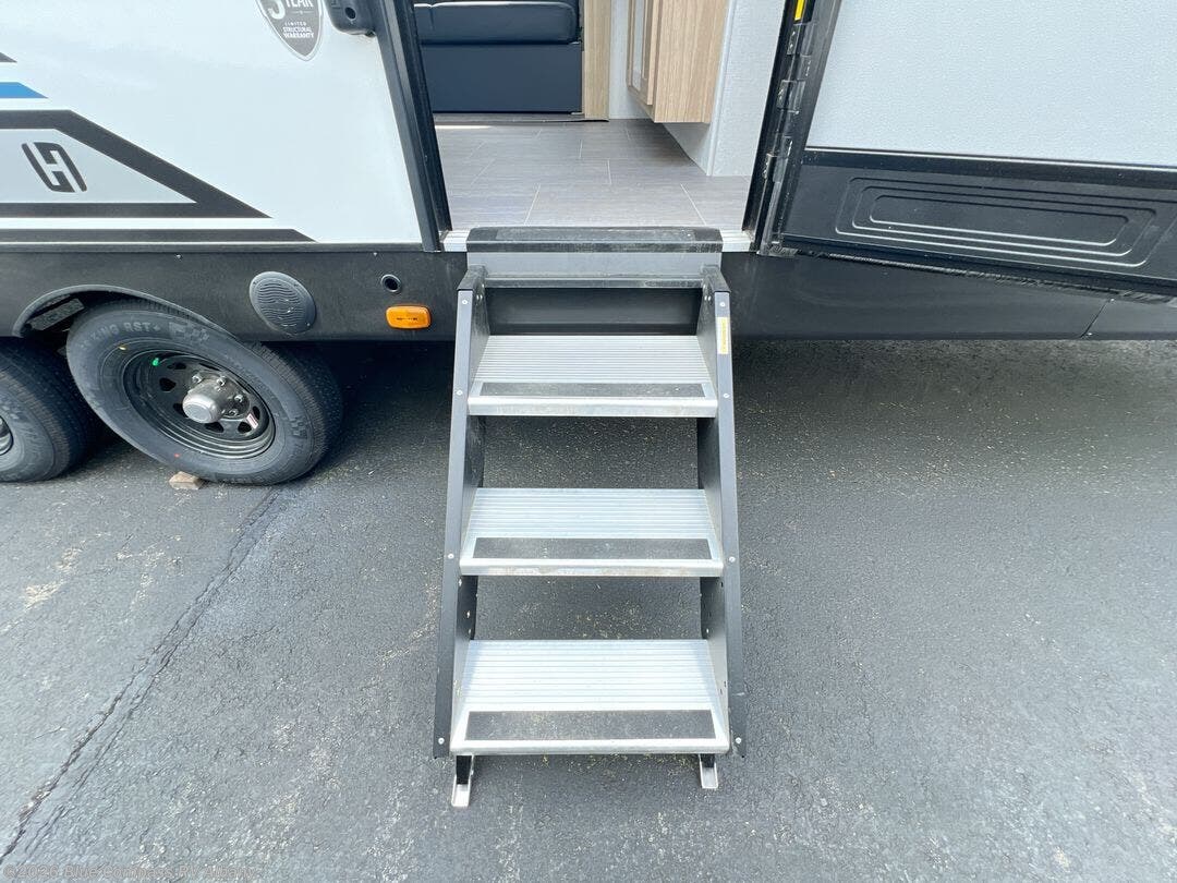 One look at this travel trailer and you'll be hooked! The front private bedroom with a queen bed provides a place for you to retreat to each night, and the full bath will let you freshen up in the morning. A full kitchen, complete with a three burner cooktop, microwave oven, and farmhouse sink will be perfect for meal times, and there is generous counter space to set out drinks and snacks. In the evening, you can relax on the sofa by the fireplace or head outdoors to relax under the power awning with LED lights. There is also an outdoor refrigerator to keep cold drinks stocked!