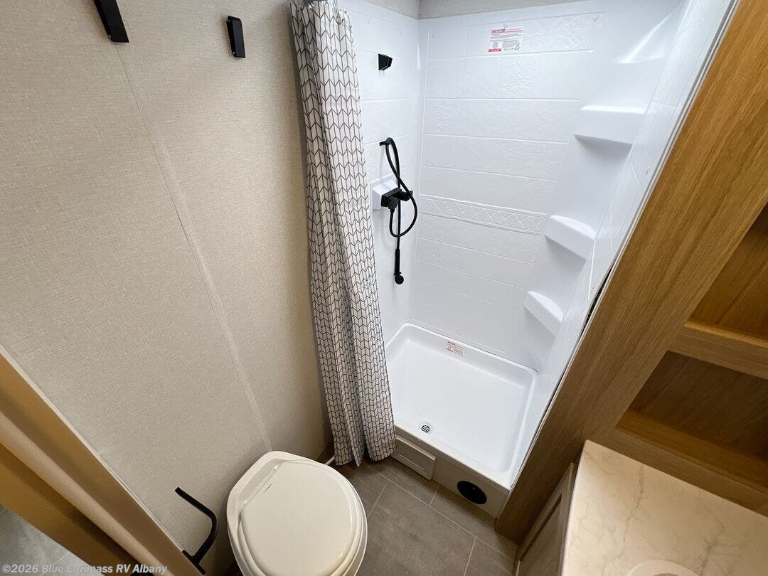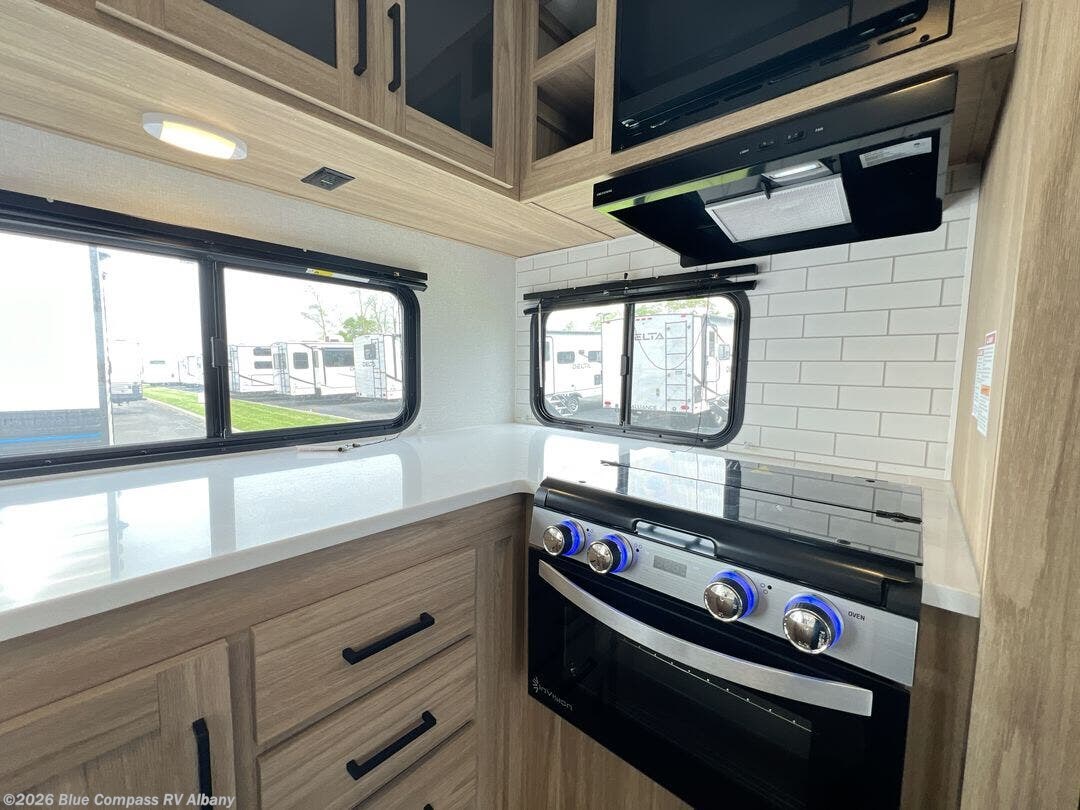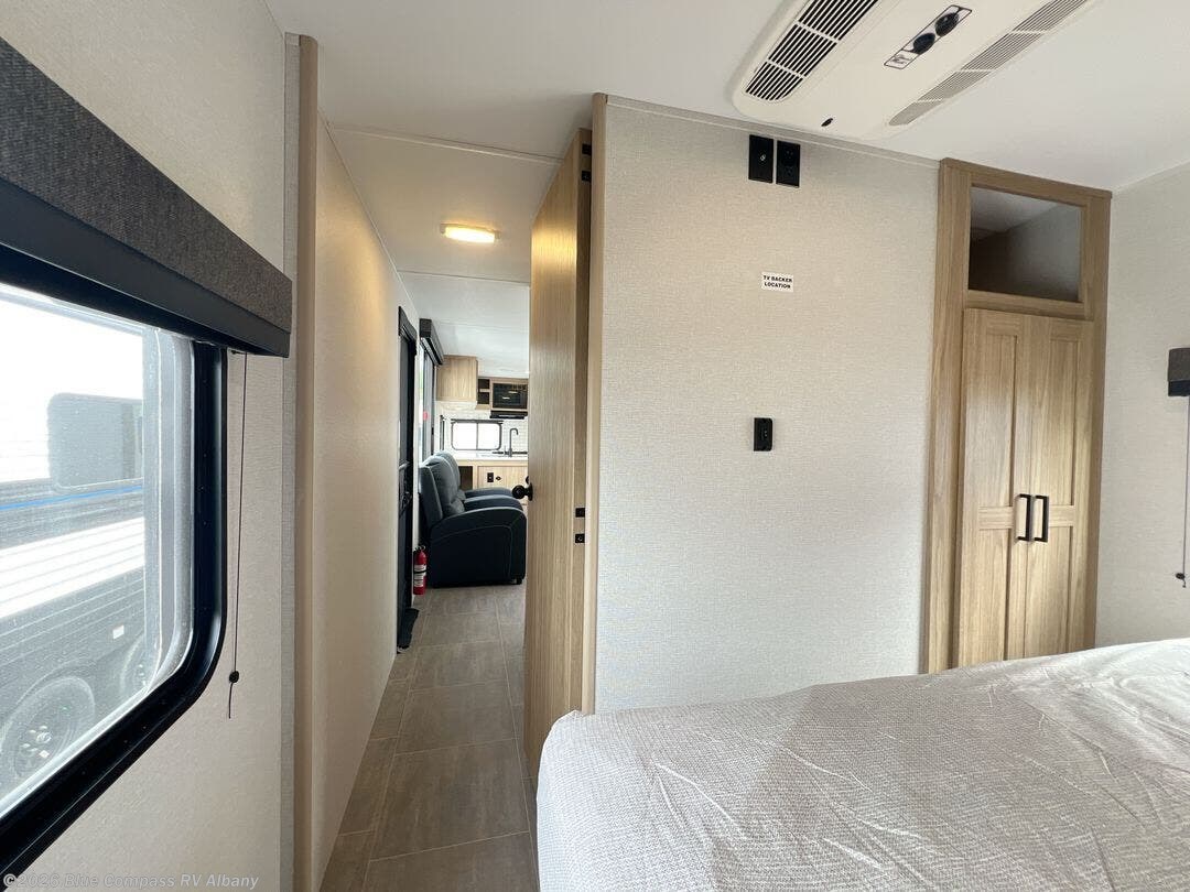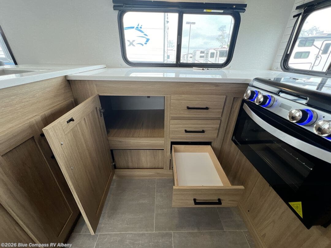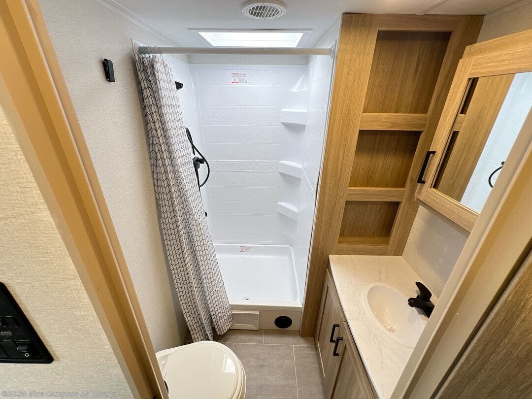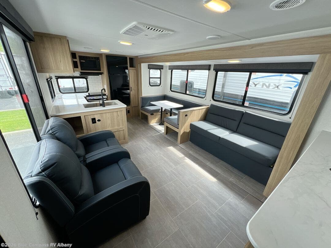 One look at this travel trailer and you'll be hooked! The front private bedroom with a queen bed provides a place for you to retreat to each night, and the full bath will let you freshen up in the morning. A full kitchen, complete with a three burner cooktop, microwave oven, and farmhouse sink will be perfect for meal times, and there is generous counter space to set out drinks and snacks. In the evening, you can relax on the sofa by the fireplace or head outdoors to relax under the power awning with LED lights. There is also an outdoor refrigerator to keep cold drinks stocked!