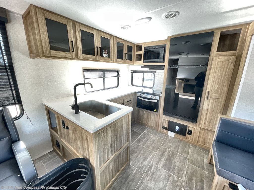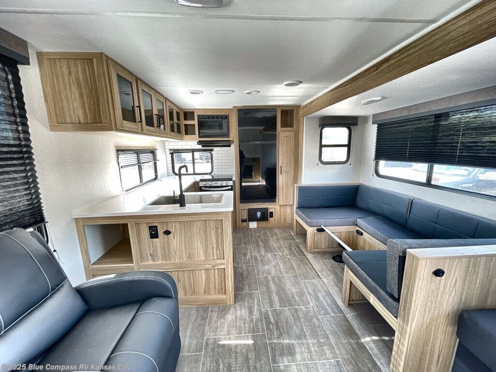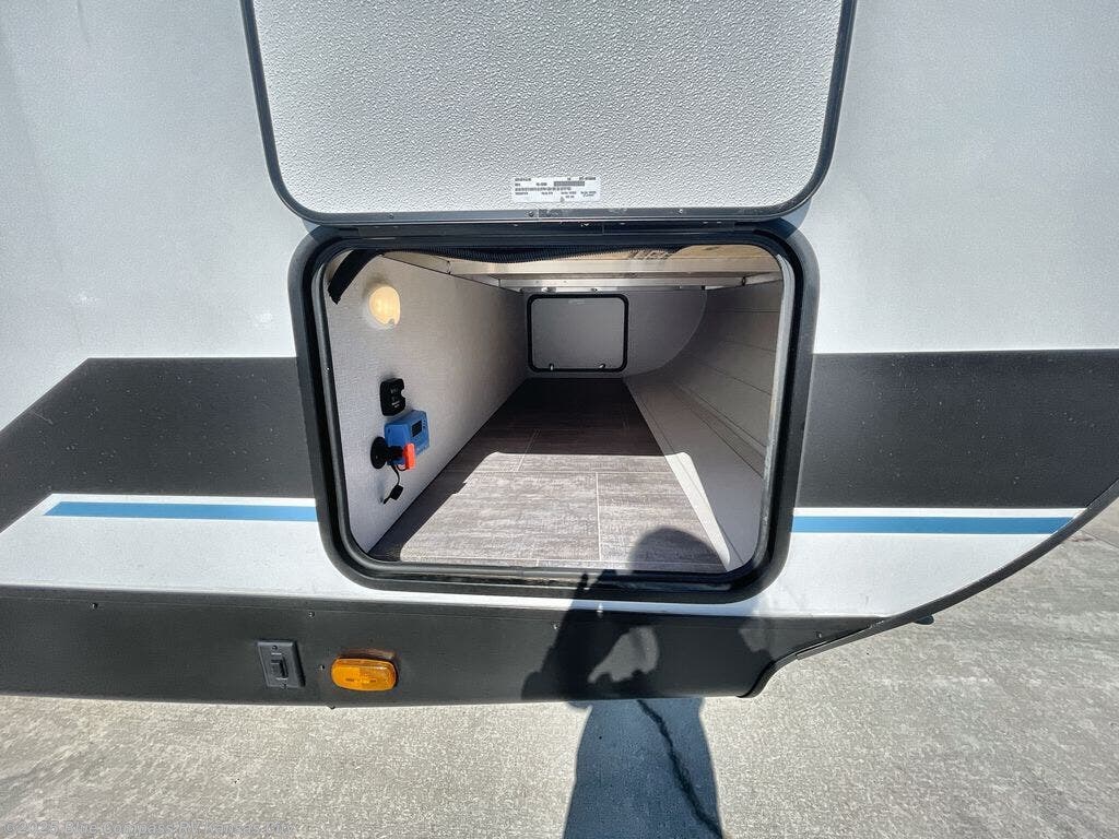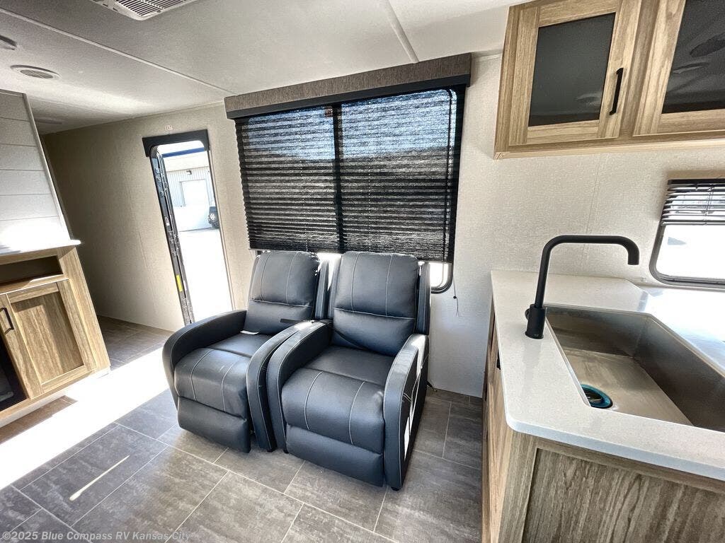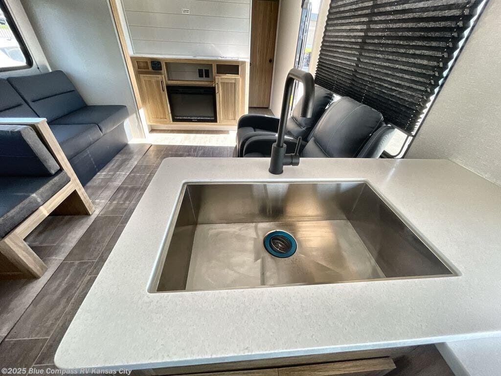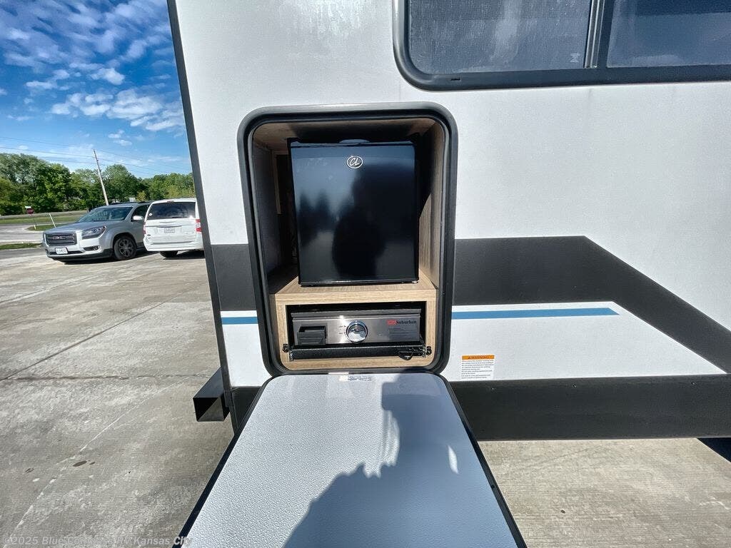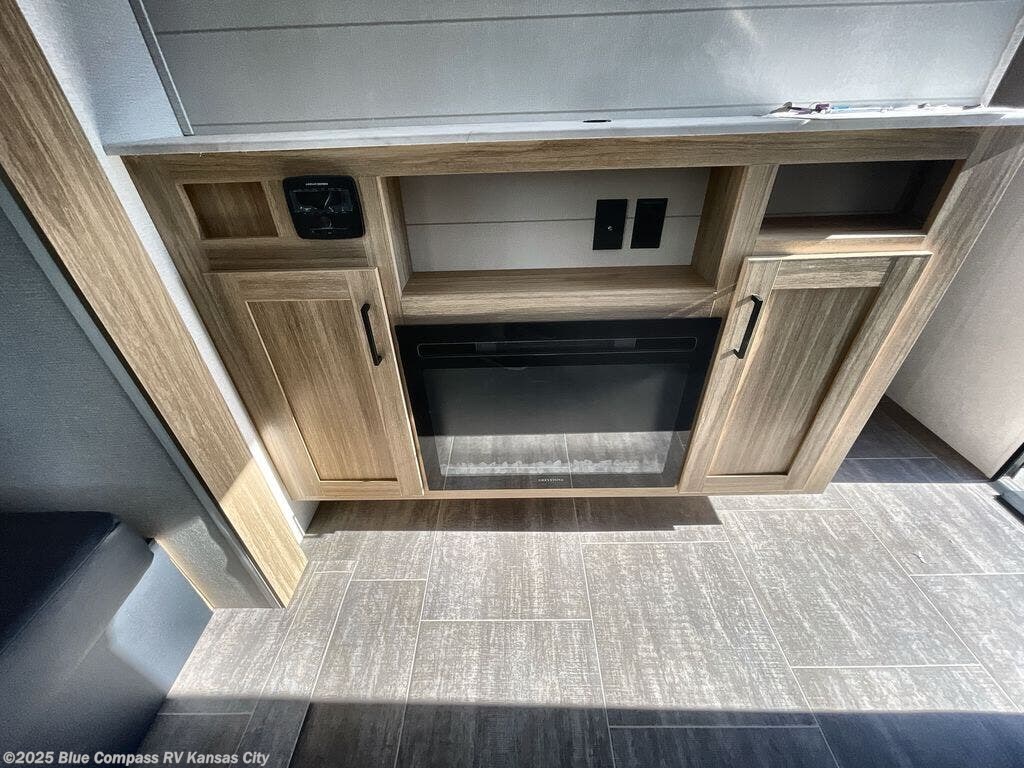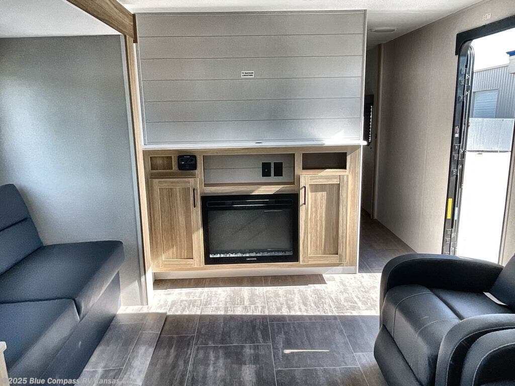 One look at this travel trailer and you'll be hooked! The front private bedroom with a queen bed provides a place for you to retreat to each night, and the full bath will let you freshen up in the morning. A full kitchen, complete with a three burner cooktop, microwave oven, and farmhouse sink will be perfect for meal times, and there is generous counter space to set out drinks and snacks. In the evening, you can relax on the sofa by the fireplace or head outdoors to relax under the power awning with LED lights. There is also an outdoor refrigerator to keep cold drinks stocked!