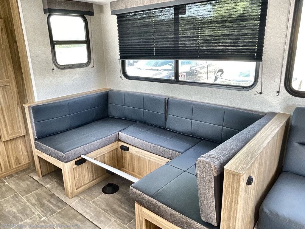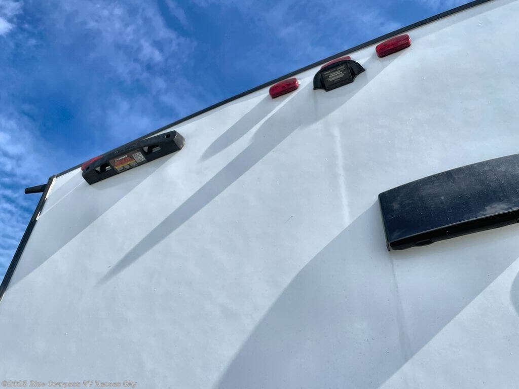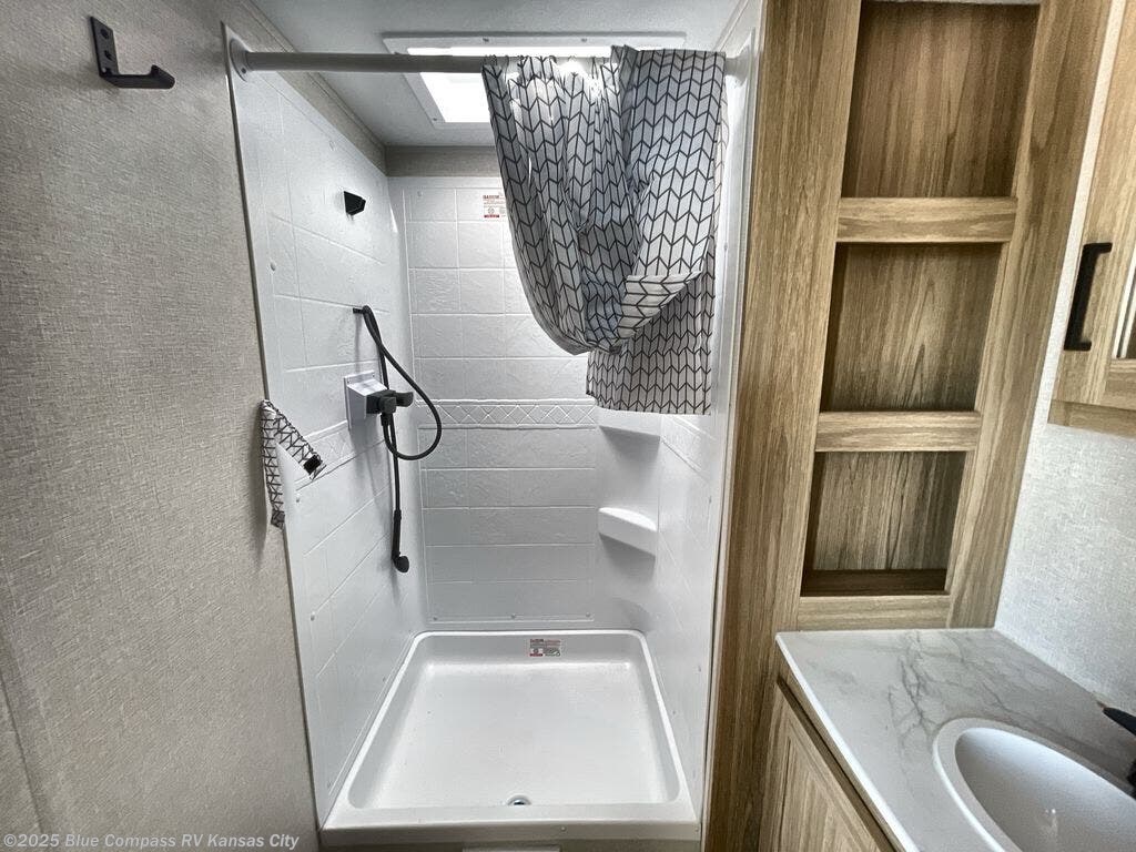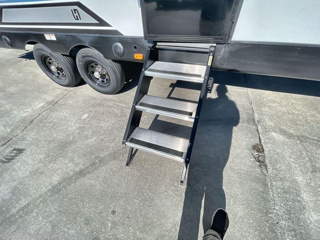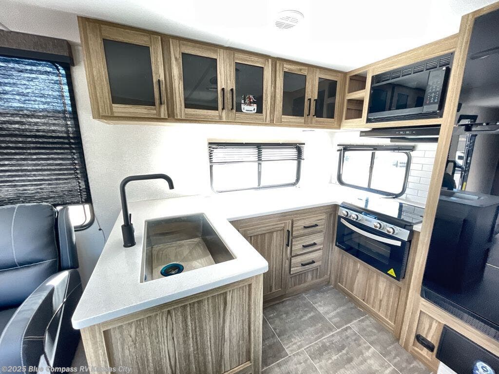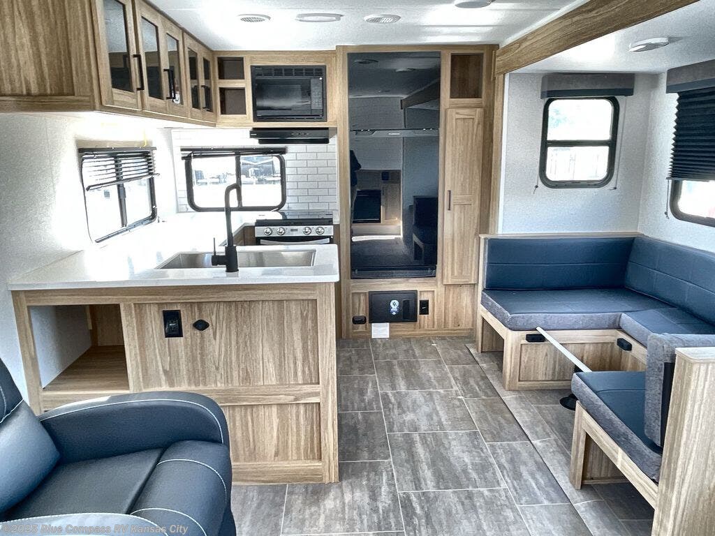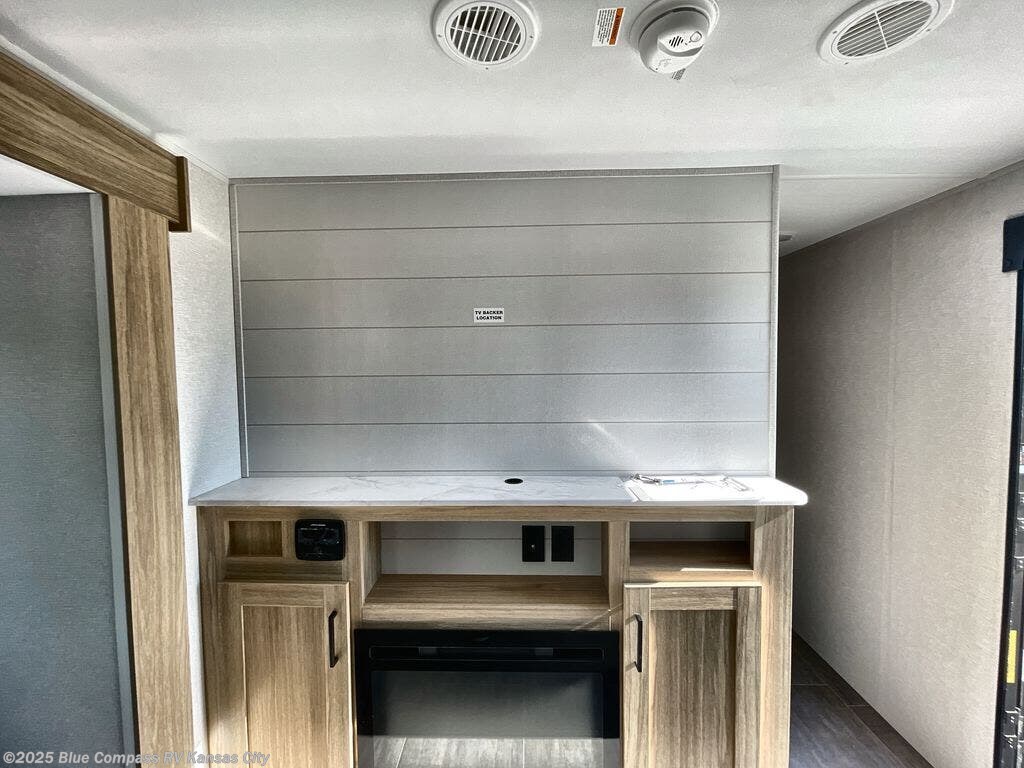 One look at this travel trailer and you'll be hooked! The front private bedroom with a queen bed provides a place for you to retreat to each night, and the full bath will let you freshen up in the morning. A full kitchen, complete with a three burner cooktop, microwave oven, and farmhouse sink will be perfect for meal times, and there is generous counter space to set out drinks and snacks. In the evening, you can relax on the sofa by the fireplace or head outdoors to relax under the power awning with LED lights. There is also an outdoor refrigerator to keep cold drinks stocked!