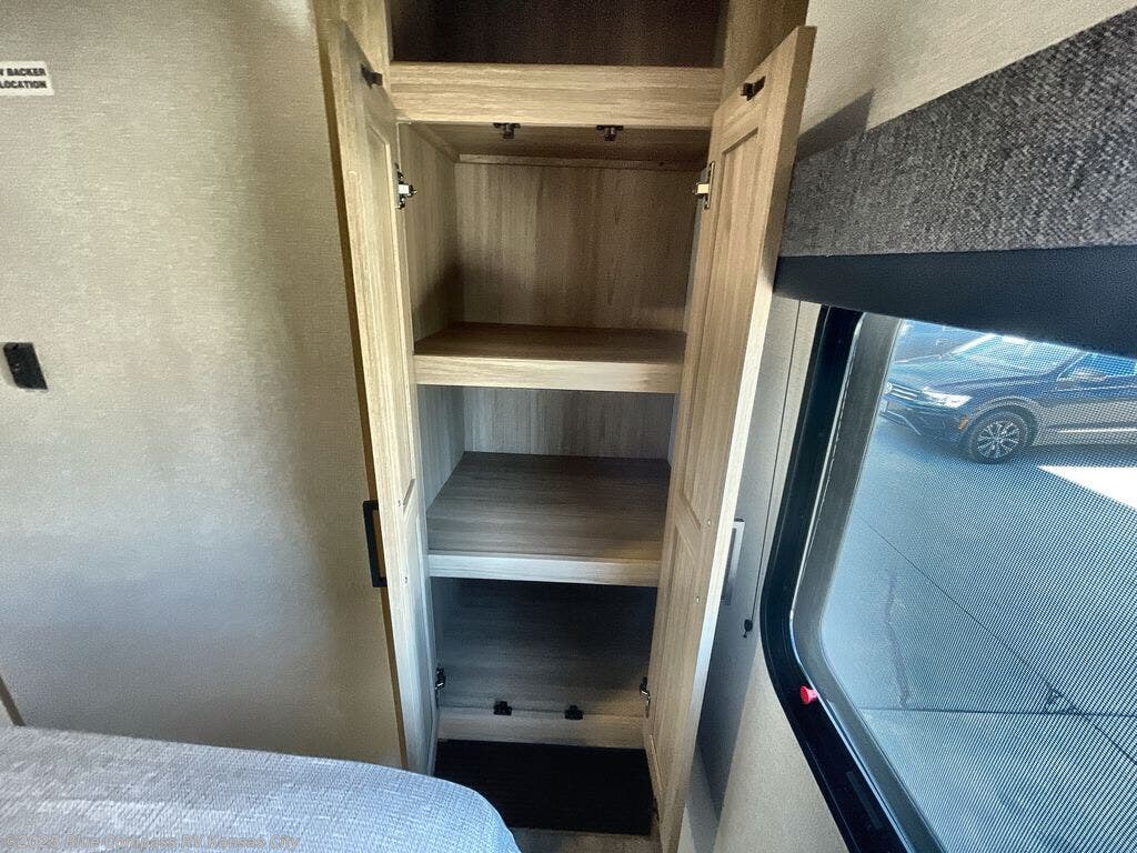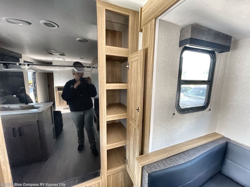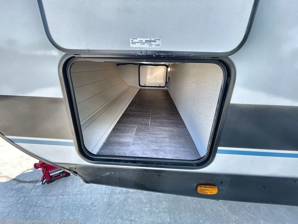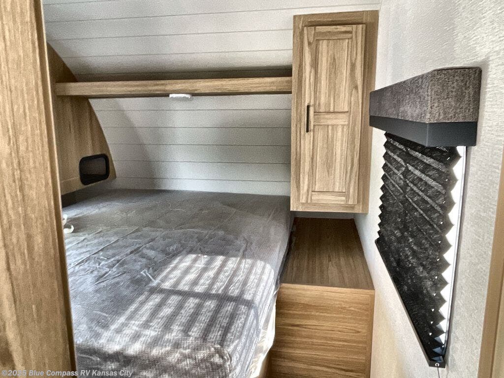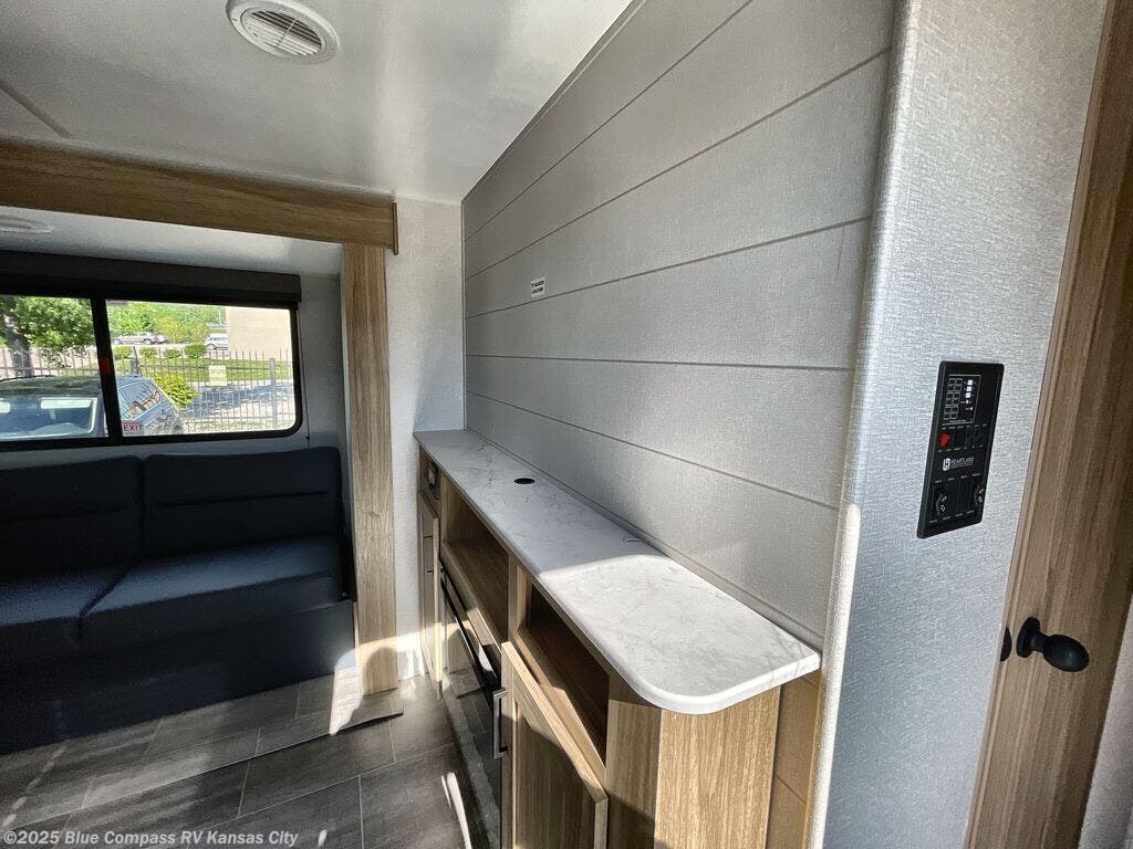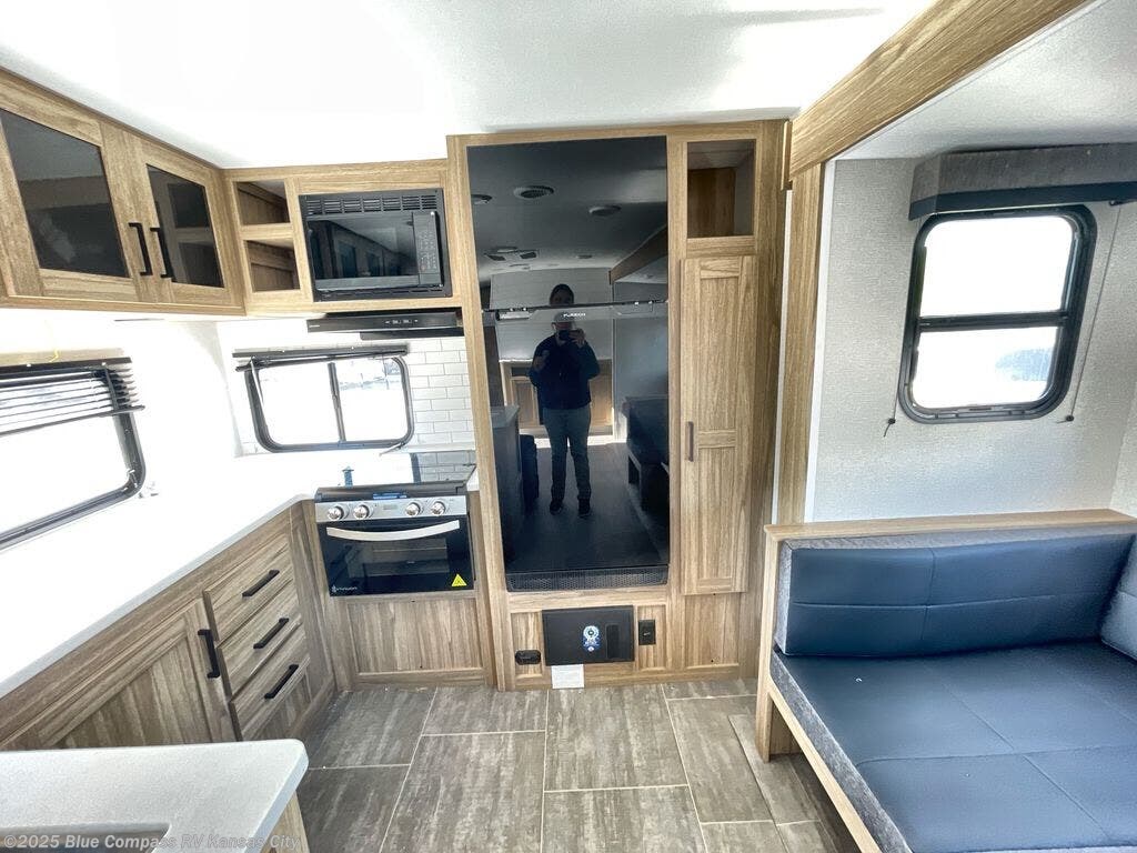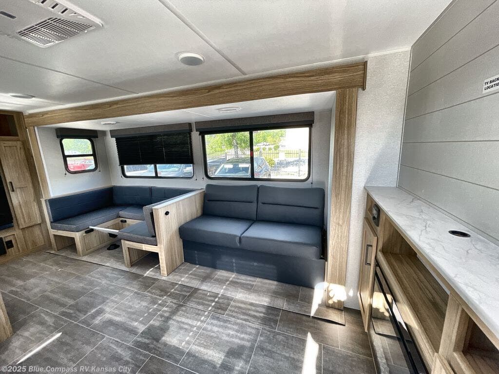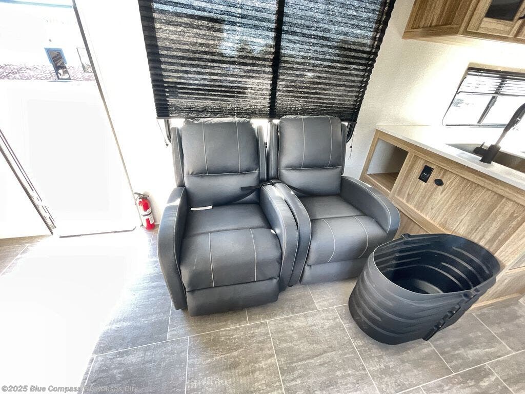 One look at this travel trailer and you'll be hooked! The front private bedroom with a queen bed provides a place for you to retreat to each night, and the full bath will let you freshen up in the morning. A full kitchen, complete with a three burner cooktop, microwave oven, and farmhouse sink will be perfect for meal times, and there is generous counter space to set out drinks and snacks. In the evening, you can relax on the sofa by the fireplace or head outdoors to relax under the power awning with LED lights. There is also an outdoor refrigerator to keep cold drinks stocked!