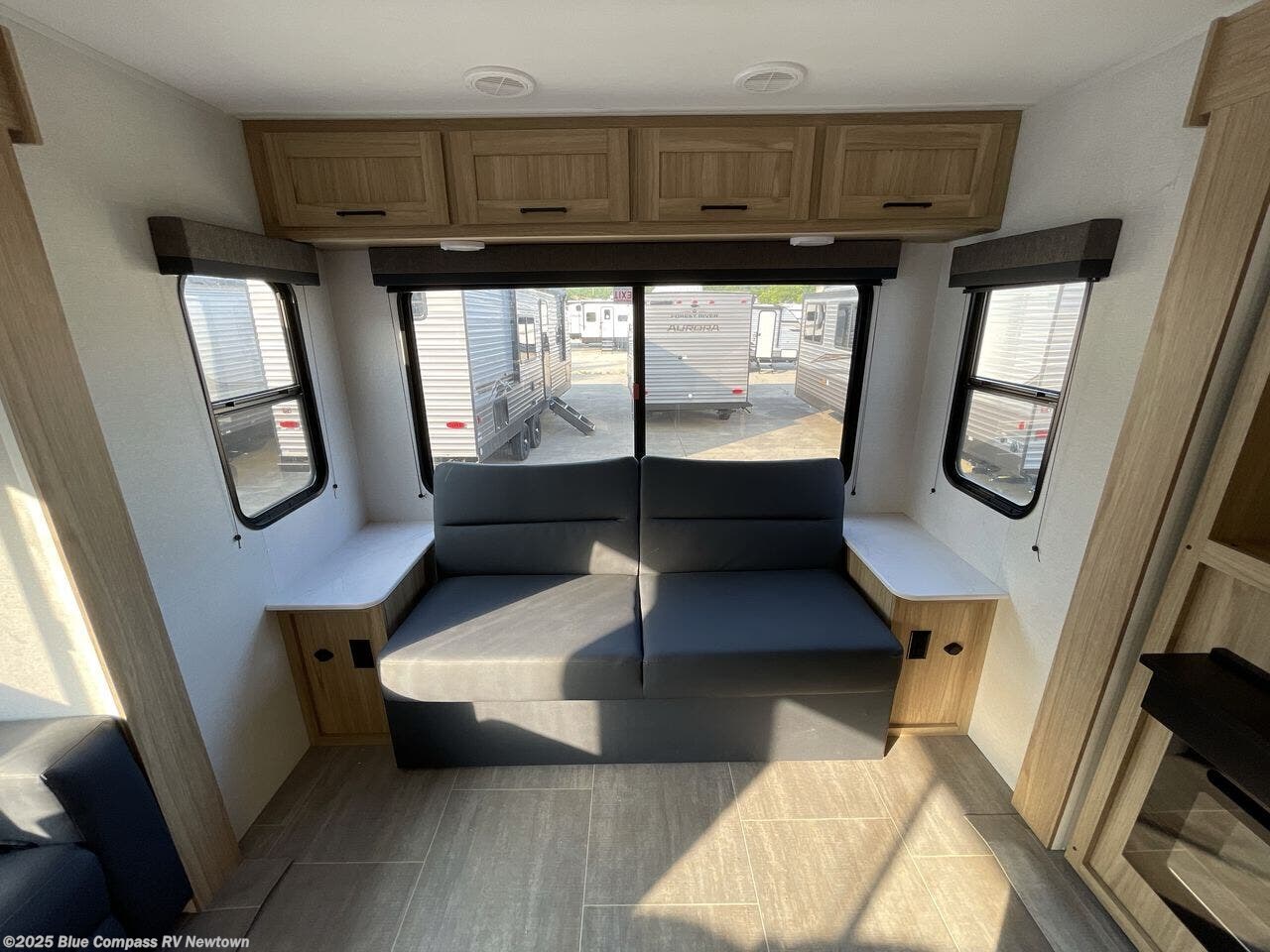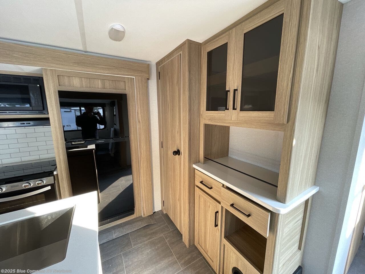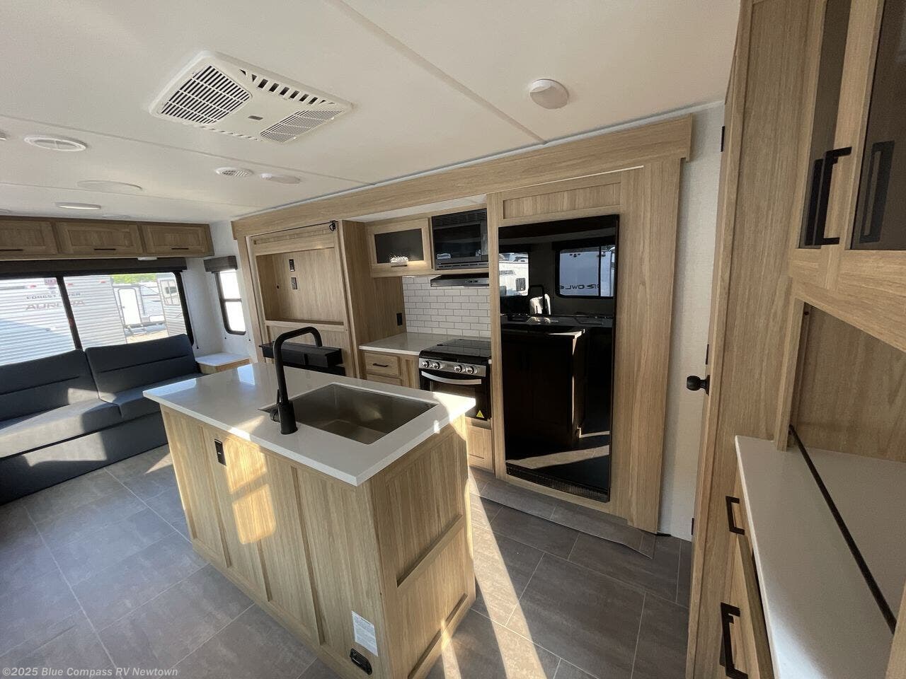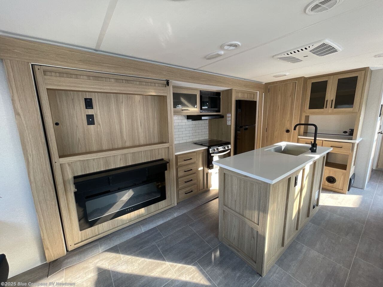 This spacious and inviting travel trailer is perfect for four campers. There is a front private bedroom with a queen bed, dual wardrobes, plus a third wardrobe with washer and dryer prep if you choose to add those appliances. The chef of your group can make breakfast on the three burner cooktop, and there is additional counter space thanks to the kitchen island. You'll also find a pantry and overhead cabinets for storage plus TV prep and a fireplace with hidden storage for movies, games and more. Your crew can get comfy on the theater seating or rear sofa, and there is a free-standing table with chairs where you can dine at and play games!