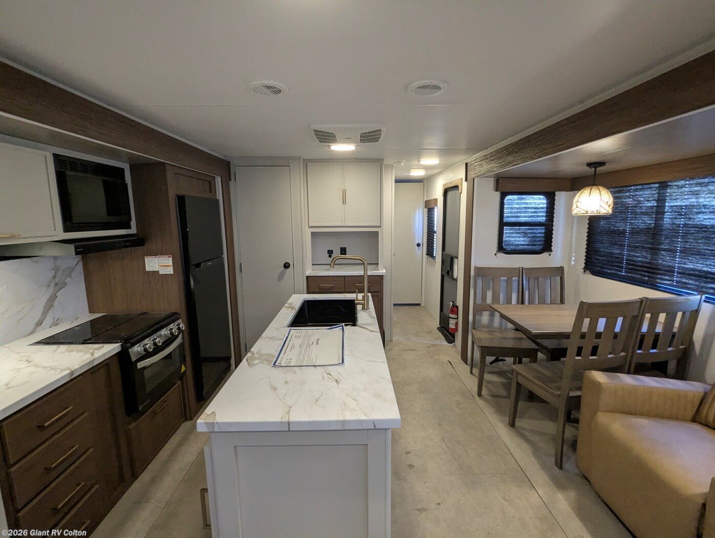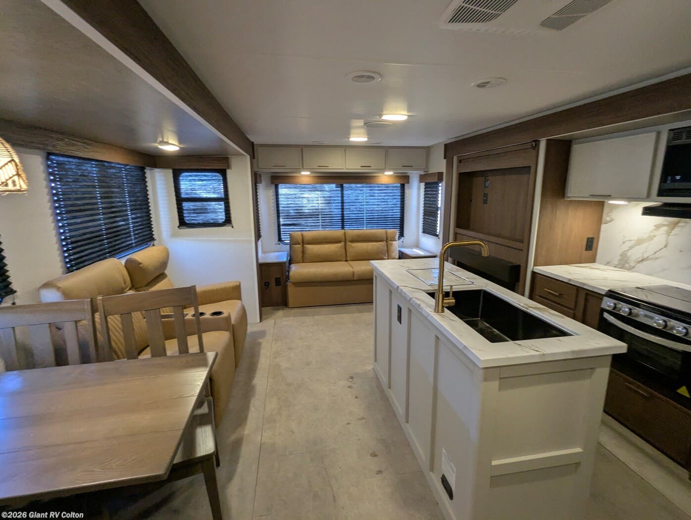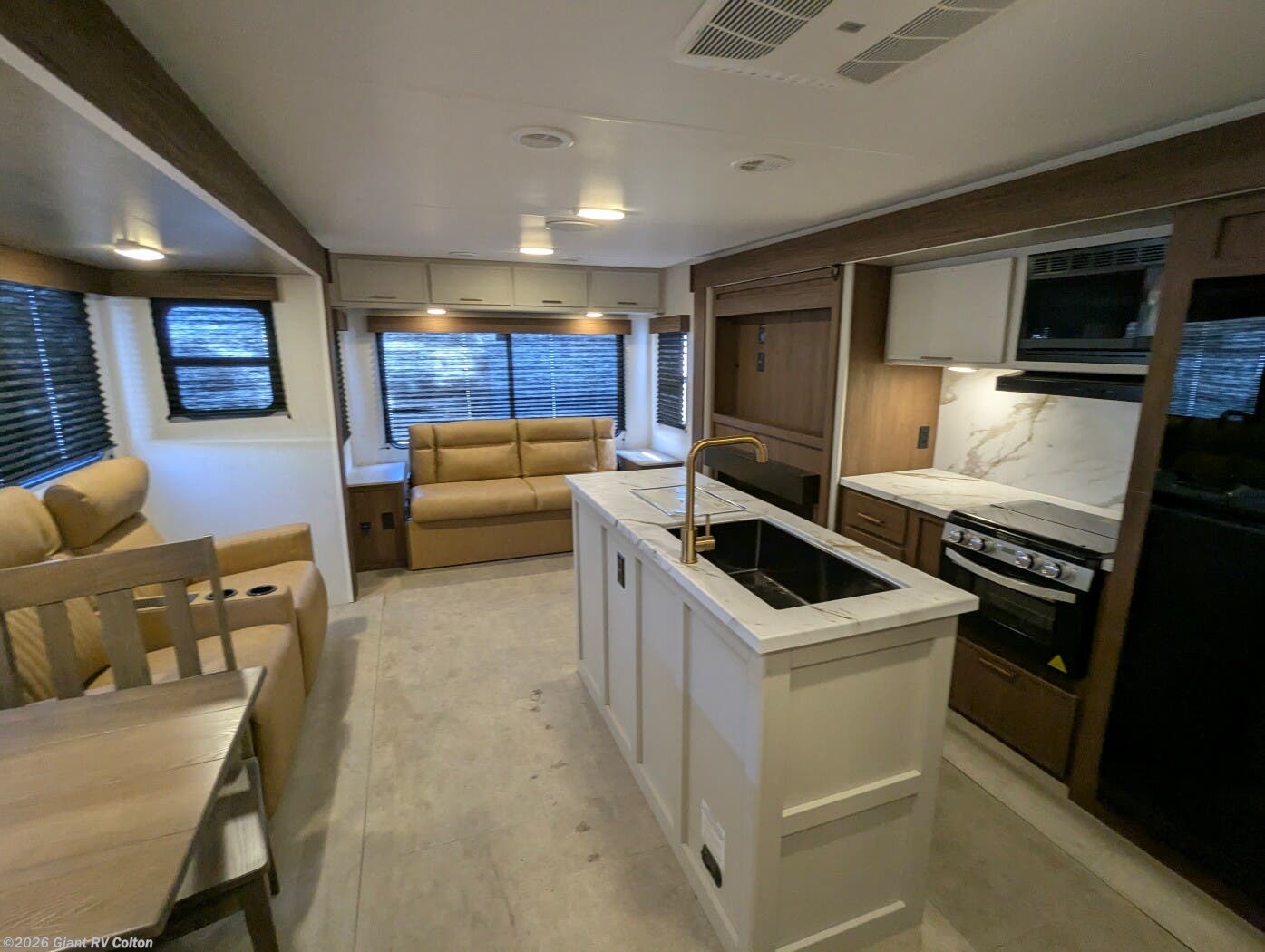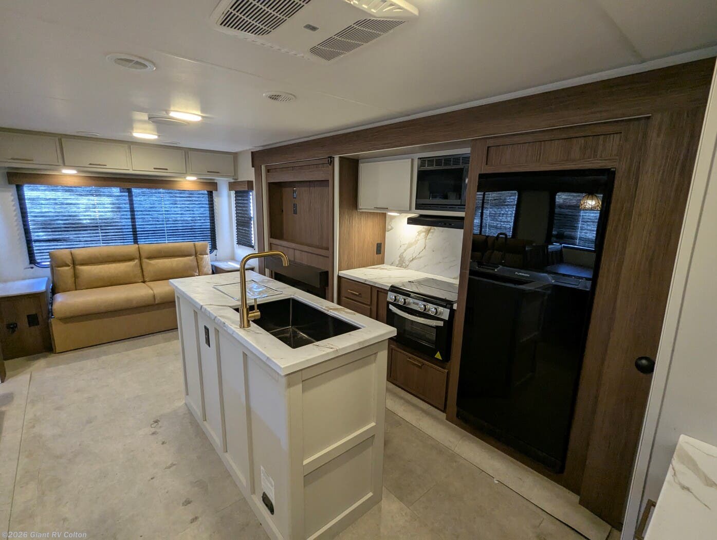 - Premium Amenities: Features air conditioning, a kitchen island with a 10 cu ft 12V refrigerator, microwave, and hidden pantry for convenience.