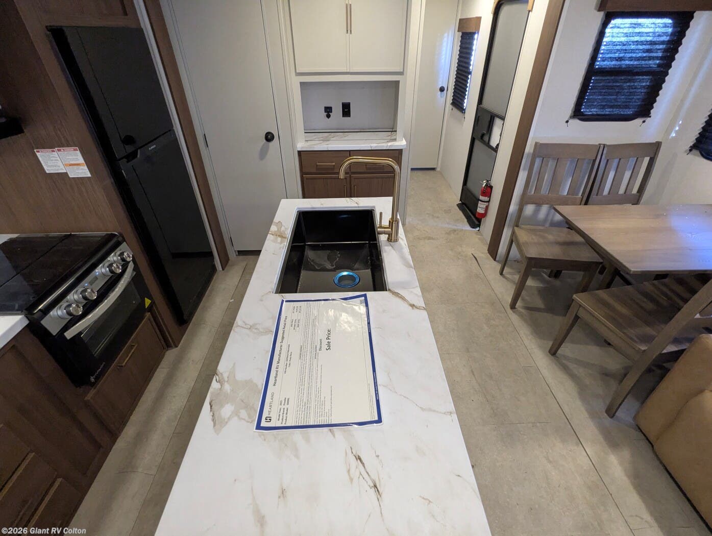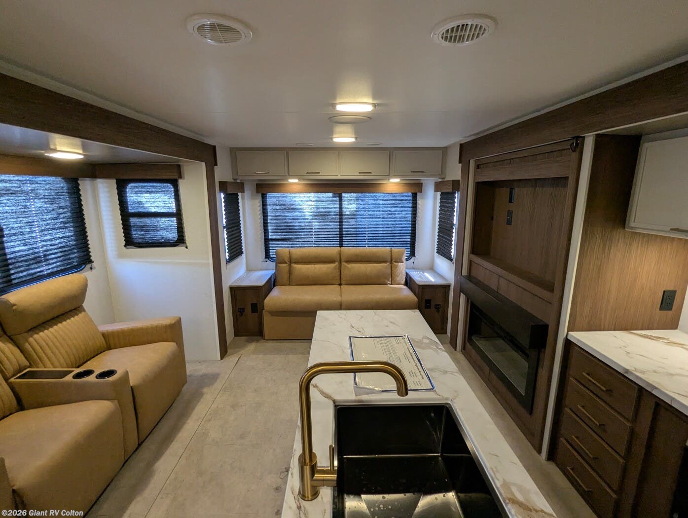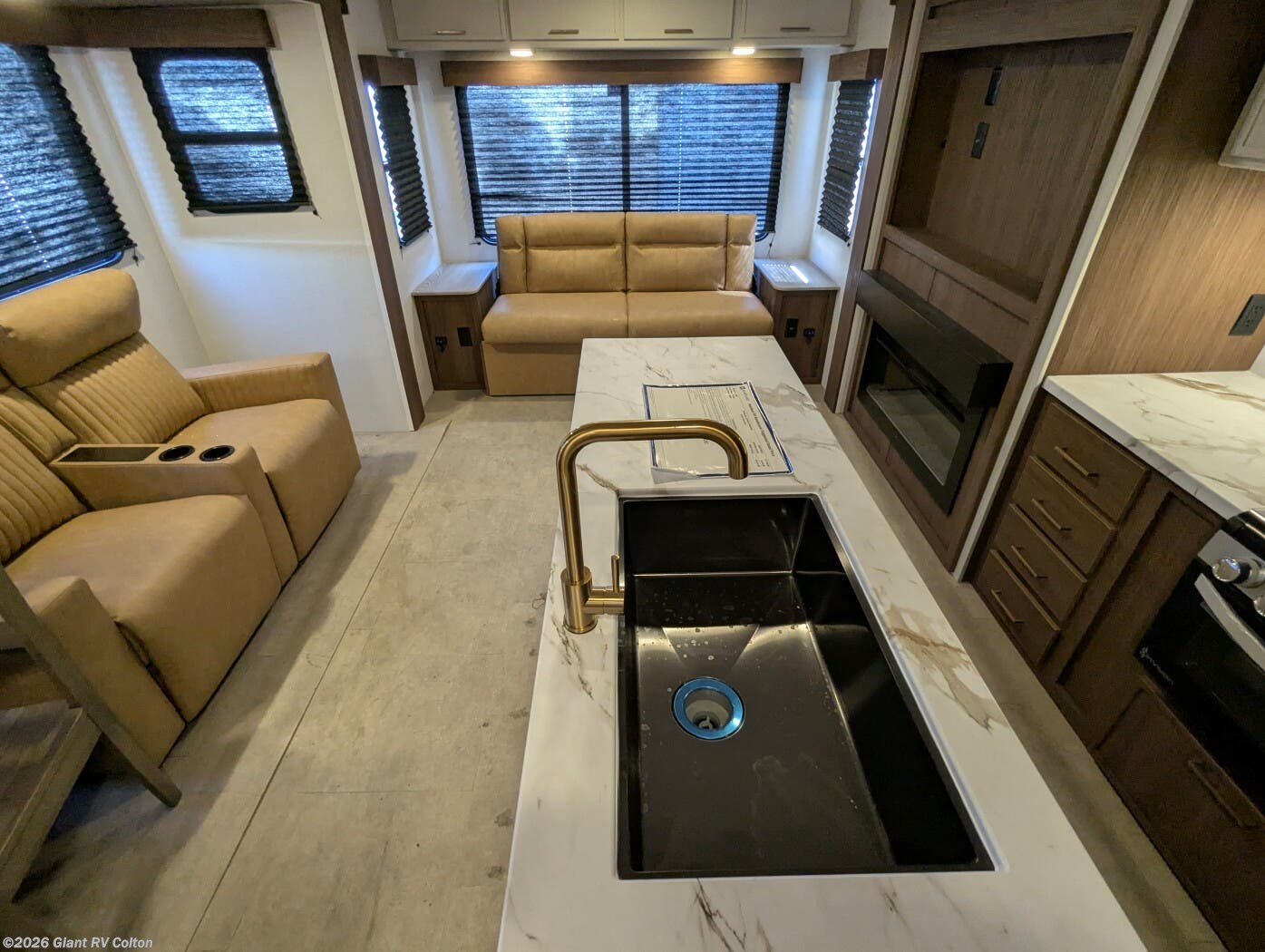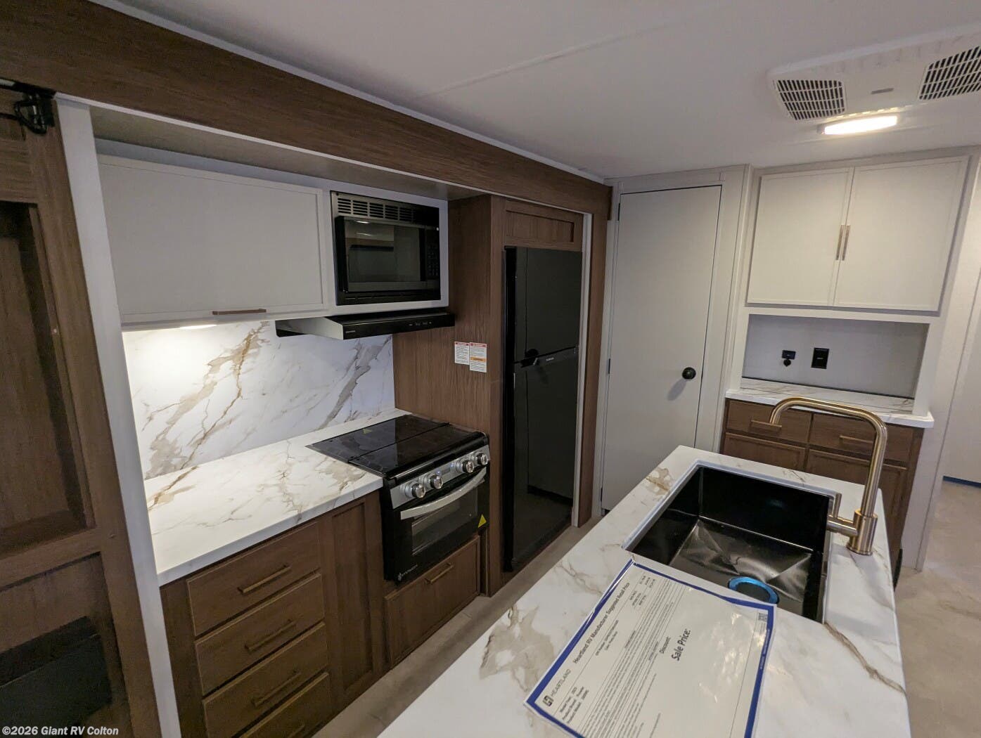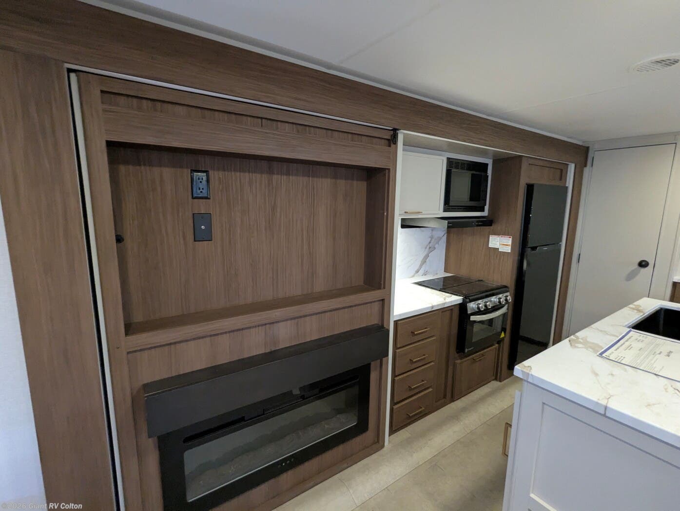 - Premium Amenities: Features air conditioning, a kitchen island with a 10 cu ft 12V refrigerator, microwave, and hidden pantry for convenience.