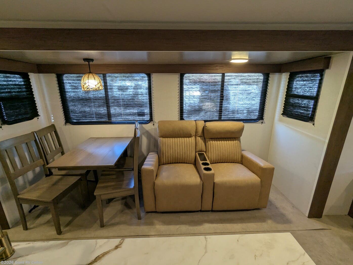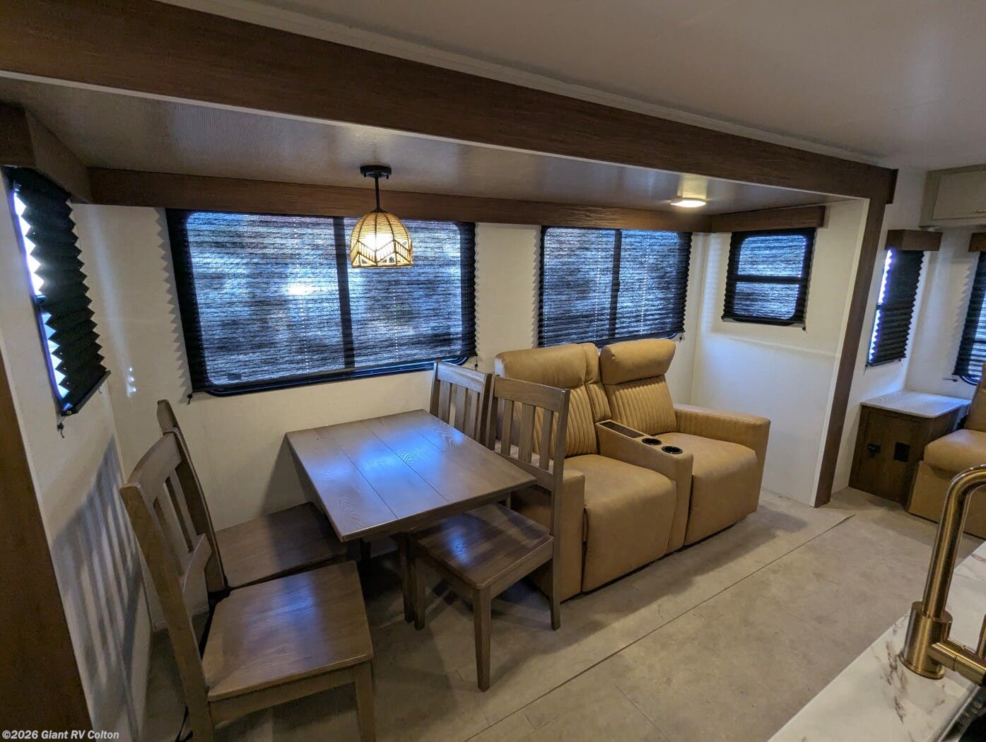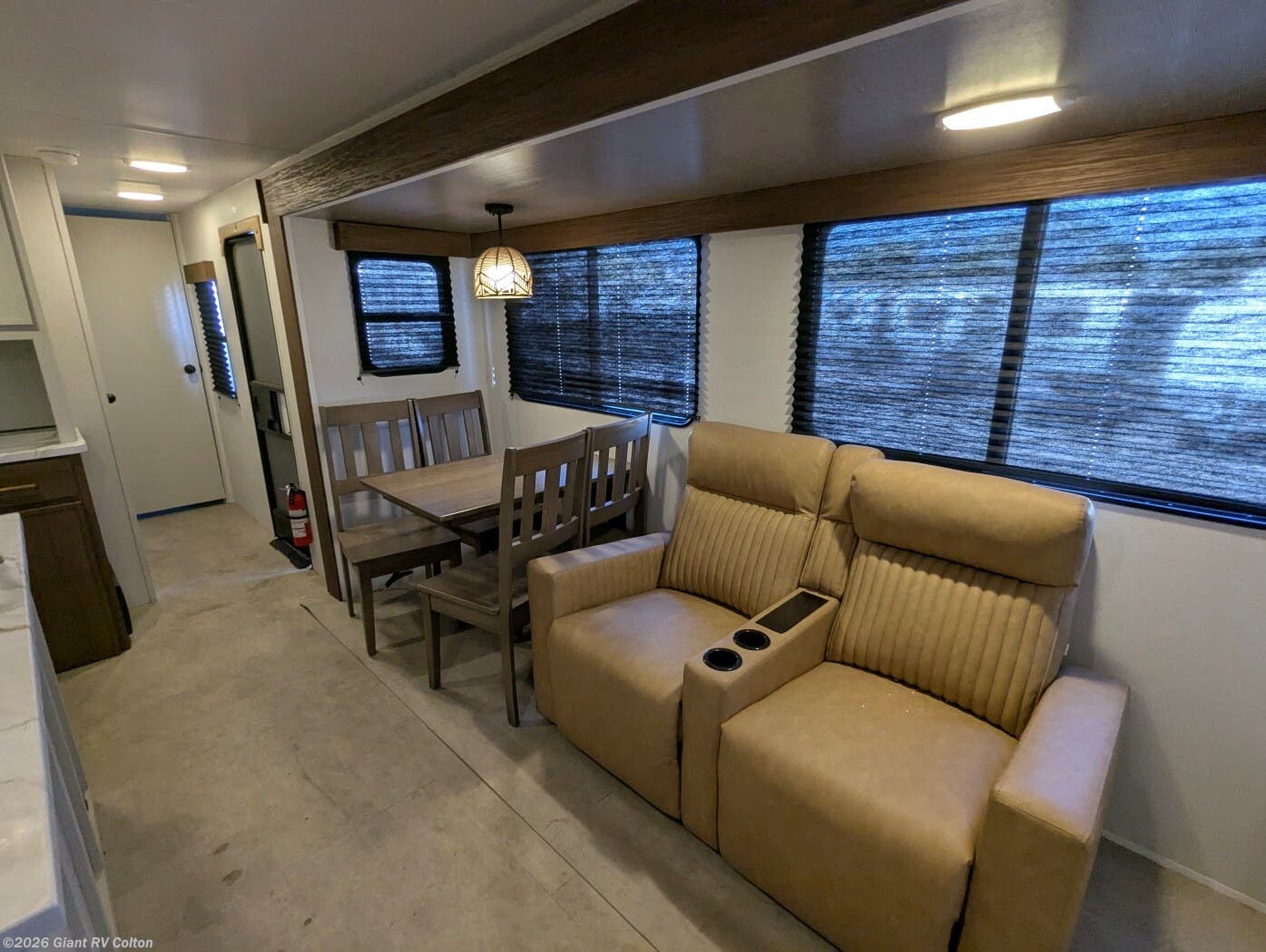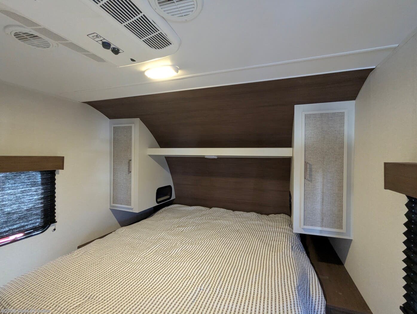 - Premium Amenities: Features air conditioning, a kitchen island with a 10 cu ft 12V refrigerator, microwave, and hidden pantry for convenience.