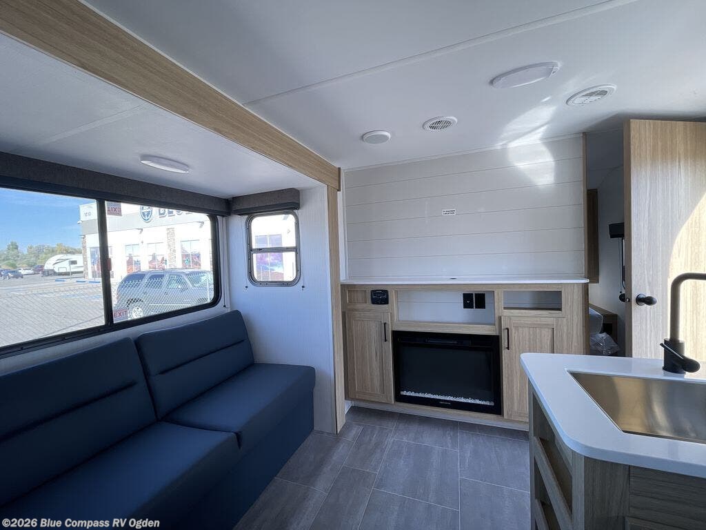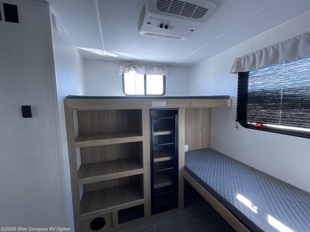 One look at this travel trailer and you'll be hooked! The front private bedroom with a queen bed provides a place for you to retreat to each night, and the full bath will let you freshen up in the morning. One of the dual entry doors is even found in the bath for added convenience! The little ones or your guests will have the bunkhouse to themselves with a total of four bunks and chairs below the flip-up bunk so they can relax. A full kitchen, complete with a three burner cooktop, microwave oven, and farmhouse sink will be perfect for meal times, or you can head outdoors to cook at the outdoor kitchen. In the evening, you can relax on the sofa or play a game at the booth dinette!
