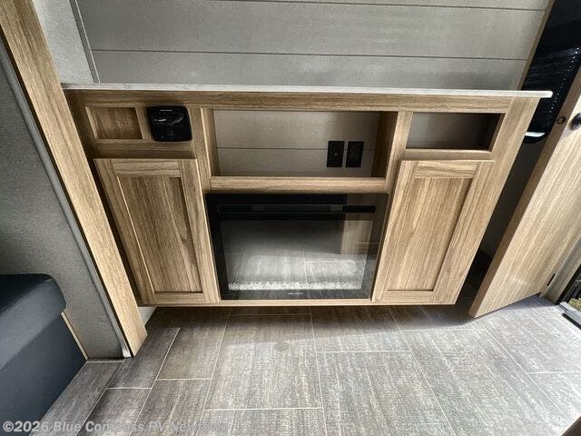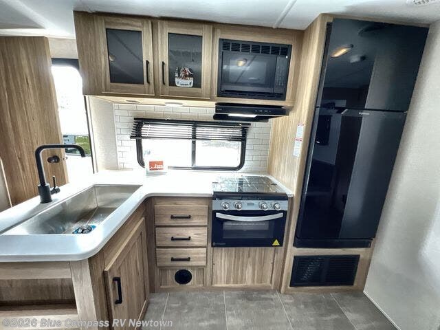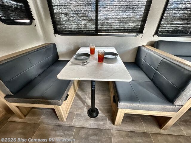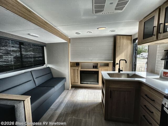 One look at this travel trailer and you'll be hooked! The front private bedroom with a queen bed provides a place for you to retreat to each night, and the full bath will let you freshen up in the morning. One of the dual entry doors is even found in the bath for added convenience! The little ones or your guests will have the bunkhouse to themselves with a total of four bunks and chairs below the flip-up bunk so they can relax. A full kitchen, complete with a three burner cooktop, microwave oven, and farmhouse sink will be perfect for meal times, or you can head outdoors to cook at the outdoor kitchen. In the evening, you can relax on the sofa or play a game at the booth dinette!
