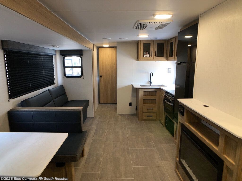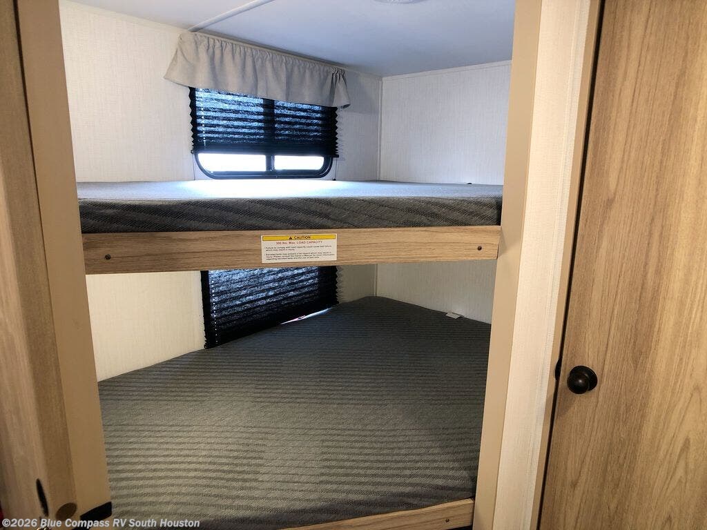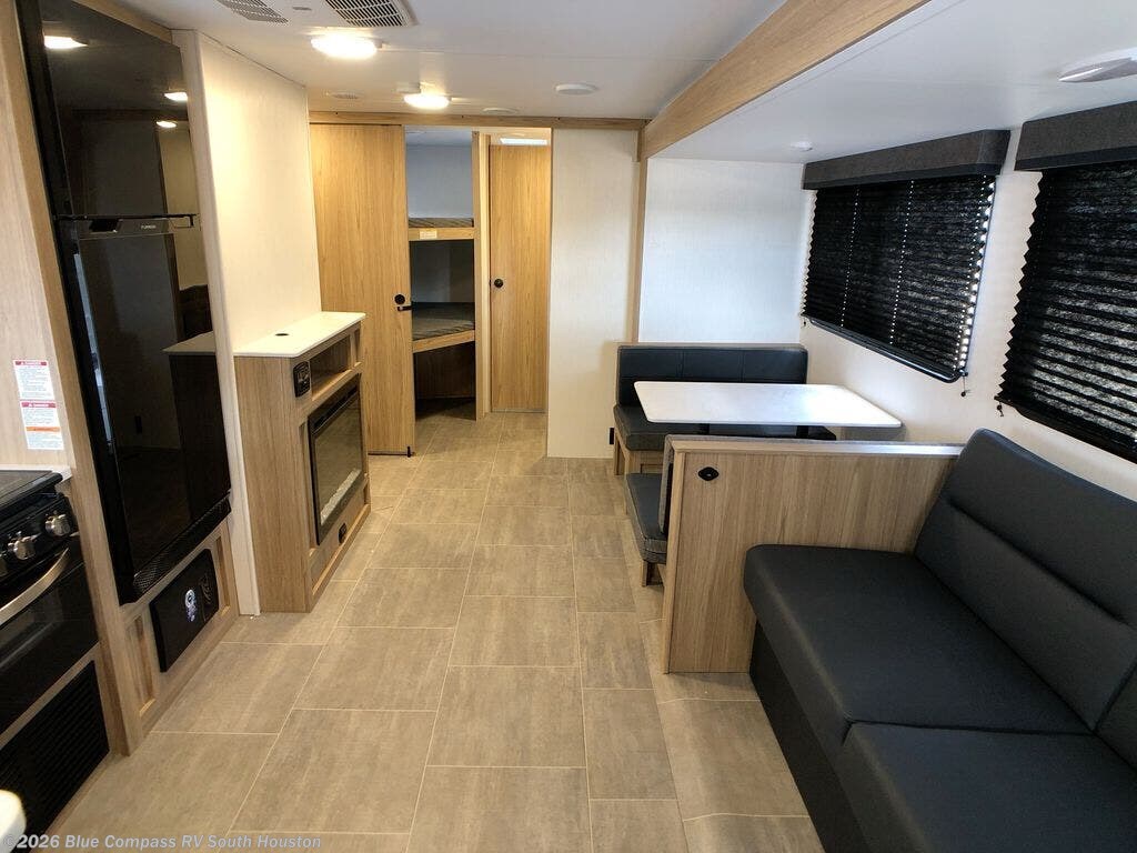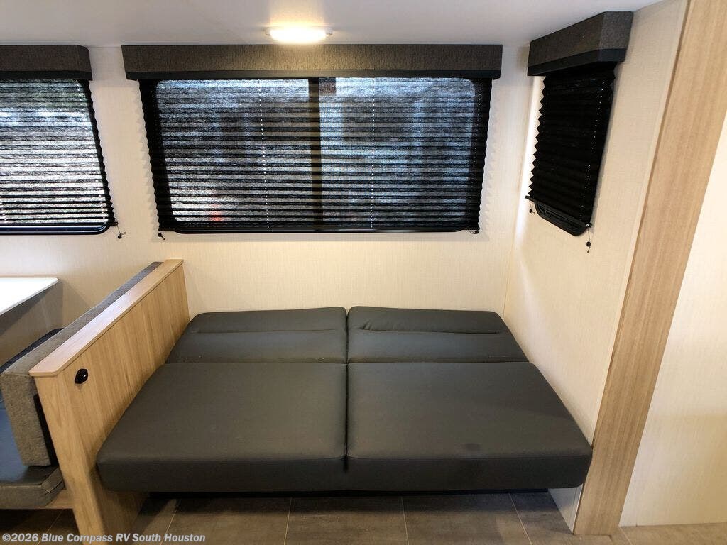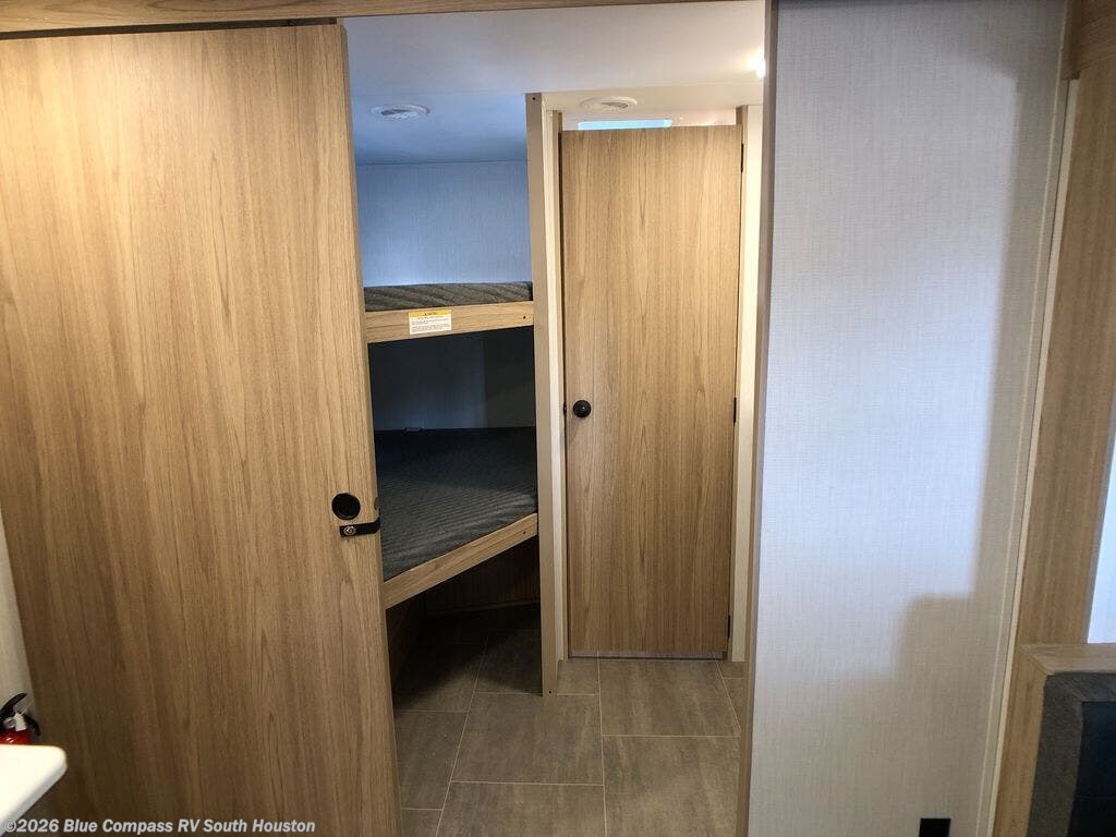One look at this travel trailer and you'll be hooked! The front private bedroom with a queen bed provides a place for you to retreat to each night, and the full bath will let you freshen up in the morning. The little ones or your guests will have the bunkhouse suite to themselves with double-size bunks, a dresser, and a half bath; how convenient! A full kitchen, complete with a three burner cooktop, microwave oven, and farmhouse sink will be perfect for meal times, or you can head outdoors to cook at the outdoor kitchen. In the evening, you can relax on the sofa or play a game at the booth dinette!