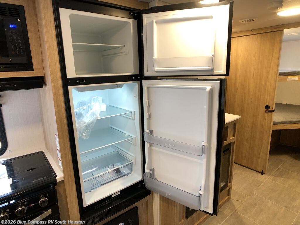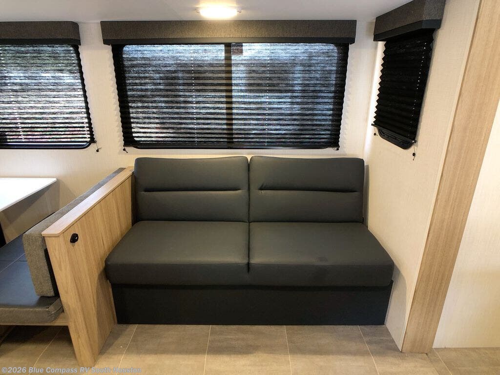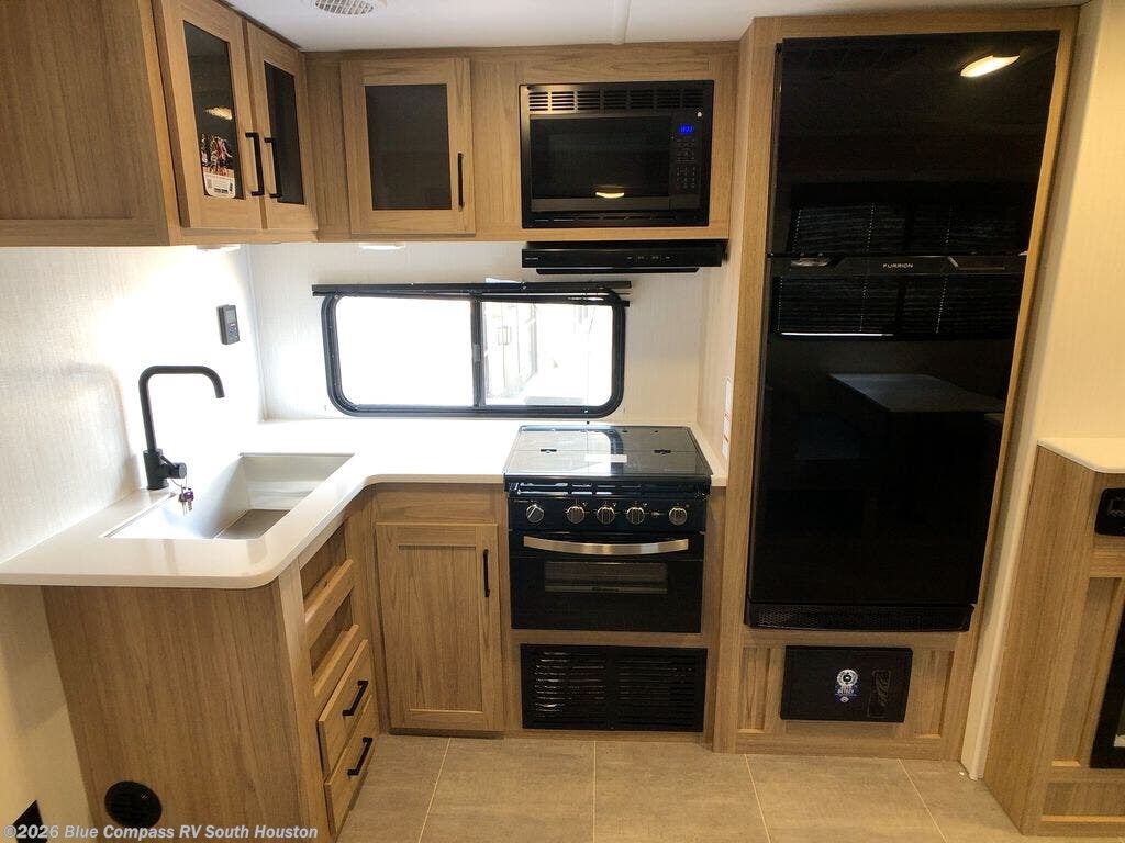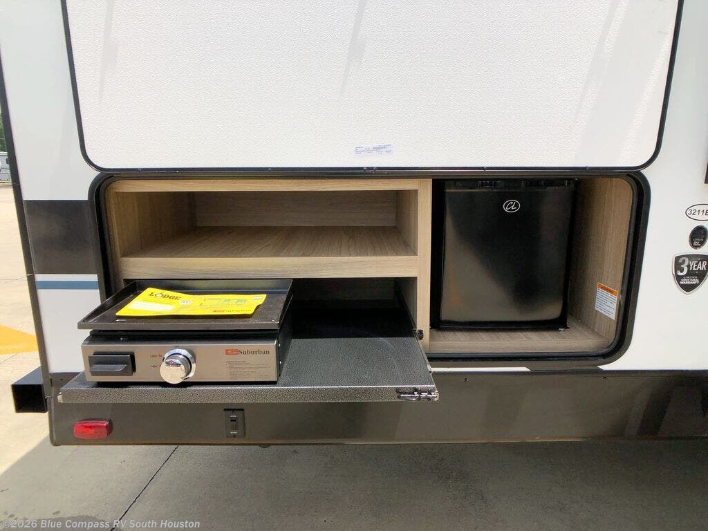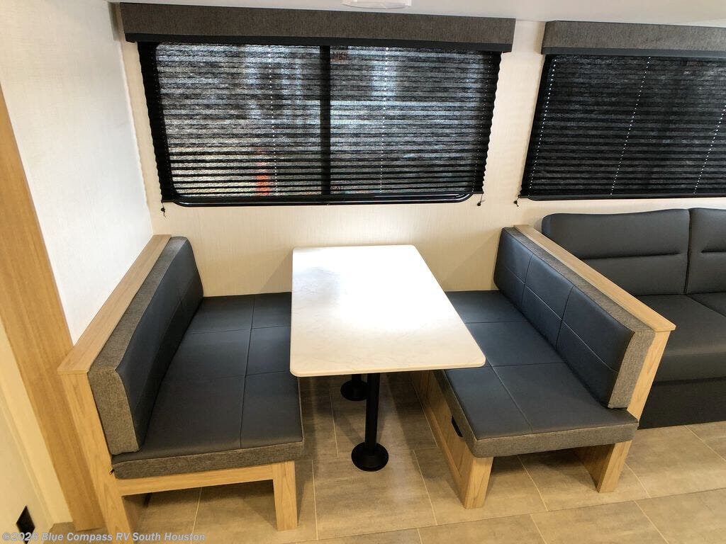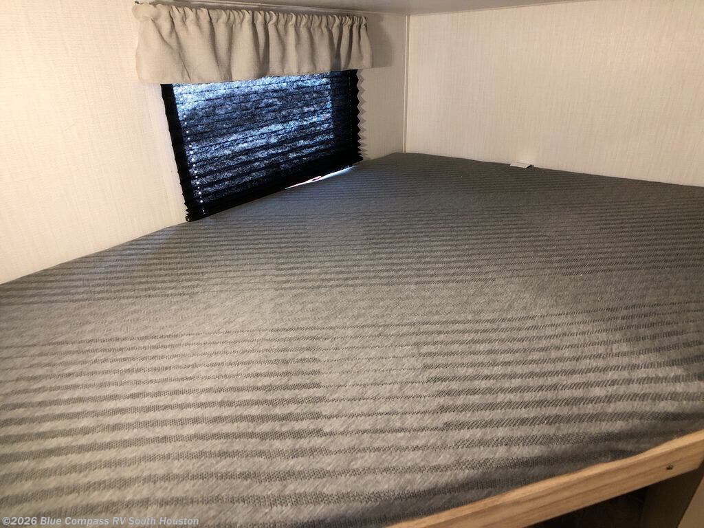 One look at this travel trailer and you'll be hooked! The front private bedroom with a queen bed provides a place for you to retreat to each night, and the full bath will let you freshen up in the morning. The little ones or your guests will have the bunkhouse suite to themselves with double-size bunks, a dresser, and a half bath; how convenient! A full kitchen, complete with a three burner cooktop, microwave oven, and farmhouse sink will be perfect for meal times, or you can head outdoors to cook at the outdoor kitchen. In the evening, you can relax on the sofa or play a game at the booth dinette!