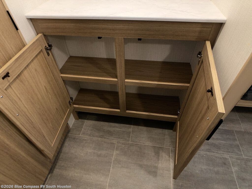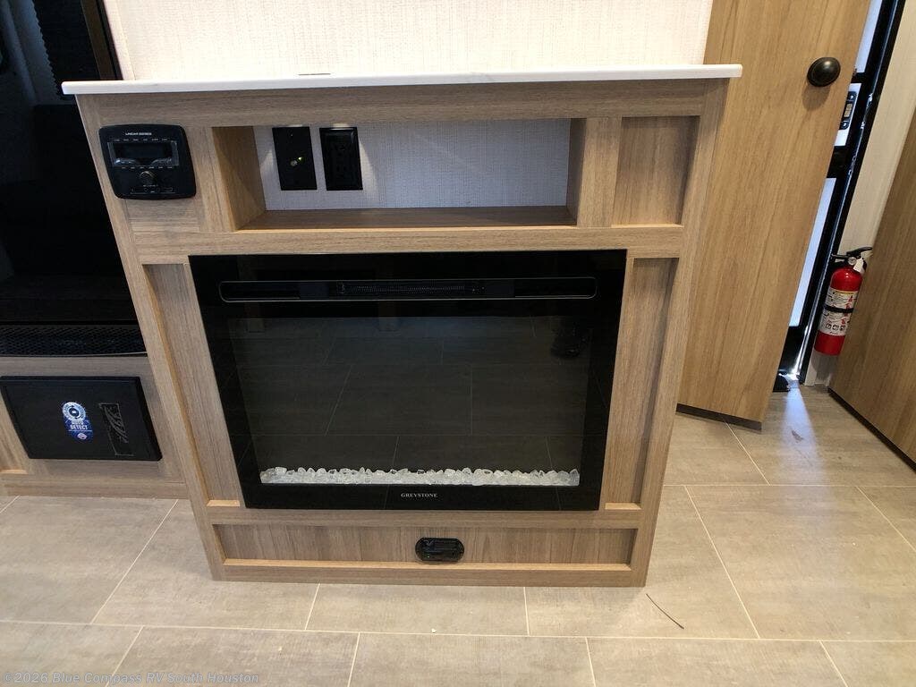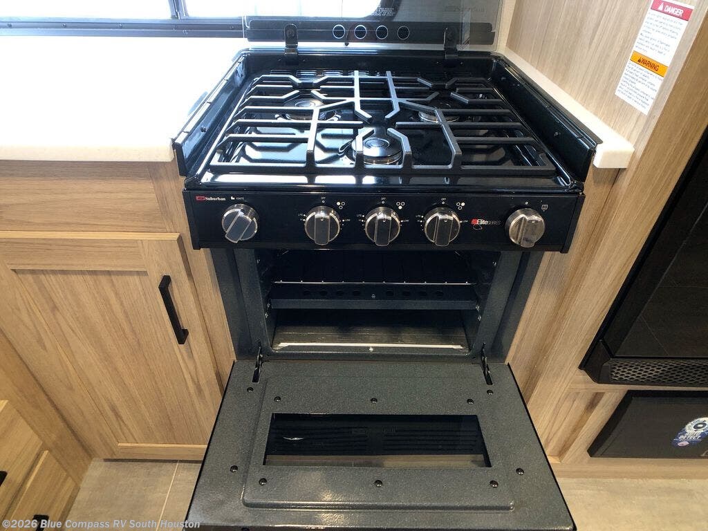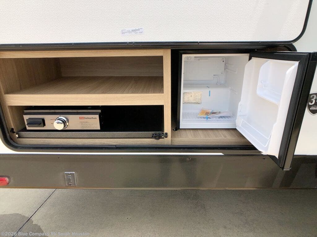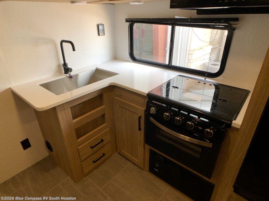 One look at this travel trailer and you'll be hooked! The front private bedroom with a queen bed provides a place for you to retreat to each night, and the full bath will let you freshen up in the morning. The little ones or your guests will have the bunkhouse suite to themselves with double-size bunks, a dresser, and a half bath; how convenient! A full kitchen, complete with a three burner cooktop, microwave oven, and farmhouse sink will be perfect for meal times, or you can head outdoors to cook at the outdoor kitchen. In the evening, you can relax on the sofa or play a game at the booth dinette!
