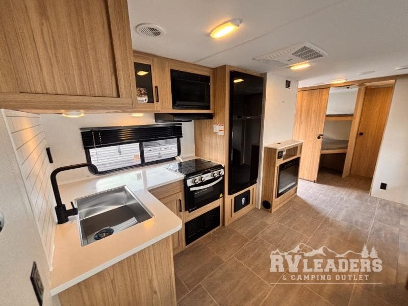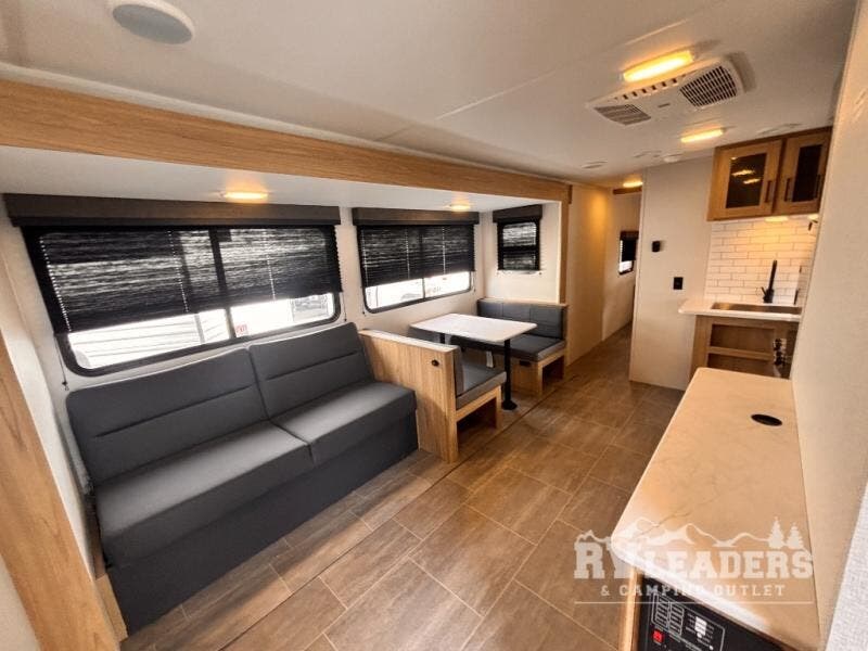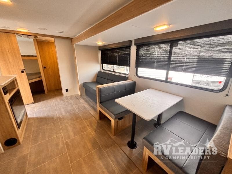 One look at this travel trailer and you'll be hooked! The front private bedroom with a queen bed provides a place for you to retreat to each night, and the full bath will let you freshen up in the morning. The little ones or your guests will have the bunkhouse suite to themselves with double-size bunks, a dresser, and a half bath; how convenient! A full kitchen, complete with a three burner cooktop, microwave oven, and farmhouse sink will be perfect for meal times, or you can head outdoors to cook at the outdoor kitchen. In the evening, you can relax on the sofa or play a game at the booth dinette!