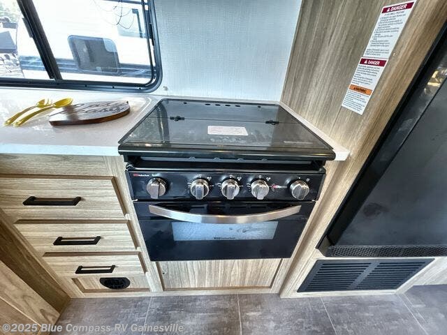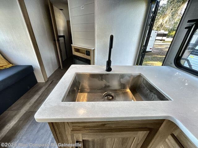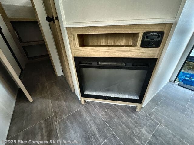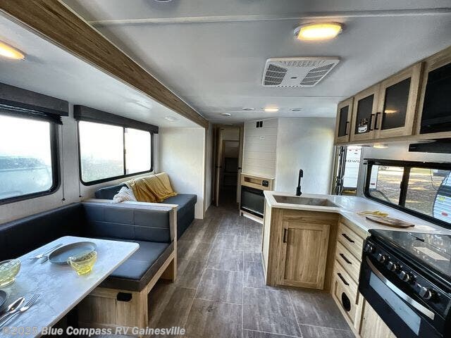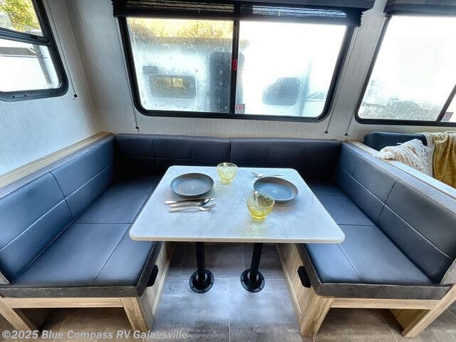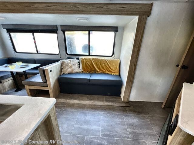 Camping just got a whole lot sweeter in this double slide out travel trailer for nine people. Your guests can stay in the front private bunkhouse that includes double-size bunks with removable lower bunks so you can easily pack in gear! You will enjoy the rear private bedroom with a queen bed slide out, a wardrobe, plus a dresser with TV prep. The main living area is spacious with its large slide out, and everyone can dine around the U-shaped dinette. There is also a sofa here and an entertainment center with a fireplace. Bring your own TV and you're ready for movie night! And check out the outdoor kitchen with a griddle for a pancake breakfast!