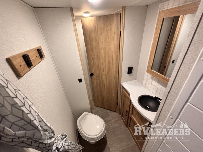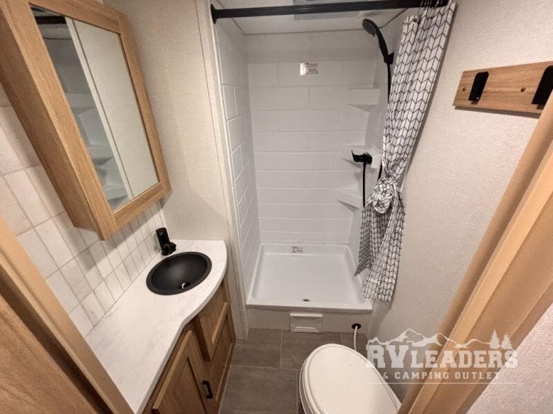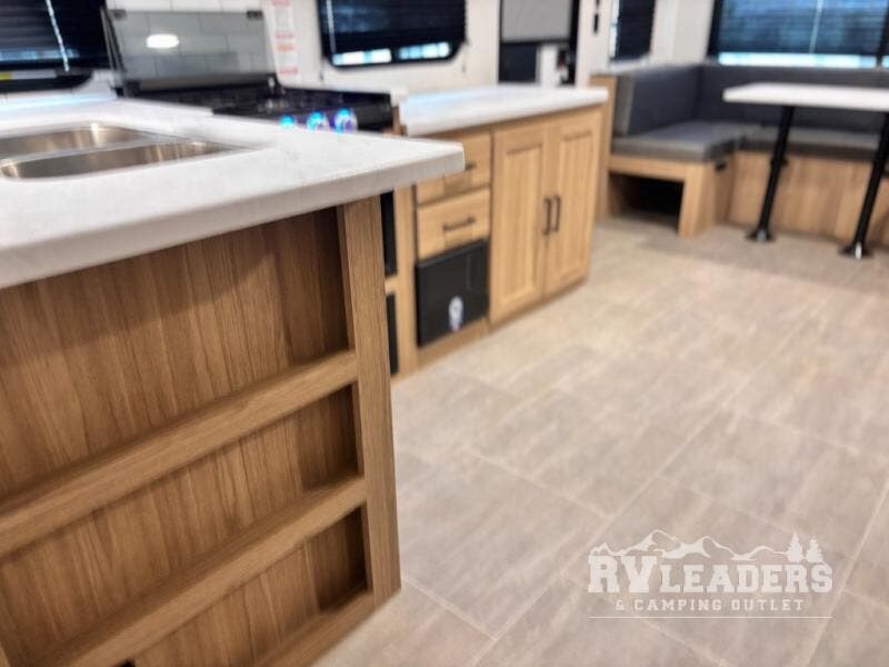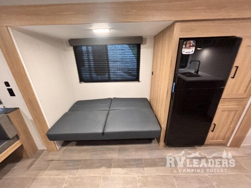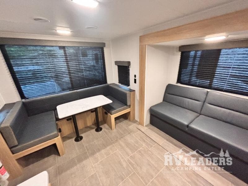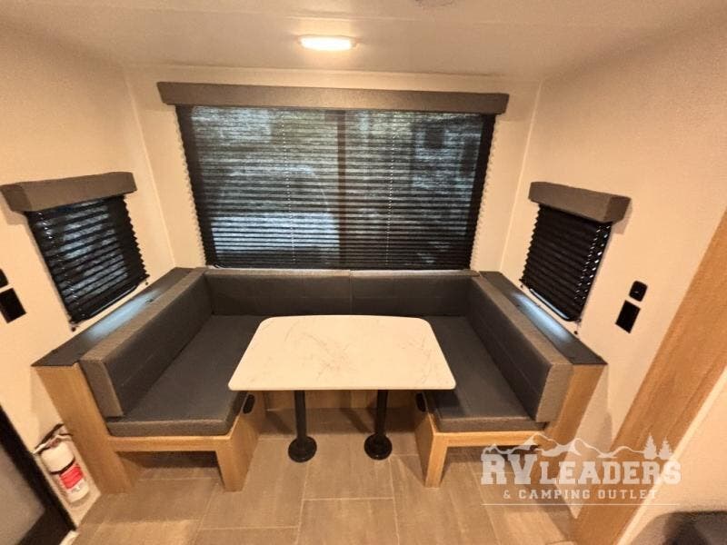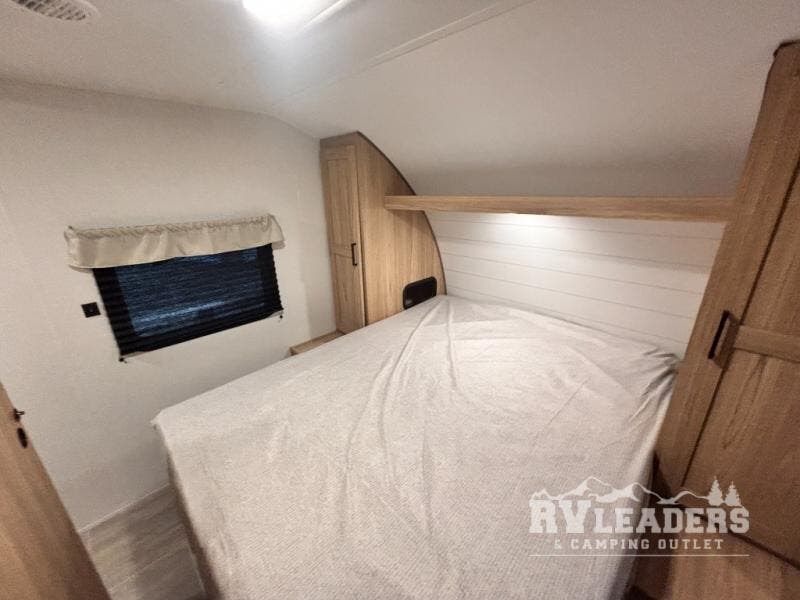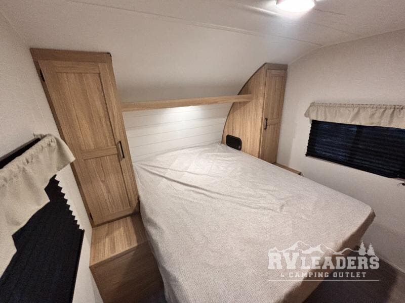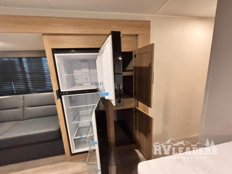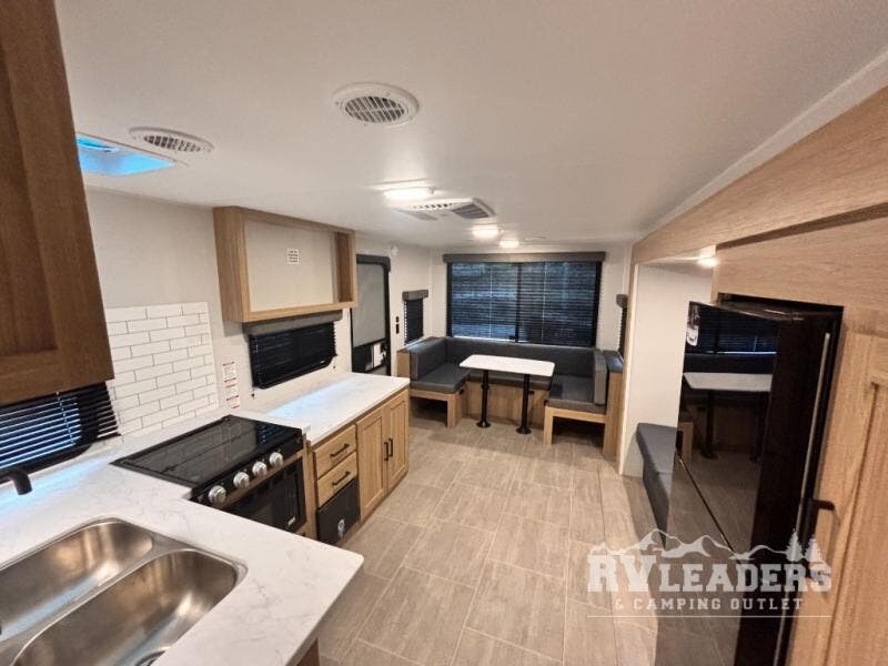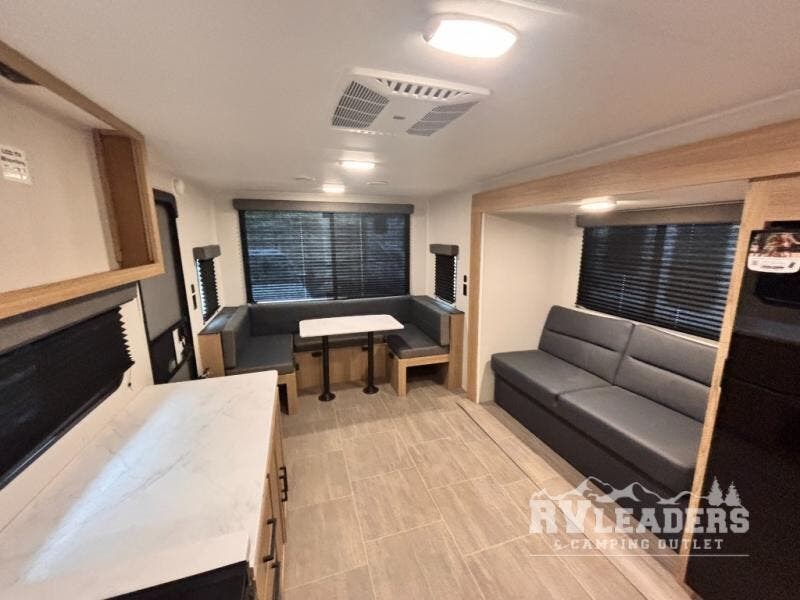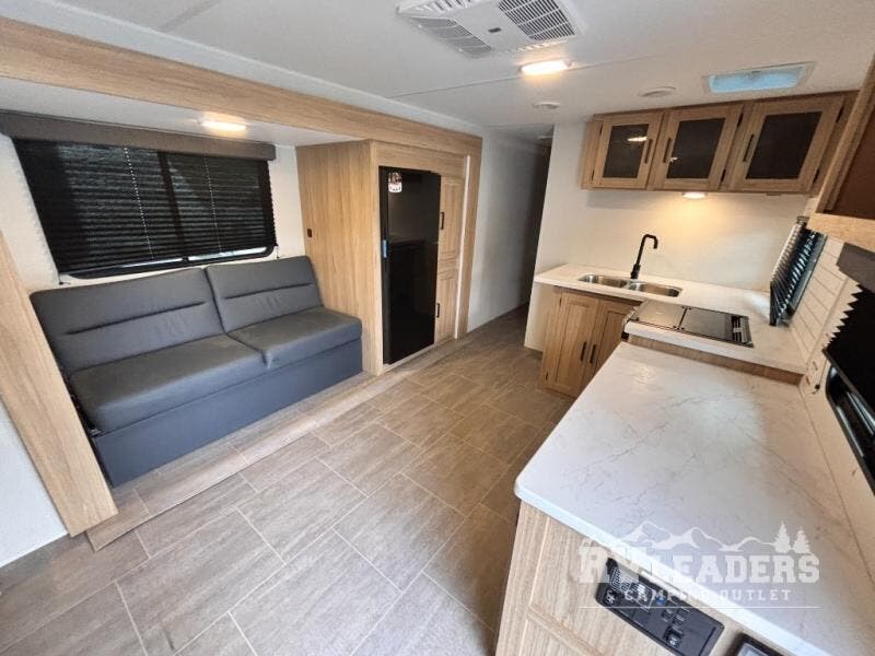 Head to your favorite camping spot in this single slide out travel trailer. You'll find the sofa within the large slide, along with the 12V refrigerator and pantry for food storage. Once dinner is made on the cooktop, your crew can dine around the U-shaped dinette. A spacious full bath will let you freshen up each day, and the front private bedroom is sure to make you feel at home. There is a queen bed, dual bedside wardrobes, plus a third bedroom wardrobe so nothing gets left behind!