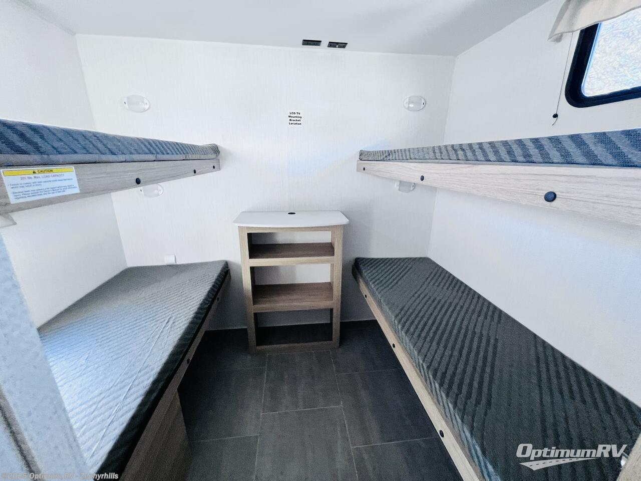 The littles ones will love camping in this travel trailer since there is a rear private bunkhouse with four bunks, a wardrobe, plus shelves to keep their things tidy. A full kitchen, complete with a cooktop, microwave, and 12V refrigerator will let you cook and store food, and a booth dinette provides a place to dine together. There is also a sofa where you can relax in the evenings if you're not outdoors under the 17' power awning. And when it's time to call it a night, you can head to the front private bedroom for a great night's rest on the queen bed!