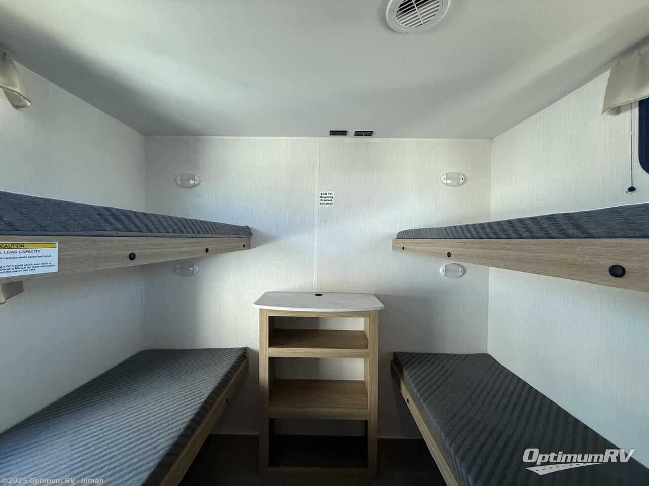 The littles ones will love camping in this travel trailer since there is a rear private bunkhouse with four bunks, a wardrobe, plus shelves to keep their things tidy. A full kitchen, complete with a cooktop, microwave, and 12V refrigerator will let you cook and store food, and a booth dinette provides a place to dine together. There is also a sofa where you can relax in the evenings if you're not outdoors under the 17' power awning. And when it's time to call it a night, you can head to the front private bedroom for a great night's rest on the queen bed!