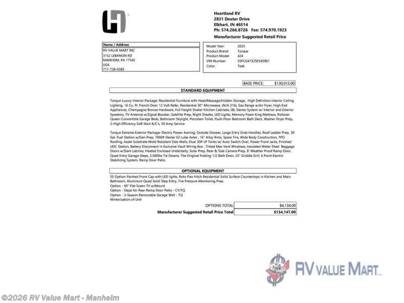 Request More Info on this 2025 Heartland Torque 424 Offered for sale by RV Value Mart - Manheim