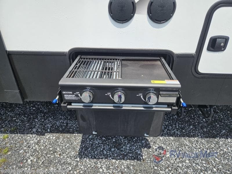 You have everything you need in this toy hauler! The 14' garage area has a half bathroom, an electric queen bed with convertible sofa below it, and one of the dual entry doors to the unit. The chef can prepare their best home cooked meals either indoors with the three burner cooktop or head to the outdoor Griddle & Go, and the outdoor sink will allow them to wash up before starting dinner. Freshen up in the dual entry bathroom with the spacious tub which has a skylight above to bring the outdoors inside and it leads directly into the front master suite which has a king bed slide and a wardrobe slide to keep your clothes looking their best!