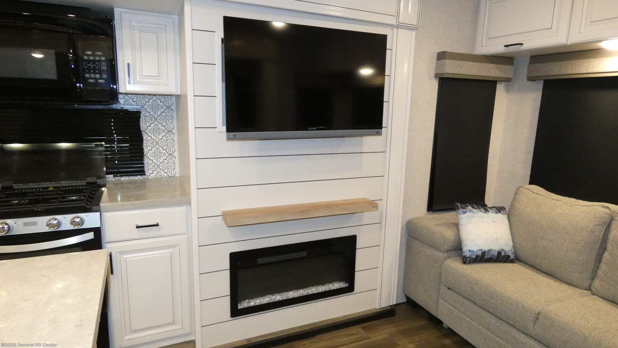 Step into the 2025 Highland Ridge Open Range 322RLS, where comfort meets luxury in a spacious design perfect for adventurous couples or small families. This model is thoughtfully crafted with a rear living area that features a cozy theater seat and a tri-fold sofa, creating the perfect environment for relaxation or entertaining guests. The entertainment center, complete with a fireplace, adds warmth and charm, making it a delightful spot to unwind after a day of exploration. The center kitchen is a chef's dream, equipped with a full-size electric refrigerator, a three-burner cooktop, and a convenient island that promises ample space for meal preparation. As you move towards the front of the RV, you'll find a serene bedroom sanctuary featuring a plush queen bed, with the option for a king, ensuring a restful night's sleep. The center bath offers a practical layout with a shower enclosed in plastic and glass, providing both functionality and style. With a washer/dryer prep area, this RV is designed for extended stays, making it easy to bring all the comforts of home on the road. The dual power awnings extend your living space outdoors, perfect for enjoying the scenery or hosting a barbecue with the exterior grill hookup. Experience the perfect blend of luxury and practicality with the Open Range 322RLS, where every journey becomes an unforgettable adventure. For more details, visit your nearest General RV dealership.