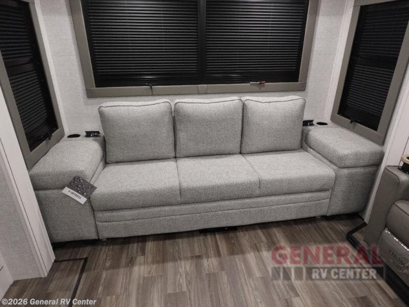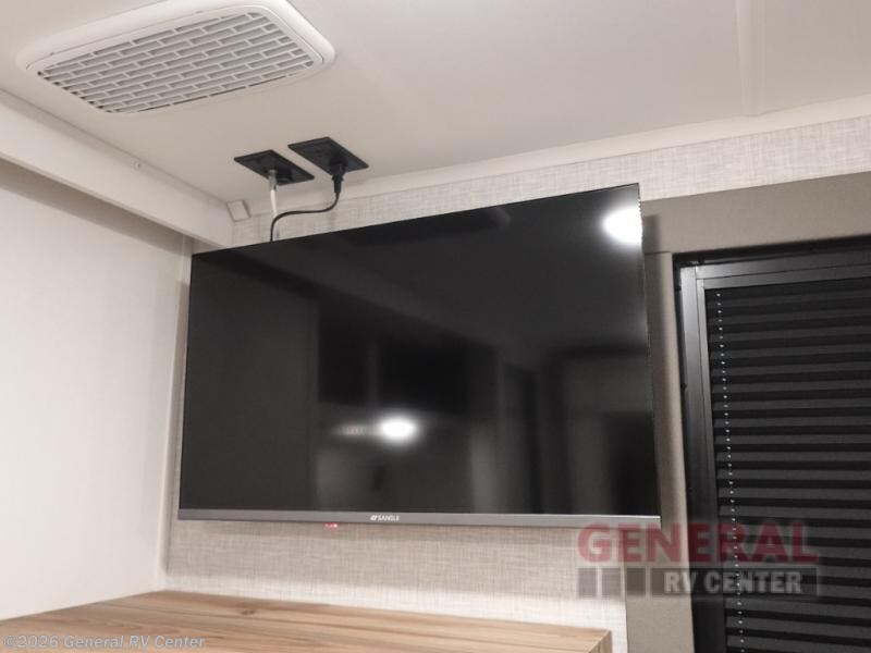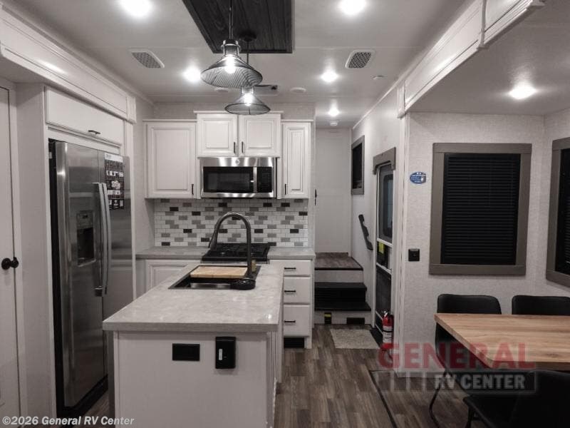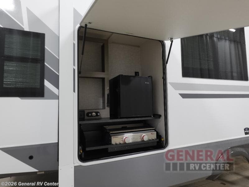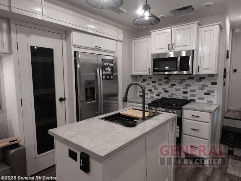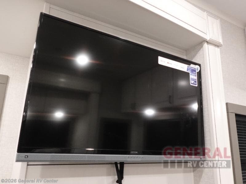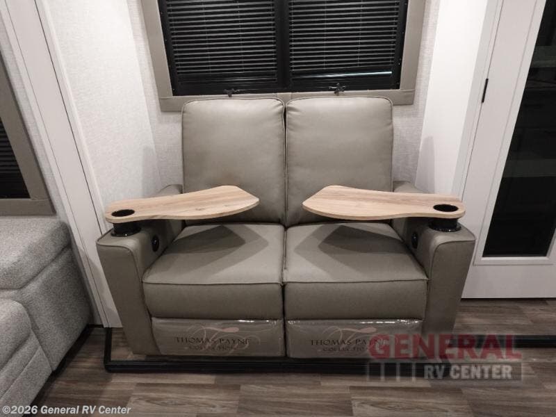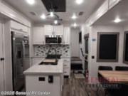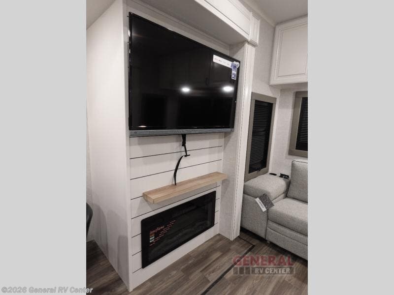 You will love the great space and layout in this amazing fifth wheel! The rear living area features theater seats as well as a tri-fold sofa with adjustable headrests. It's the perfect place to watch a movie on the 40" Smart TV located in the entertainment center with fireplace! The kitchen includes a full suite of GE residential appliances, including a 4-burner range, 21 cu. ft. refrigerator, and over-the range microwave. Also standard are a dishwasher and central vacuum system so cleaning up is easy! At night retire to the bedroom with its king bed with power base. A second TV lets you watch your favorite shows as you fall asleep. Storage abounds including a full wardrobe and dresser with pull-out top. A dual-entry full bath is easily accessible and includes even more storage with a linen closet!