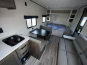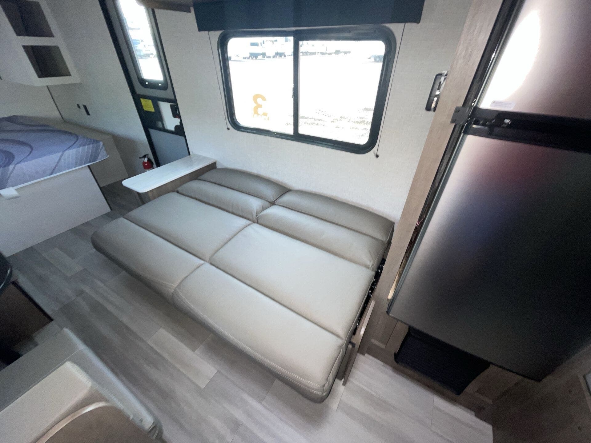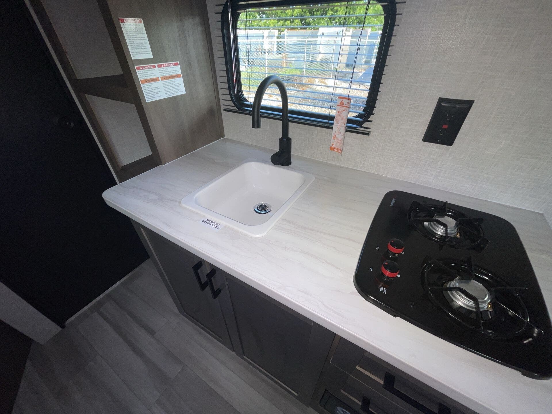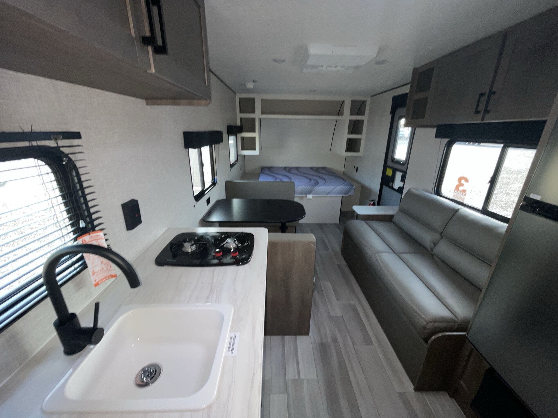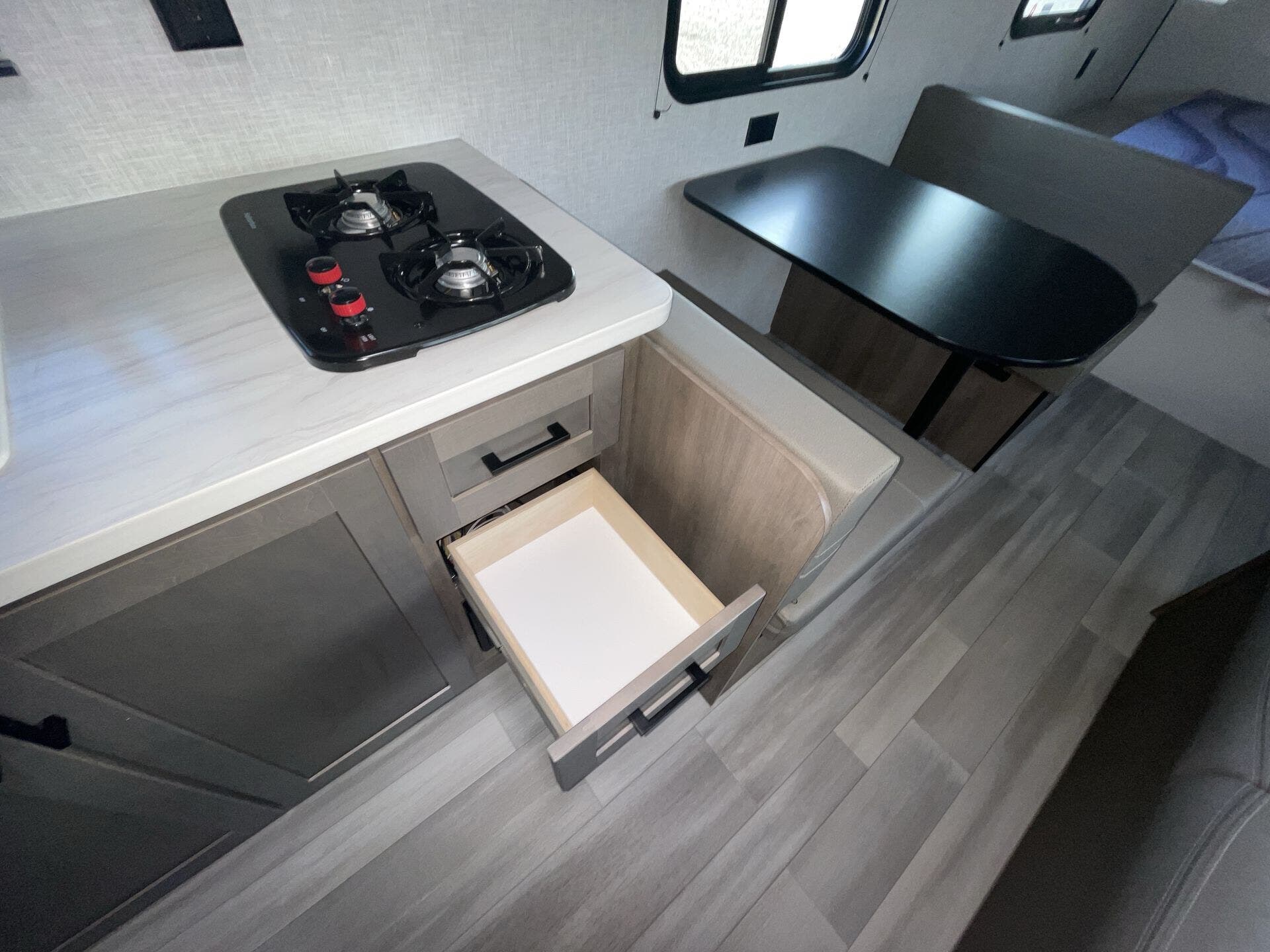 Inside, you’ll find thoughtful touches that make life on the road more enjoyable. The fully equipped kitchen includes a 10 cu. ft. refrigerator, a microwave, a two-burner cooktop, and ample counter space for meal prep. Residential vinyl flooring, LED lighting, and durable pressed membrane countertops add a modern, easy-to-clean feel, while plenty of storage compartments ensure that everyone’s gear has a place. Plus, the powerful A/C and furnace system keep you comfortable in all seasons.