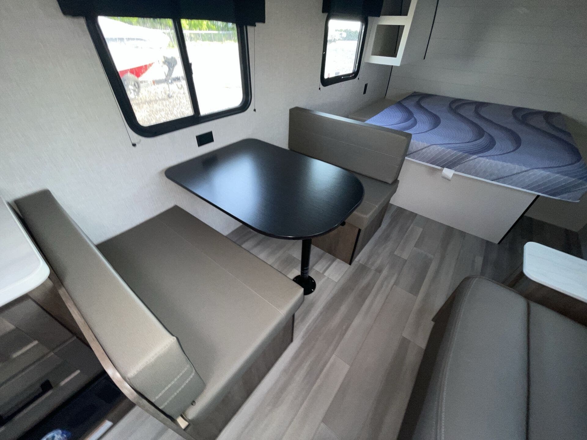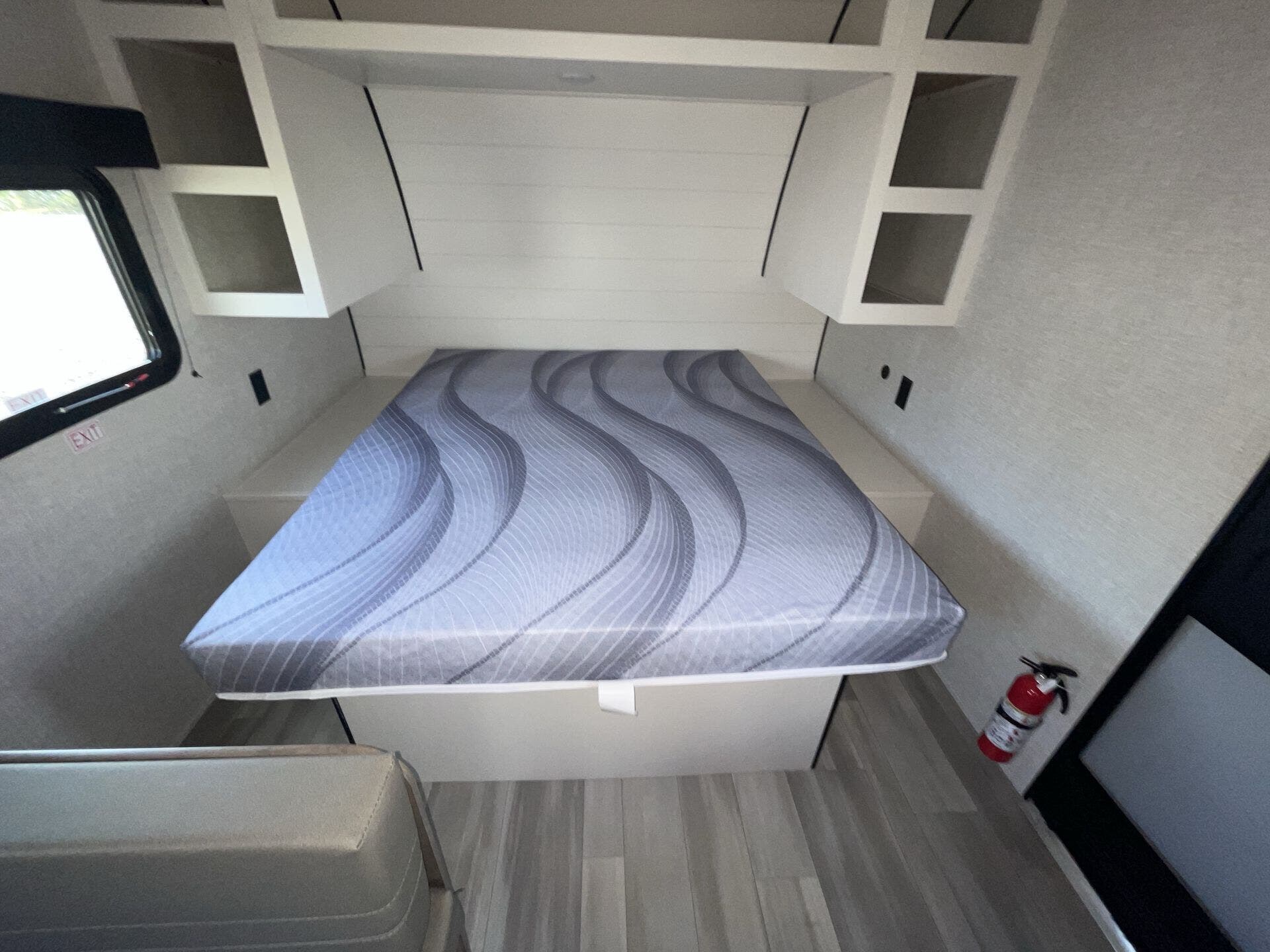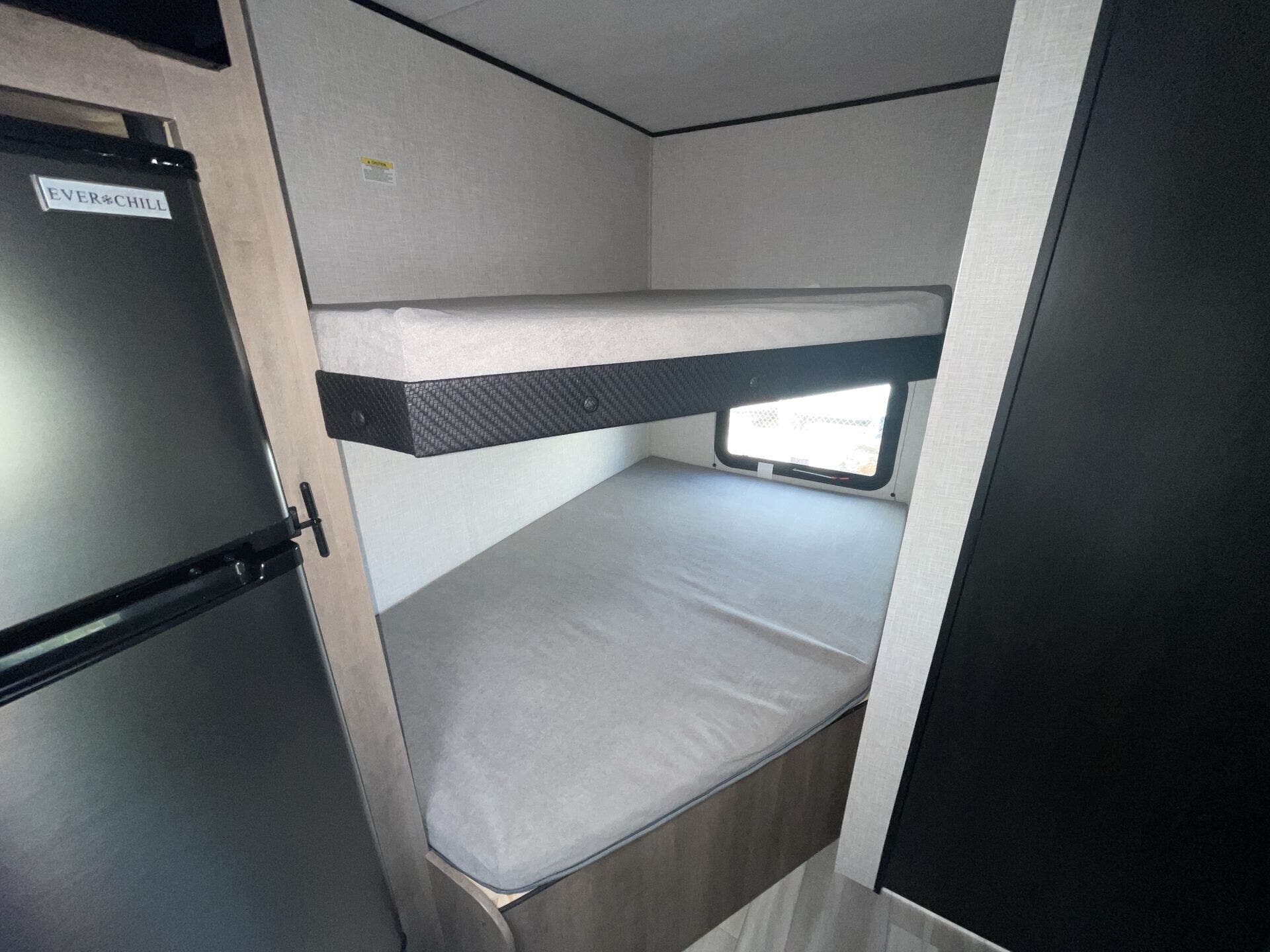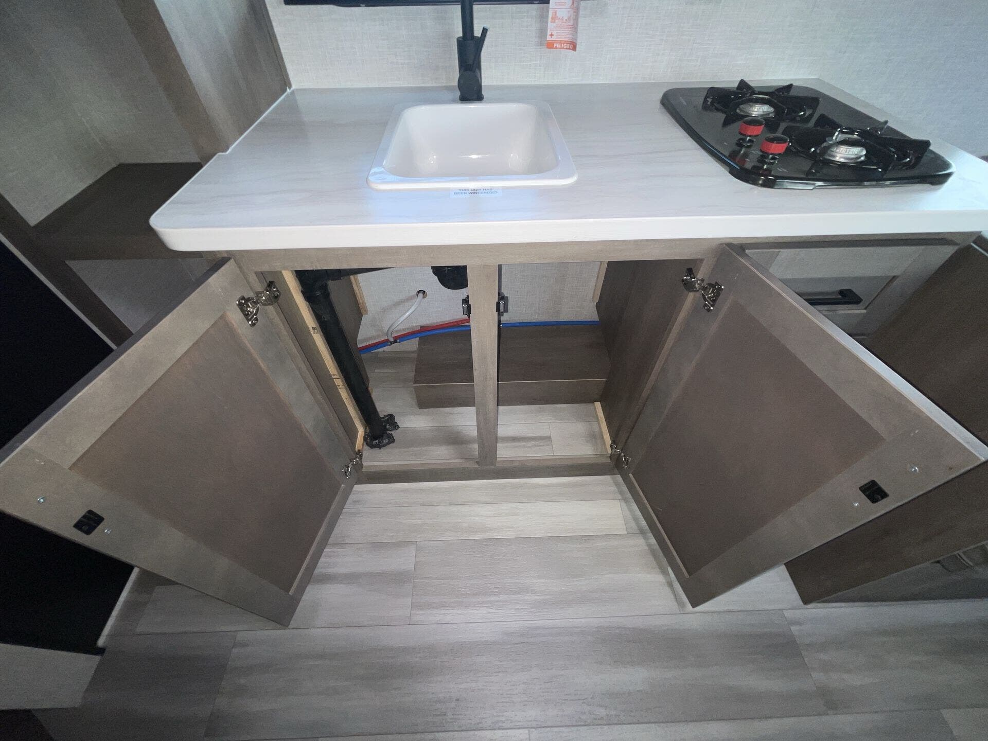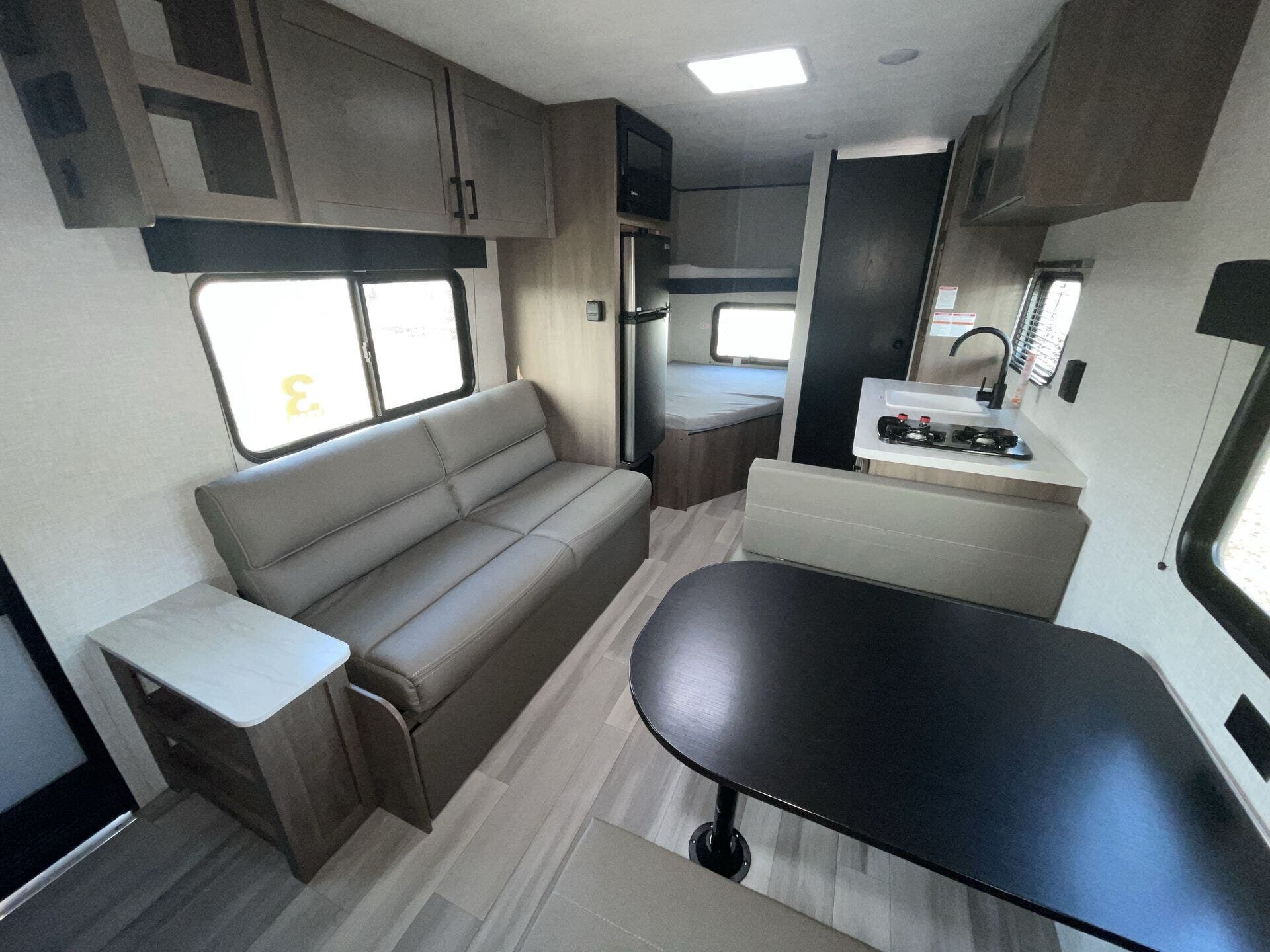 Inside, you’ll find thoughtful touches that make life on the road more enjoyable. The fully equipped kitchen includes a 10 cu. ft. refrigerator, a microwave, a two-burner cooktop, and ample counter space for meal prep. Residential vinyl flooring, LED lighting, and durable pressed membrane countertops add a modern, easy-to-clean feel, while plenty of storage compartments ensure that everyone’s gear has a place. Plus, the powerful A/C and furnace system keep you comfortable in all seasons.