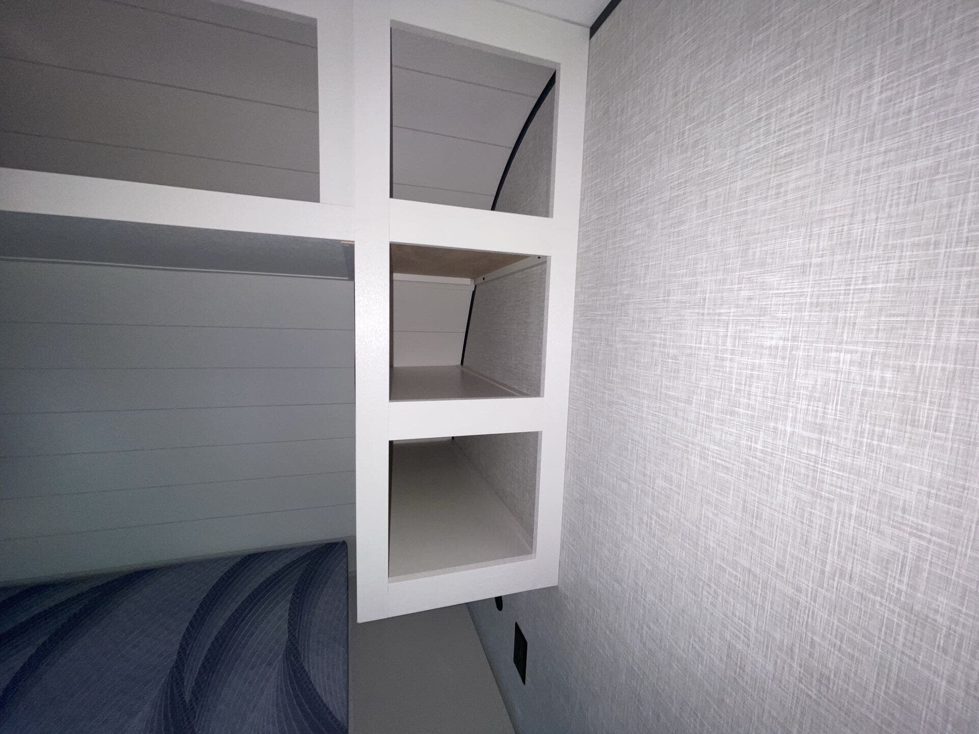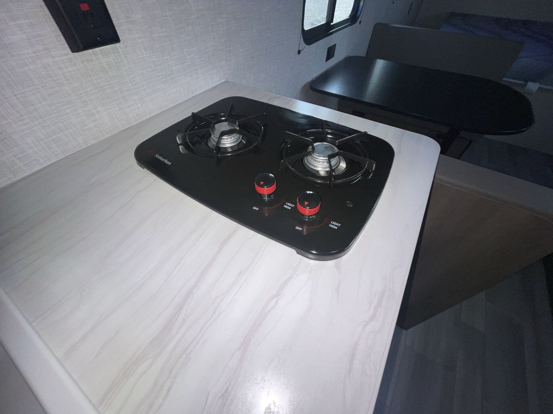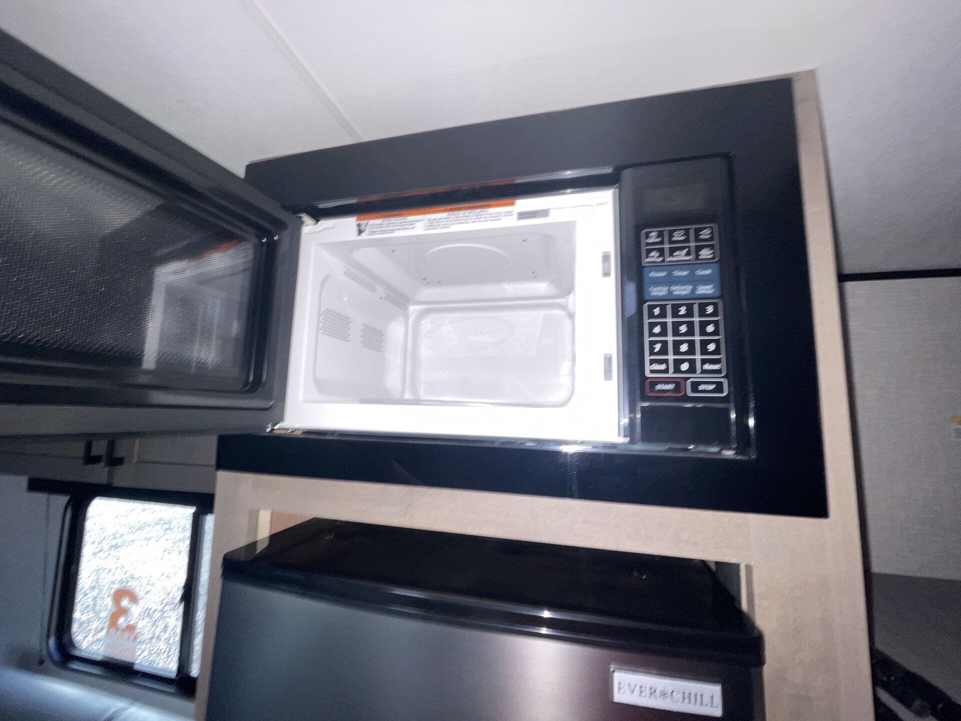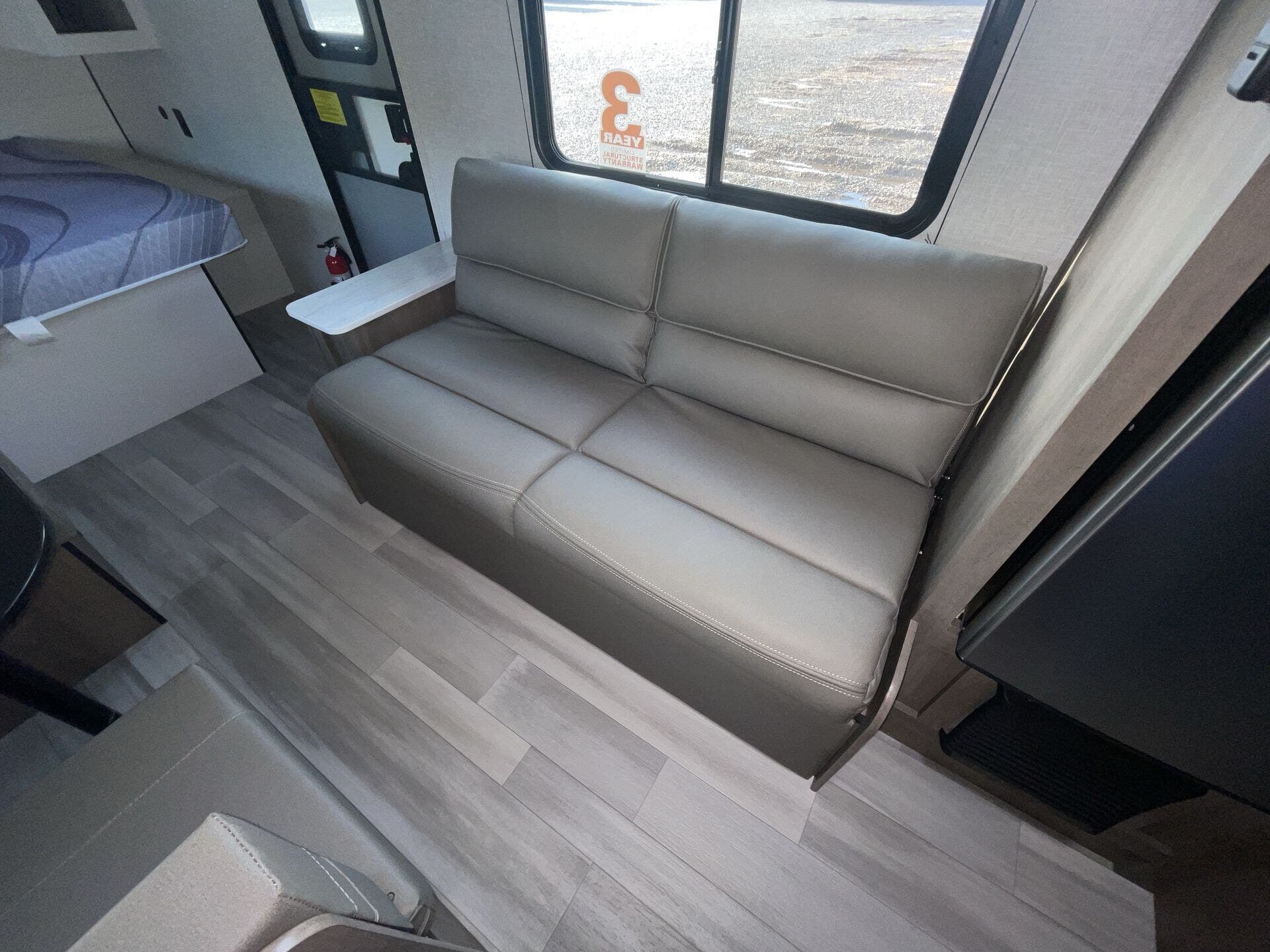 Inside, you’ll find thoughtful touches that make life on the road more enjoyable. The fully equipped kitchen includes a 10 cu. ft. refrigerator, a microwave, a two-burner cooktop, and ample counter space for meal prep. Residential vinyl flooring, LED lighting, and durable pressed membrane countertops add a modern, easy-to-clean feel, while plenty of storage compartments ensure that everyone’s gear has a place. Plus, the powerful A/C and furnace system keep you comfortable in all seasons.