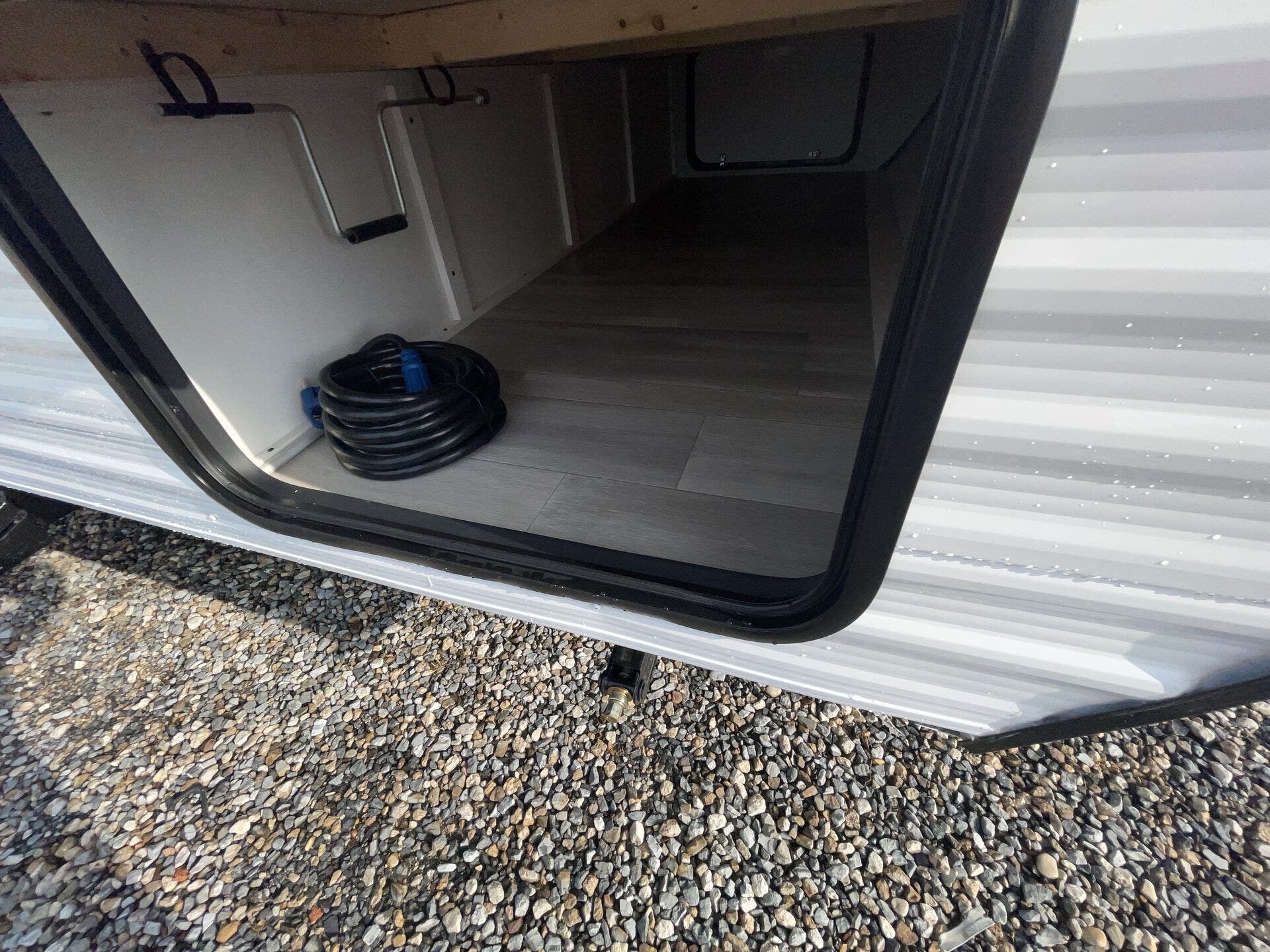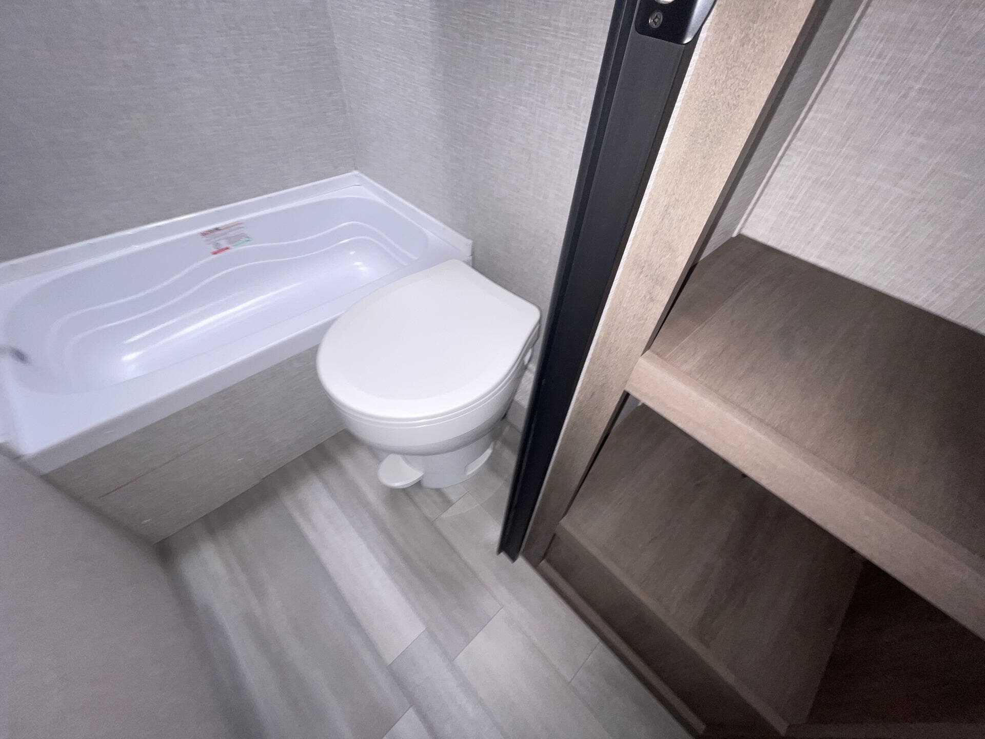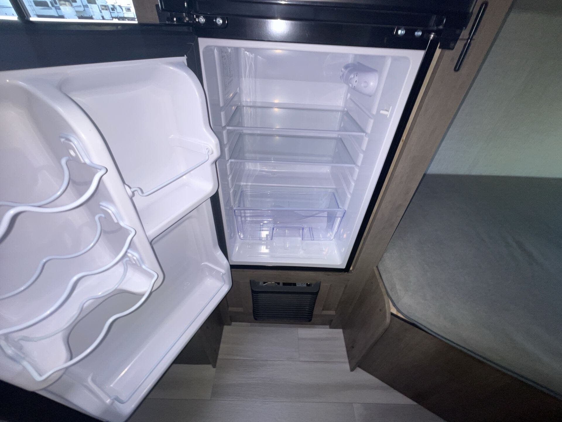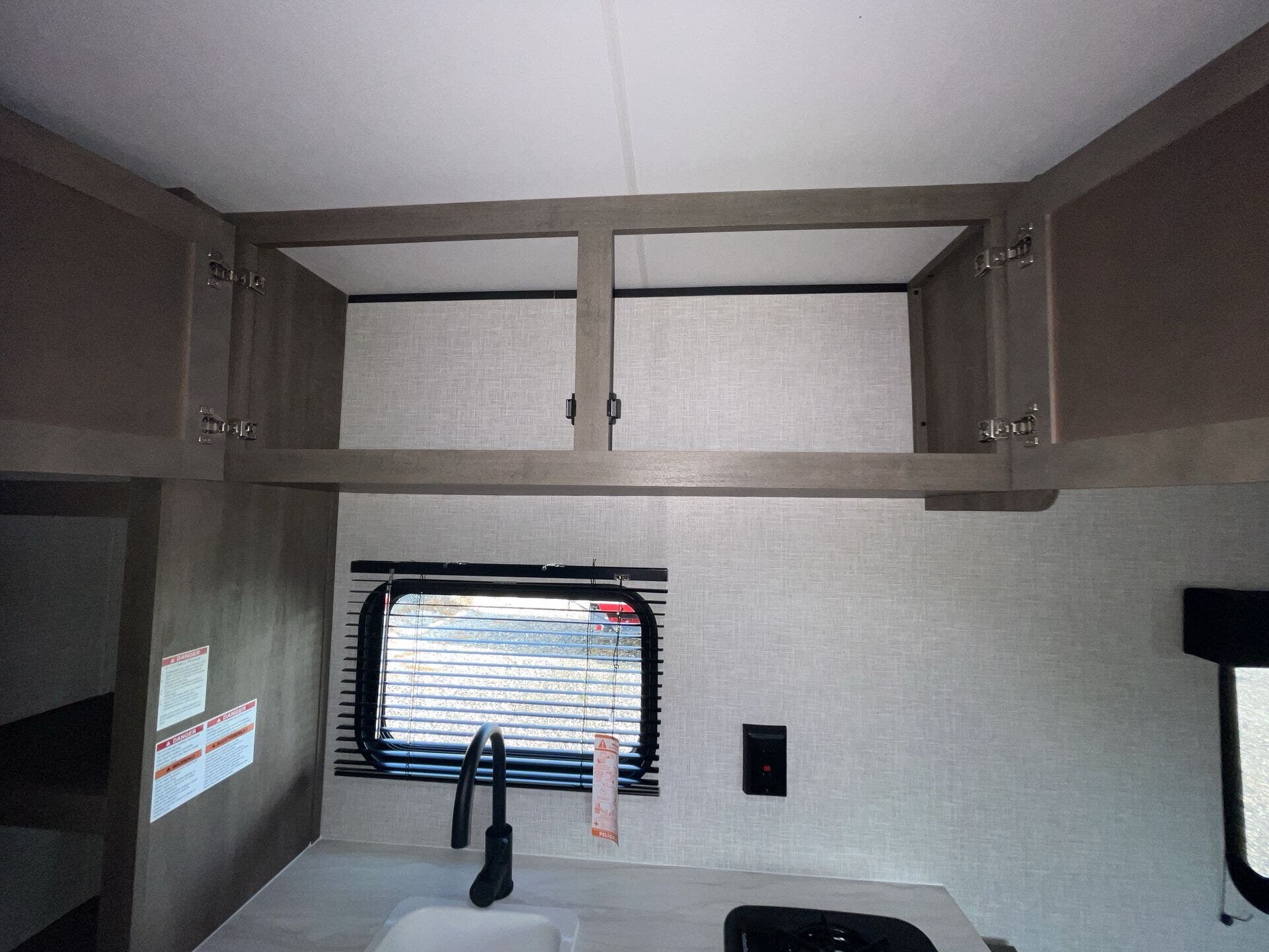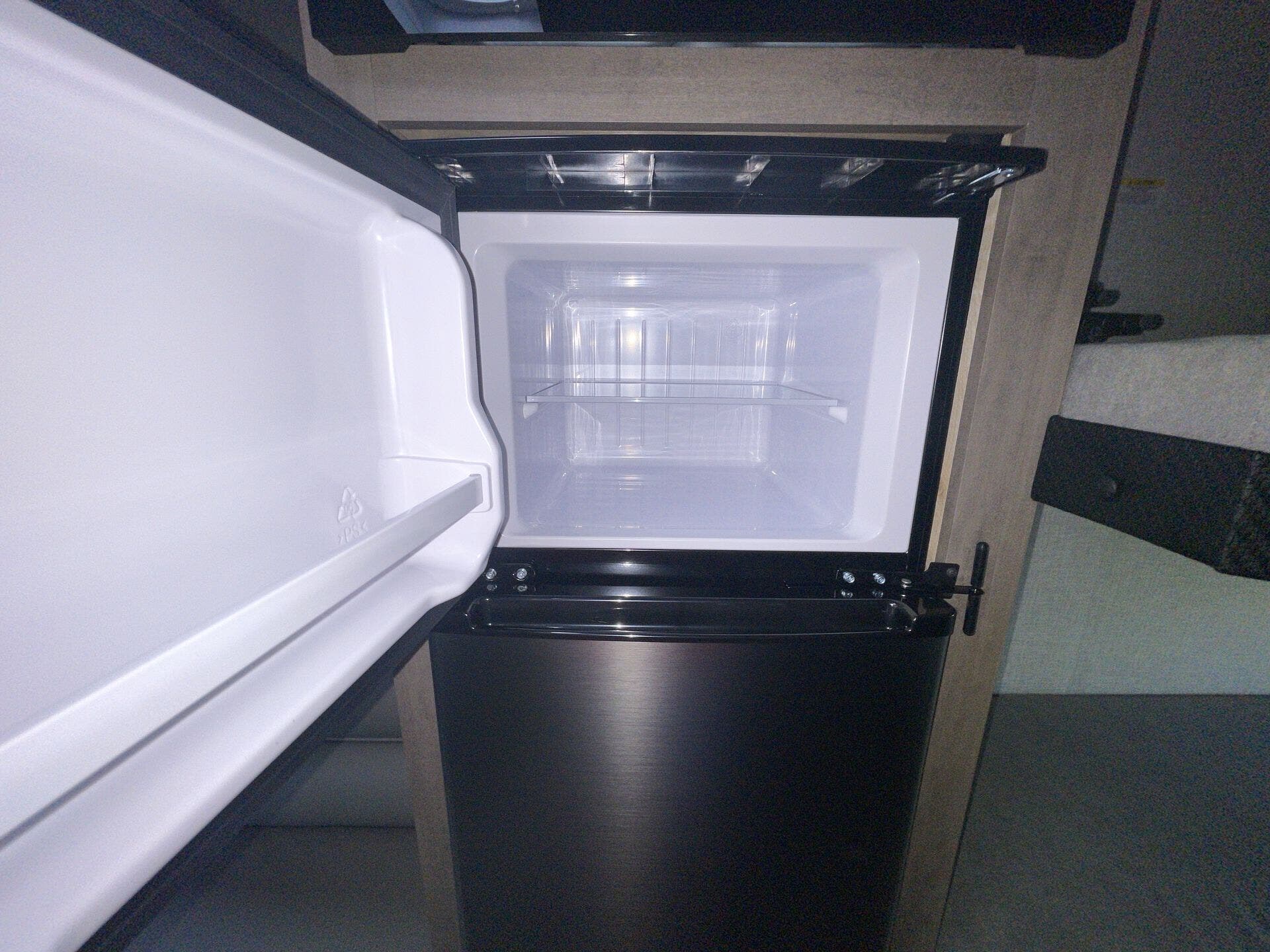 Inside, you’ll find thoughtful touches that make life on the road more enjoyable. The fully equipped kitchen includes a 10 cu. ft. refrigerator, a microwave, a two-burner cooktop, and ample counter space for meal prep. Residential vinyl flooring, LED lighting, and durable pressed membrane countertops add a modern, easy-to-clean feel, while plenty of storage compartments ensure that everyone’s gear has a place. Plus, the powerful A/C and furnace system keep you comfortable in all seasons.