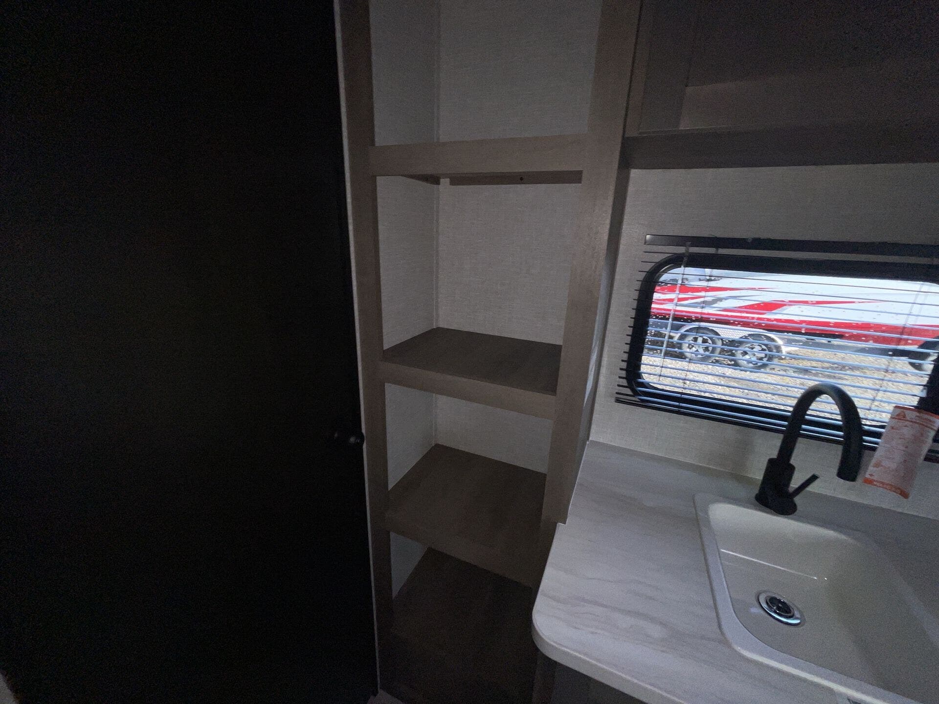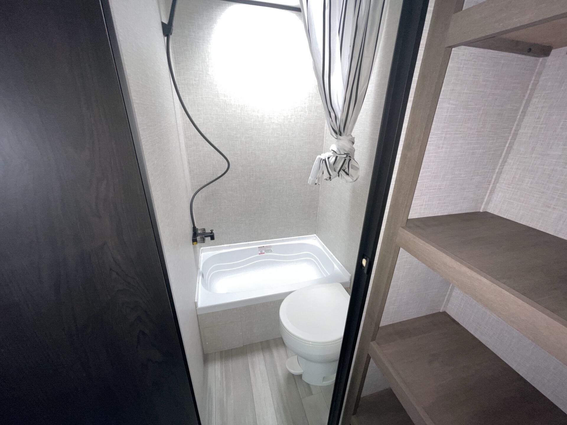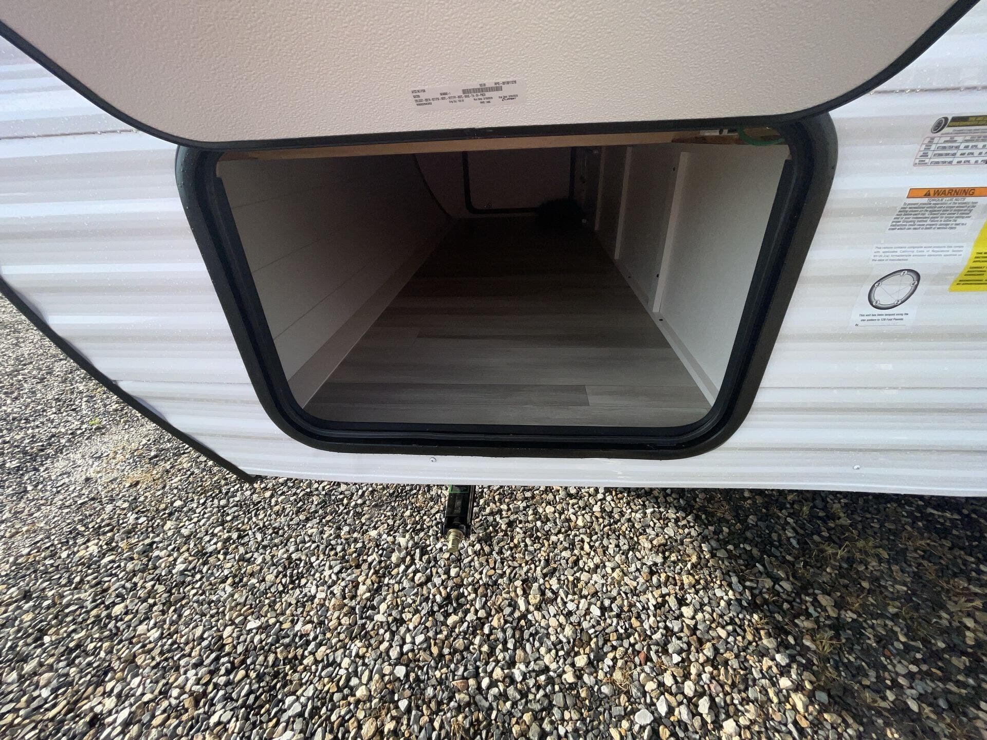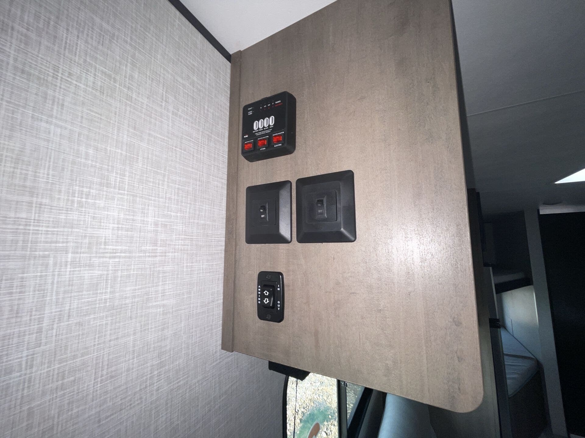 Inside, you’ll find thoughtful touches that make life on the road more enjoyable. The fully equipped kitchen includes a 10 cu. ft. refrigerator, a microwave, a two-burner cooktop, and ample counter space for meal prep. Residential vinyl flooring, LED lighting, and durable pressed membrane countertops add a modern, easy-to-clean feel, while plenty of storage compartments ensure that everyone’s gear has a place. Plus, the powerful A/C and furnace system keep you comfortable in all seasons.