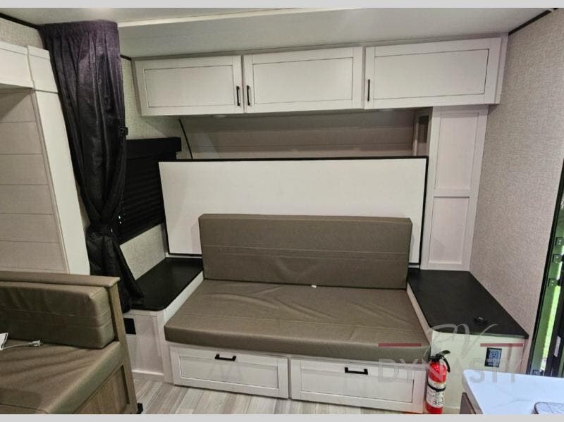 This travel trailer has everything the whole family will need for a comfortable camping trip! The kiddos can sleep on the set of double-size bunk beds, and you can sleep on the front 60" x 76" Murphy bed once converted from the sofa. You could even transform the U-shaped dinette slide into an extra sleeping space when you aren't using it to enjoy a meal prepared with the two burner range. There is even an outside kitchen with a refrigerator to enjoy a cold beverage while you cook dinner and watch the kids play a game of catch. After a fun day at the beach, head to the rear corner bathroom and wash the sand out of your hair in the tub/shower!