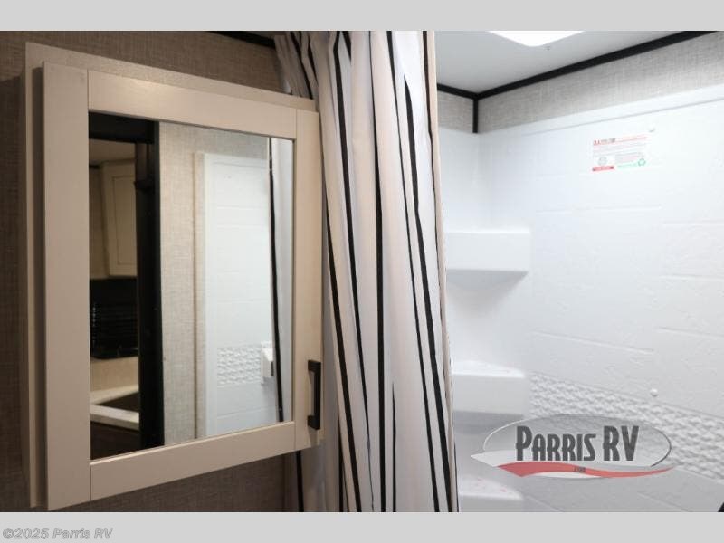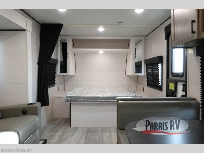 Each camping trip in this travel trailer is sure to bring great memories. You will love having your own bedroom up front with a walk-around bed and dual wardrobes to keep your things organized. The privacy curtain here will be appreciated if you have a guest or two sleeping over on the booth dinette. You'll find theater seating with tables within the large slide out, along with a three burner cooktop and 10 cu. ft. 12V refrigerator. A spacious pantry lets you pack snacks for the whole weekend, and the full bath will keep everyone squeaky clean!