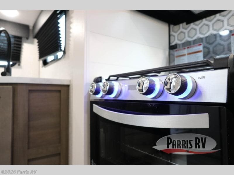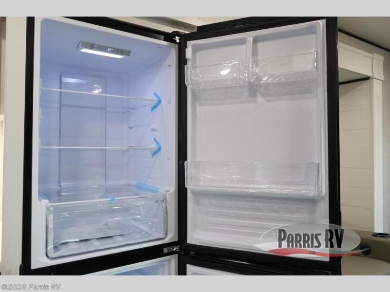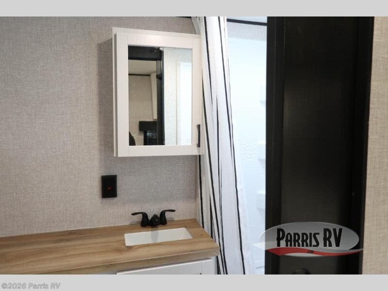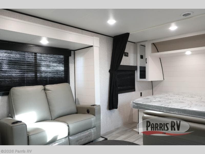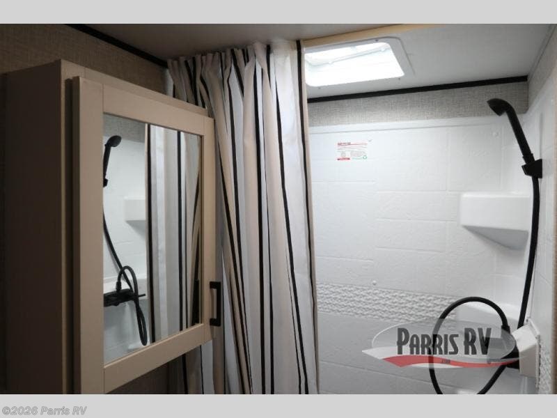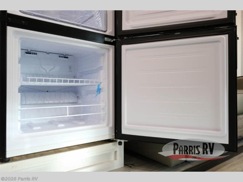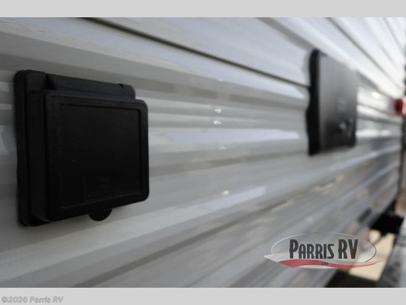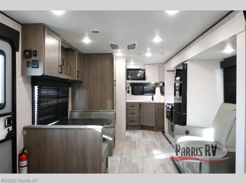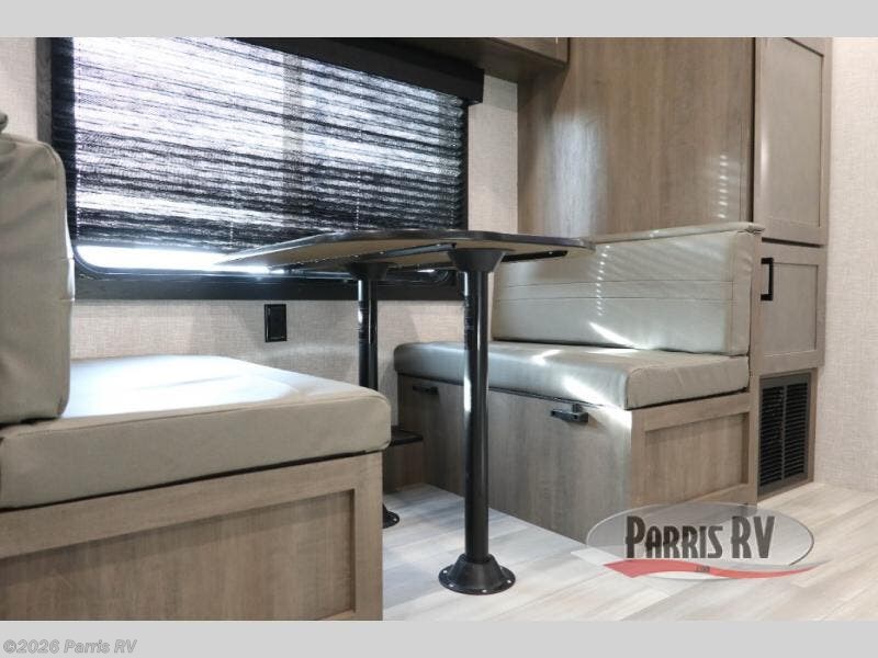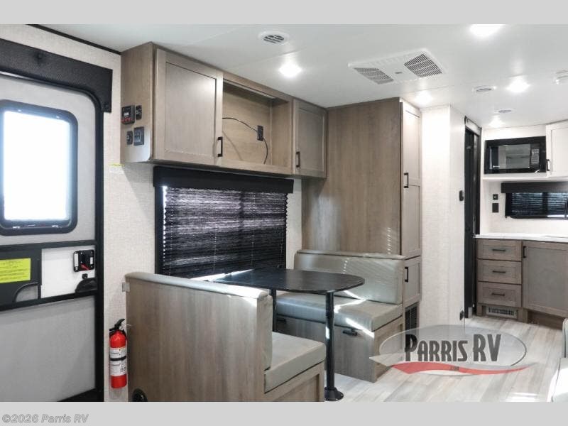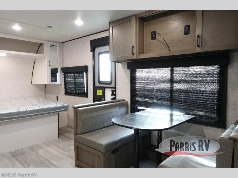 Each camping trip in this travel trailer is sure to bring great memories. You will love having your own bedroom up front with a walk-around bed and dual wardrobes to keep your things organized. The privacy curtain here will be appreciated if you have a guest or two sleeping over on the booth dinette. You'll find theater seating with tables within the large slide out, along with a three burner cooktop and 10 cu. ft. 12V refrigerator. A spacious pantry lets you pack snacks for the whole weekend, and the full bath will keep everyone squeaky clean!