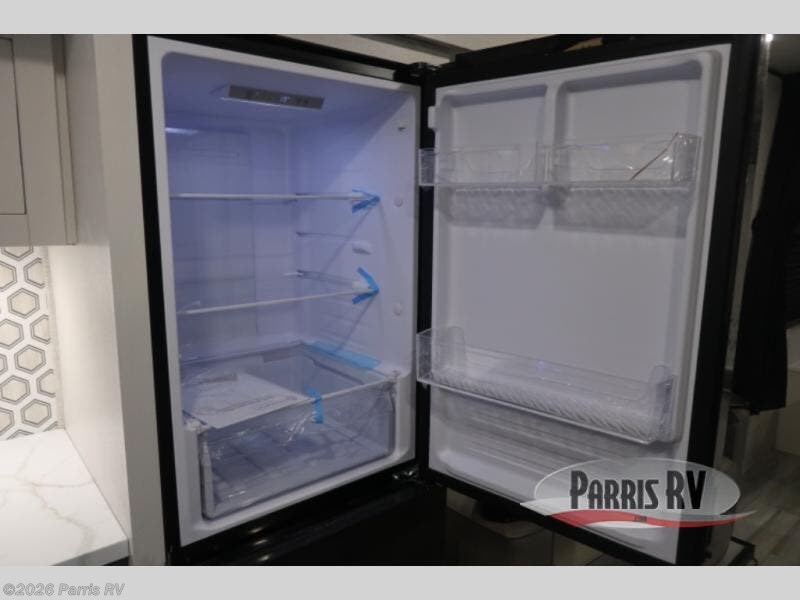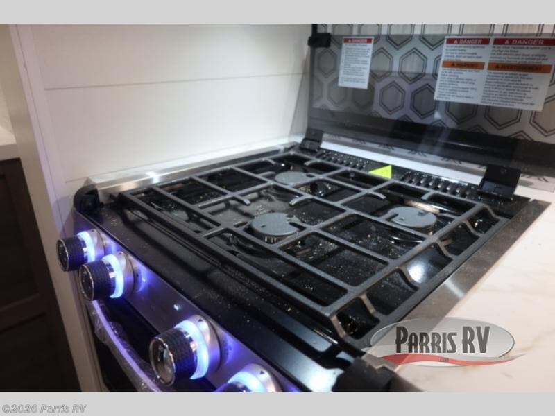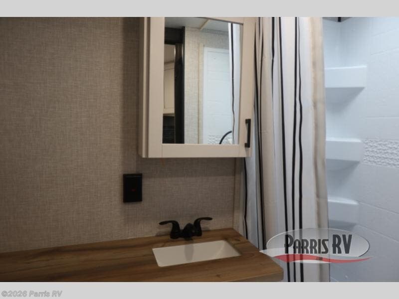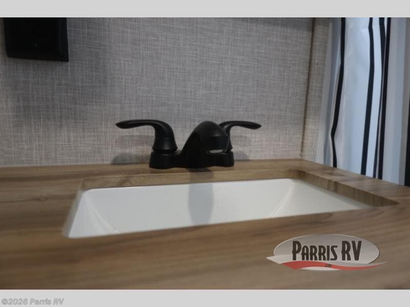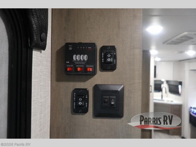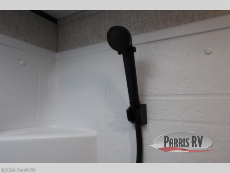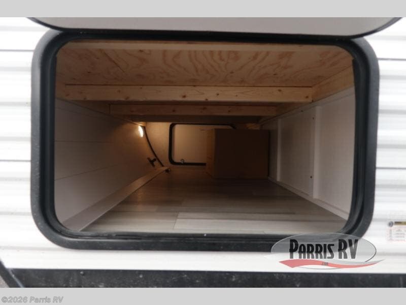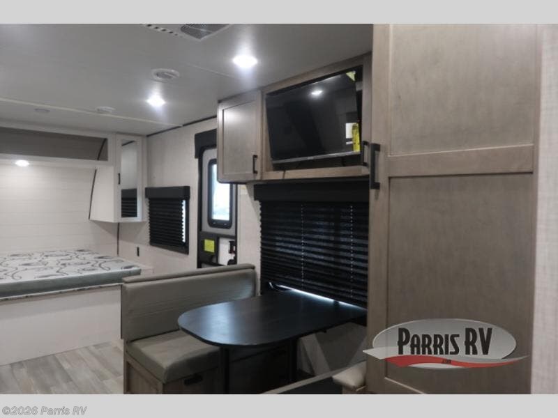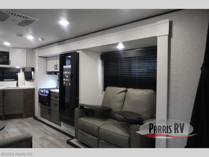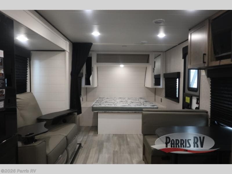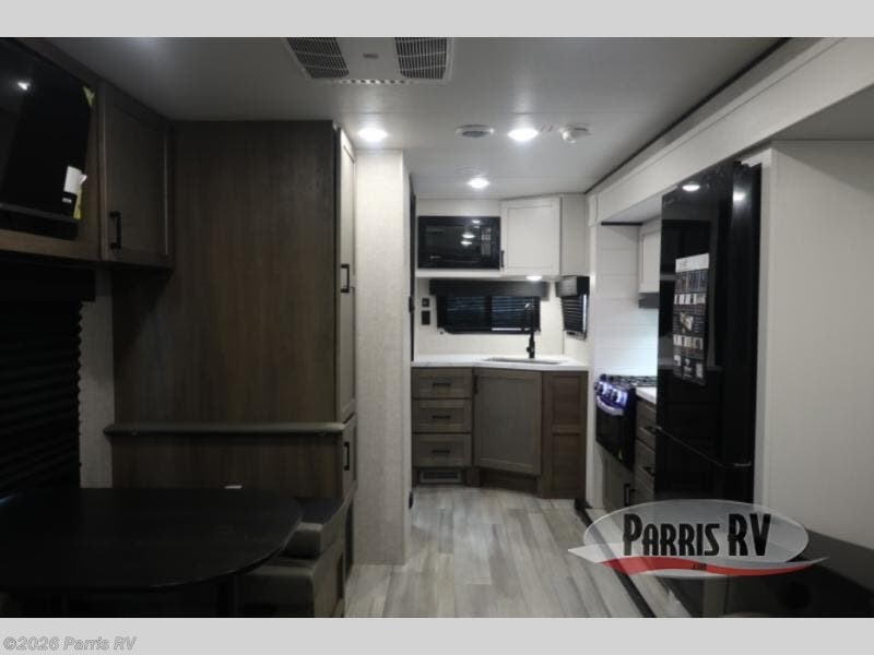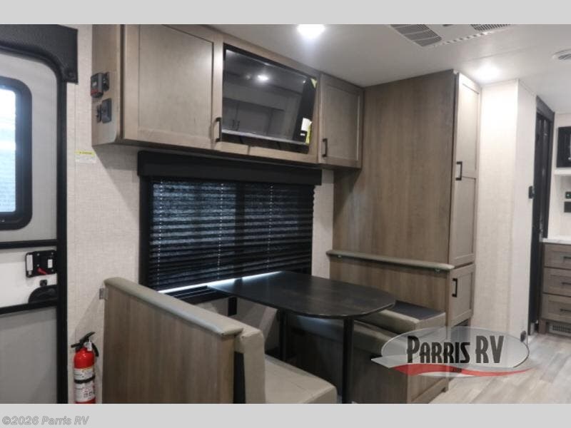 Each camping trip in this travel trailer is sure to bring great memories. You will love having your own bedroom up front with a walk-around bed and dual wardrobes to keep your things organized. The privacy curtain here will be appreciated if you have a guest or two sleeping over on the booth dinette. You'll find theater seating with tables within the large slide out, along with a three burner cooktop and 10 cu. ft. 12V refrigerator. A spacious pantry lets you pack snacks for the whole weekend, and the full bath will keep everyone squeaky clean!