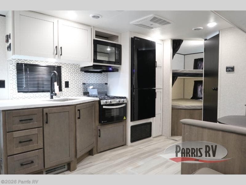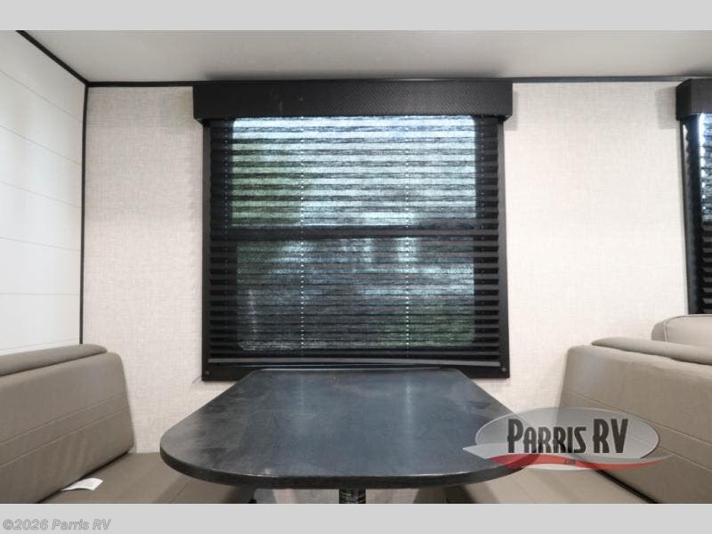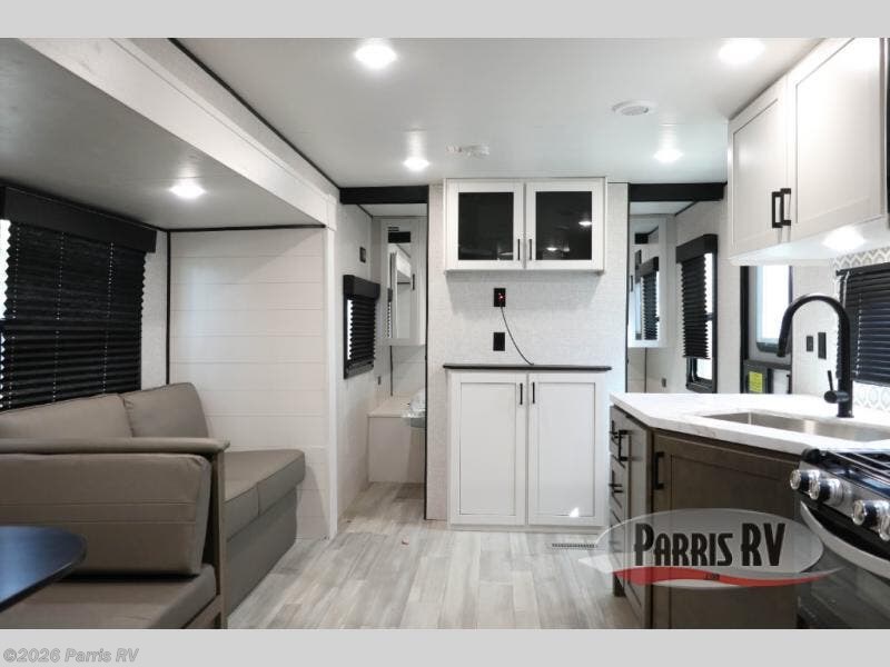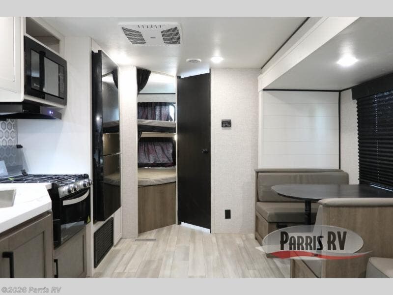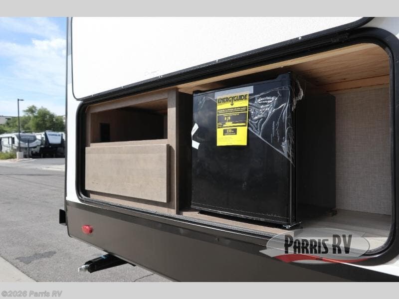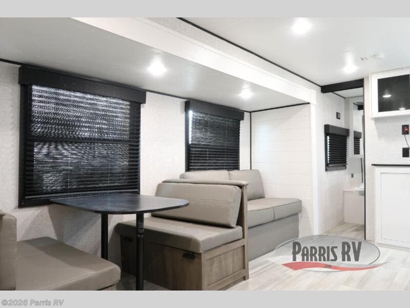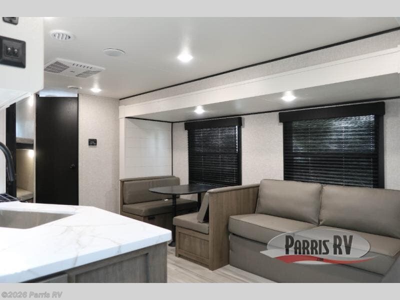 You're going to love every minute spent in this spacious travel trailer. The booth dinette and jack-knife sofa within the large slide out will be perfect for meal times, relaxing, and additional sleeping space. Add the optional Smart TV to the entertainment center and you're set up for movie night! This model includes an outside kitchen with a griddle and a refrigerator for cold drinks, plus indoor appliances if the rain has ruined your plans for the day. You will enjoy your own bedroom up front with space-saving sliding doors and two wardrobes for your clothes.